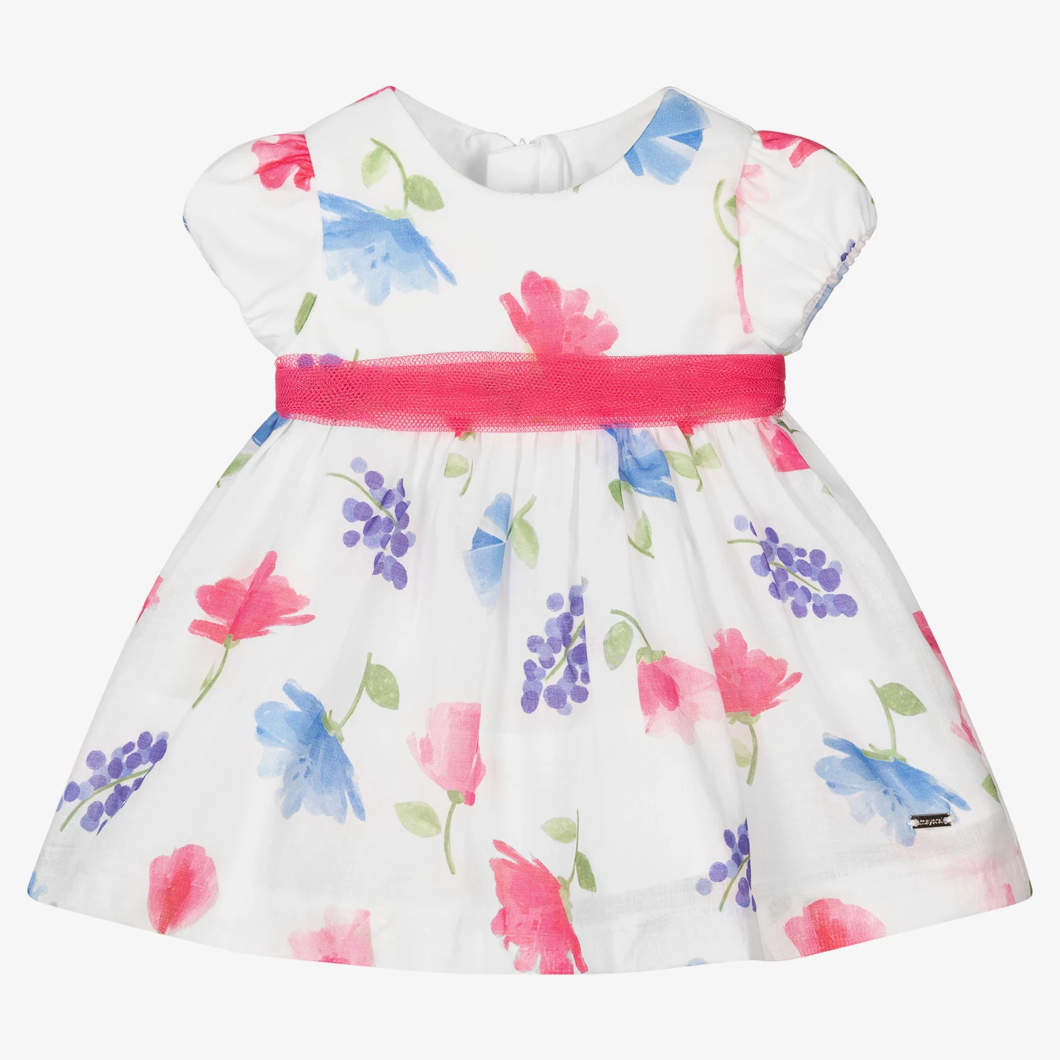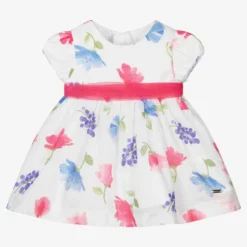 White dress set for baby girls by Mayoral Newborn, made in soft, sheer lightweight cotton, with a pretty pink and blue floral pattern. Fully lined, the dress has a pink tulle band around the waist and a zip fastening on the back. Matching knickers complete the set.