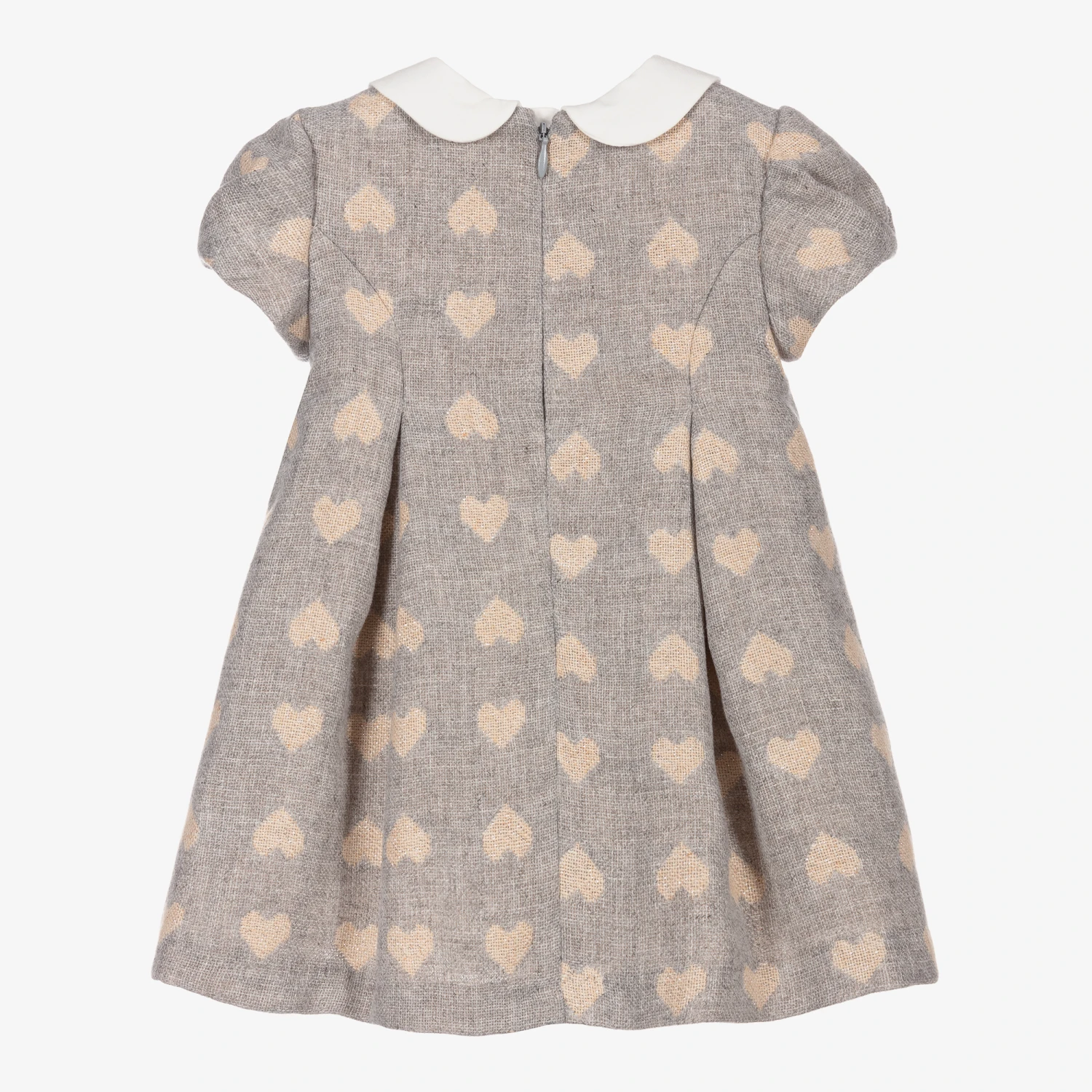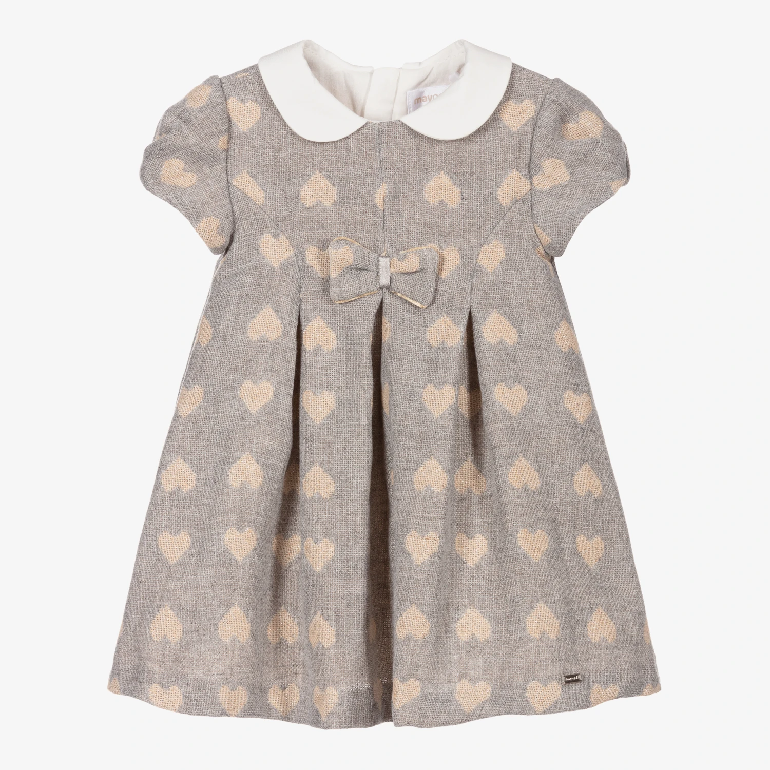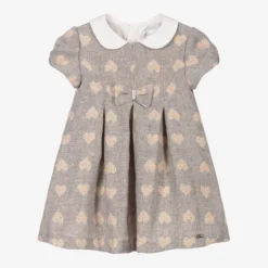 Sweet grey dress by Mayoral Newborn, with sparkly beige hearts in the weave. Made in a viscose blend, it has a white collar, pretty puffed sleeves and a bow on the front. Fully lined for comfort, it has a pleated skirt.