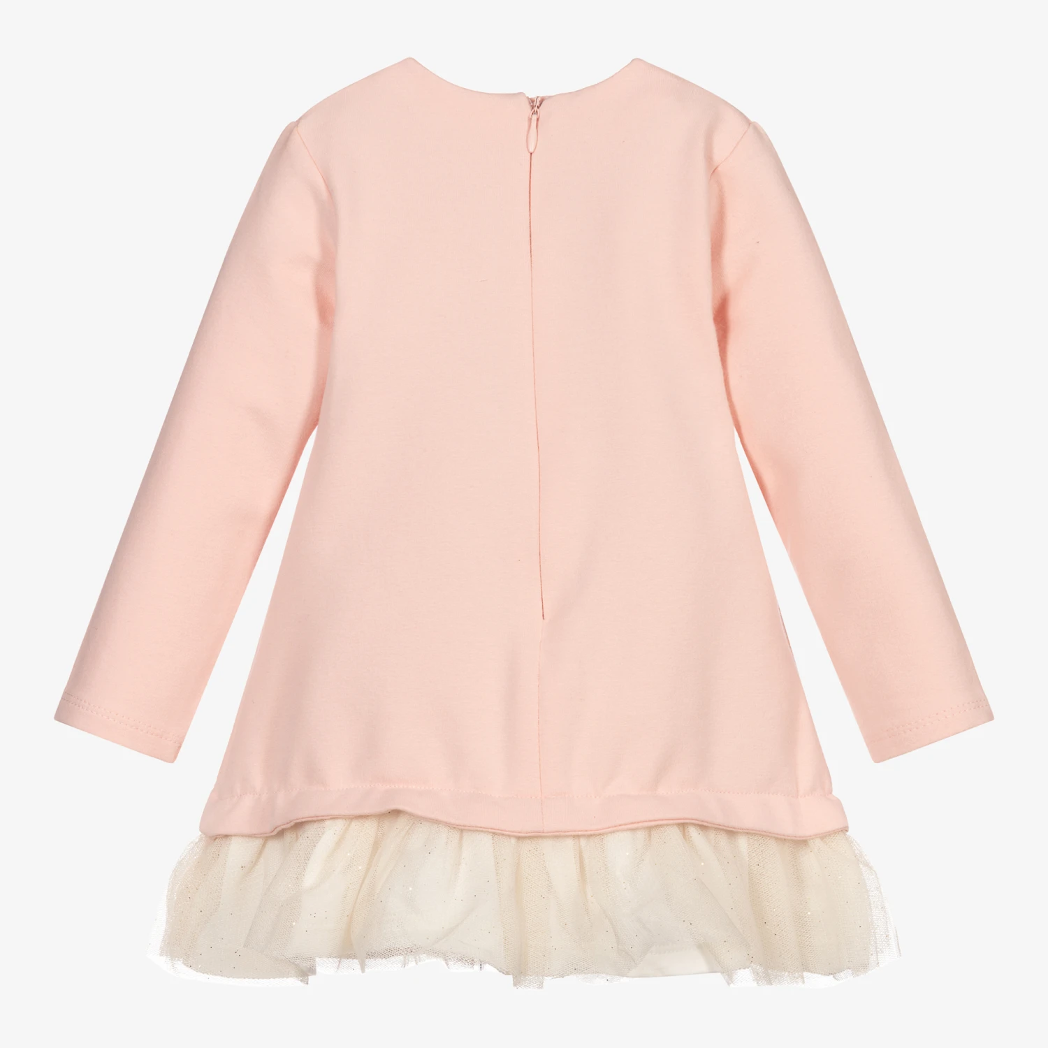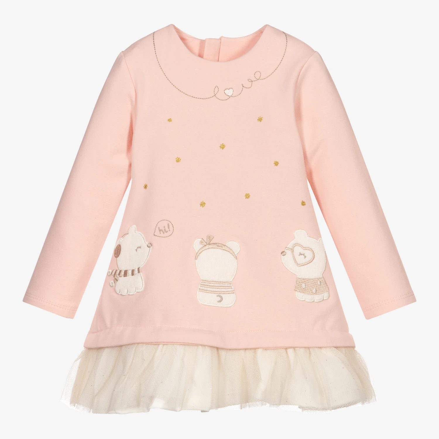 Super cute pale pink dress for baby girls by Mayoral Newborn. Made in comfortable cotton jersey, it has an ivory tulle frill around the hem. ‘Love’ is embroidered around the neckline, with glittery gold stars and ivory towelling bears below.