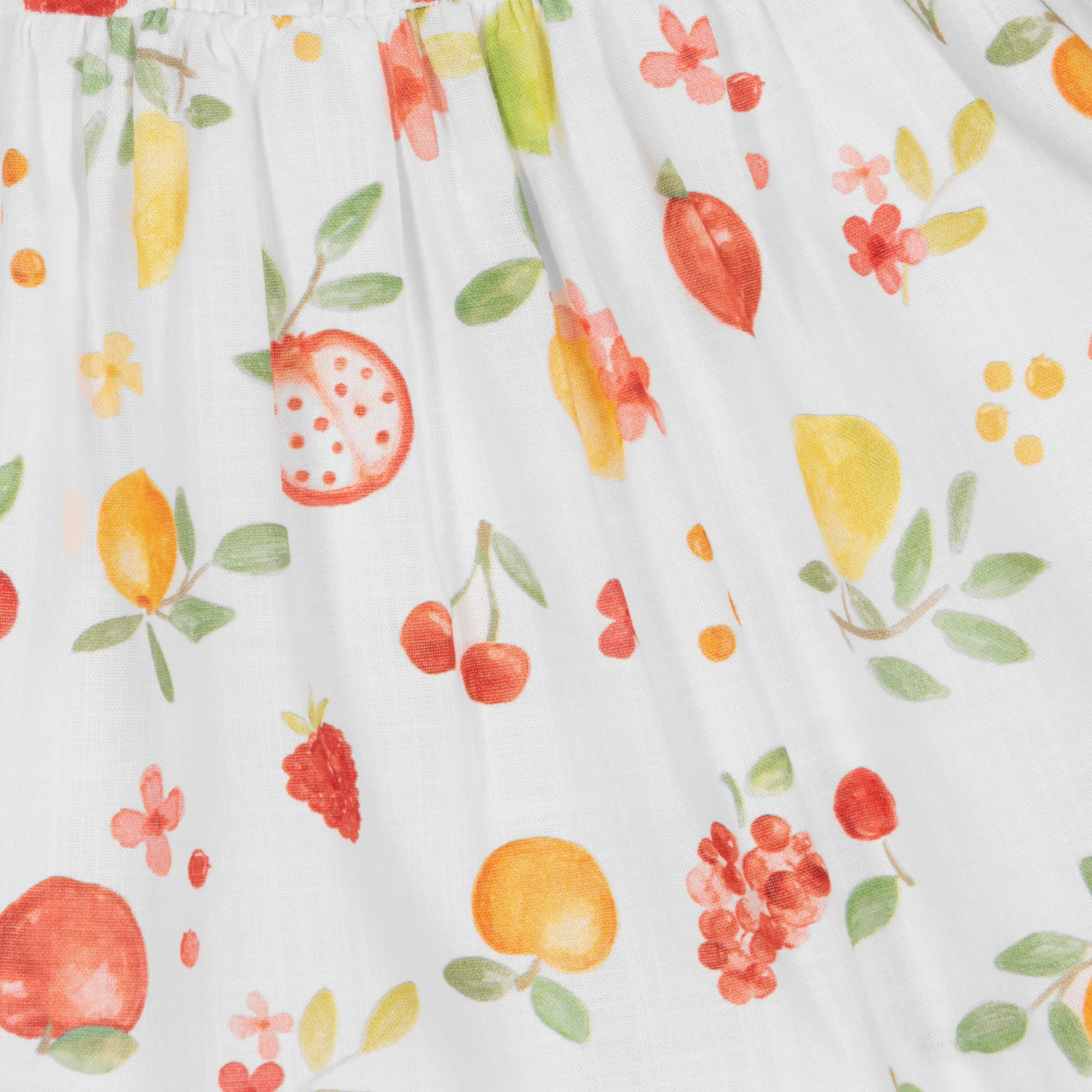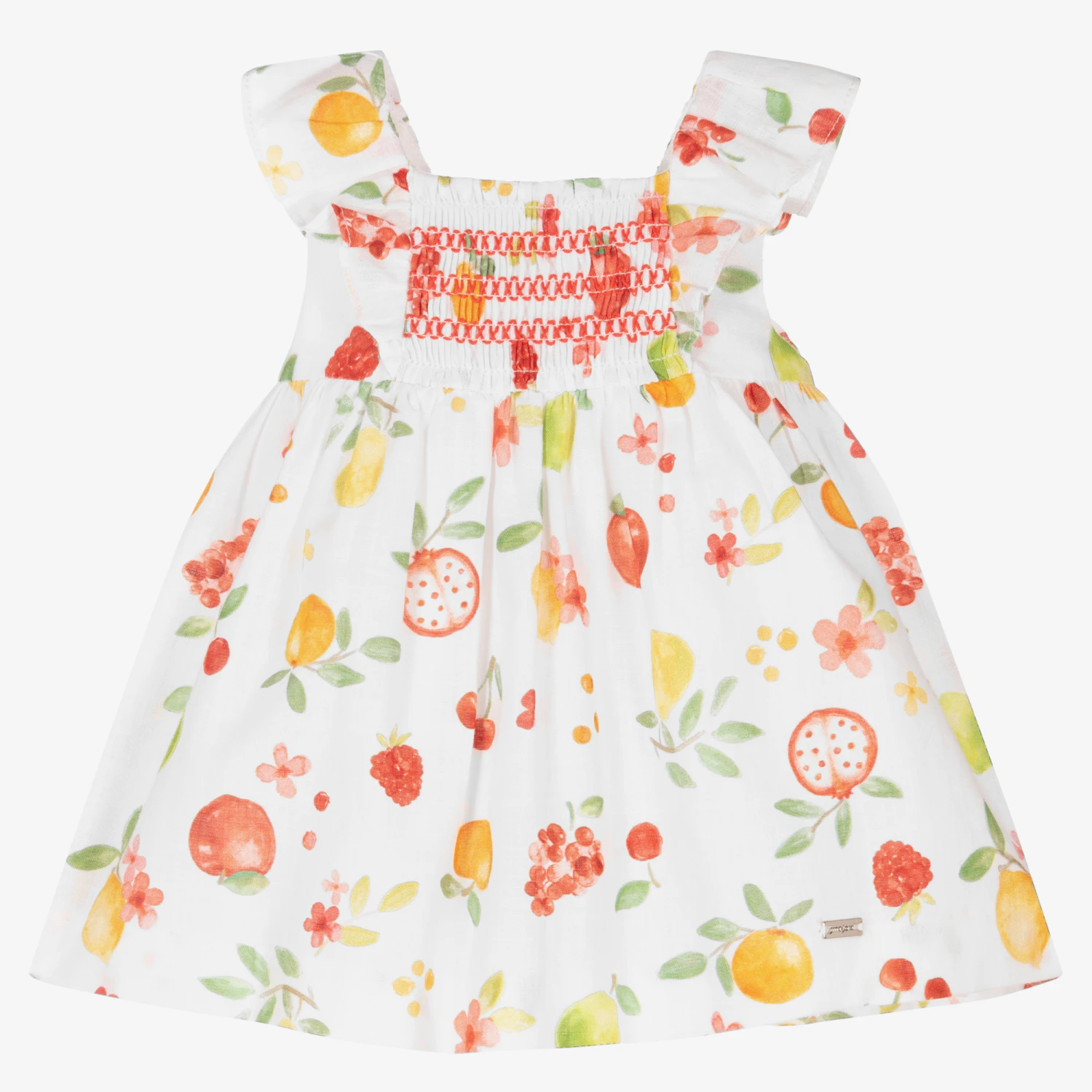 White dress for baby girls by Mayoral Newborn, made in soft, lightweight cotton. It has a red, green and yellow fruit pattern and pretty smocking on the bodice. It has a lightweight lining and sweet ruffles over the shoulders. There are button fastenings on the back.