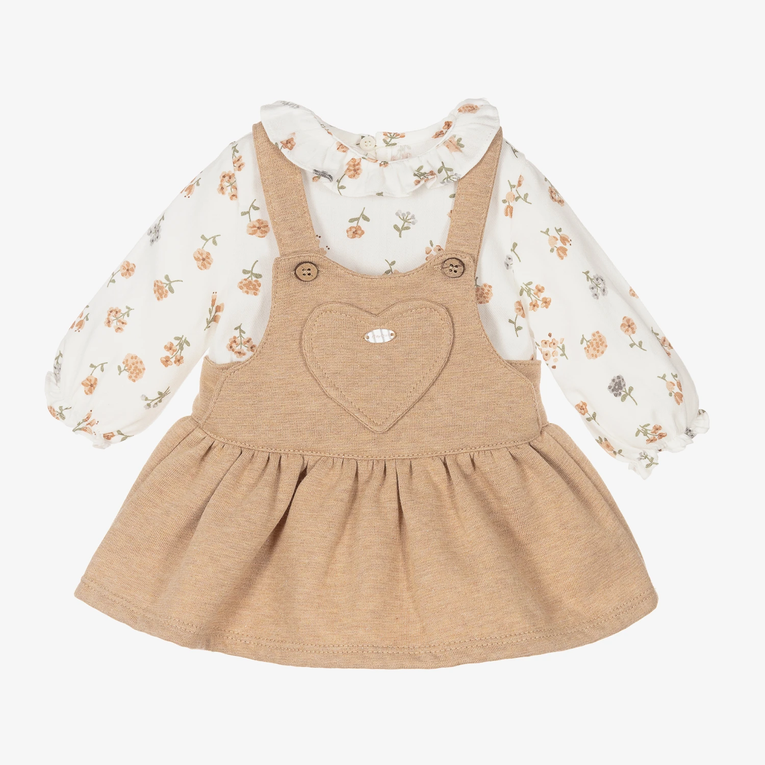 Pretty ivory blouse and beige pinafore dress set for baby girls from Mayoral Newborn, made with soft cotton. The blouse has a cute beige and grey floral print, with a ruffle collar and elasticated ruffled cuffs. The comfortable jersey pinafore dress has a cosy brushed feel inside. It has adjustable, button-fastening straps and a beige heart appliqué pocket and logo detail on the front. The pinafore dress contains sustainable cotton.