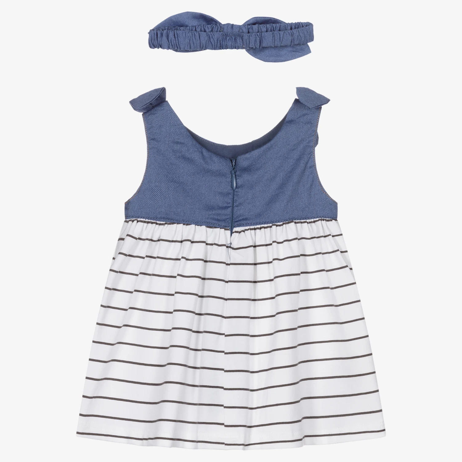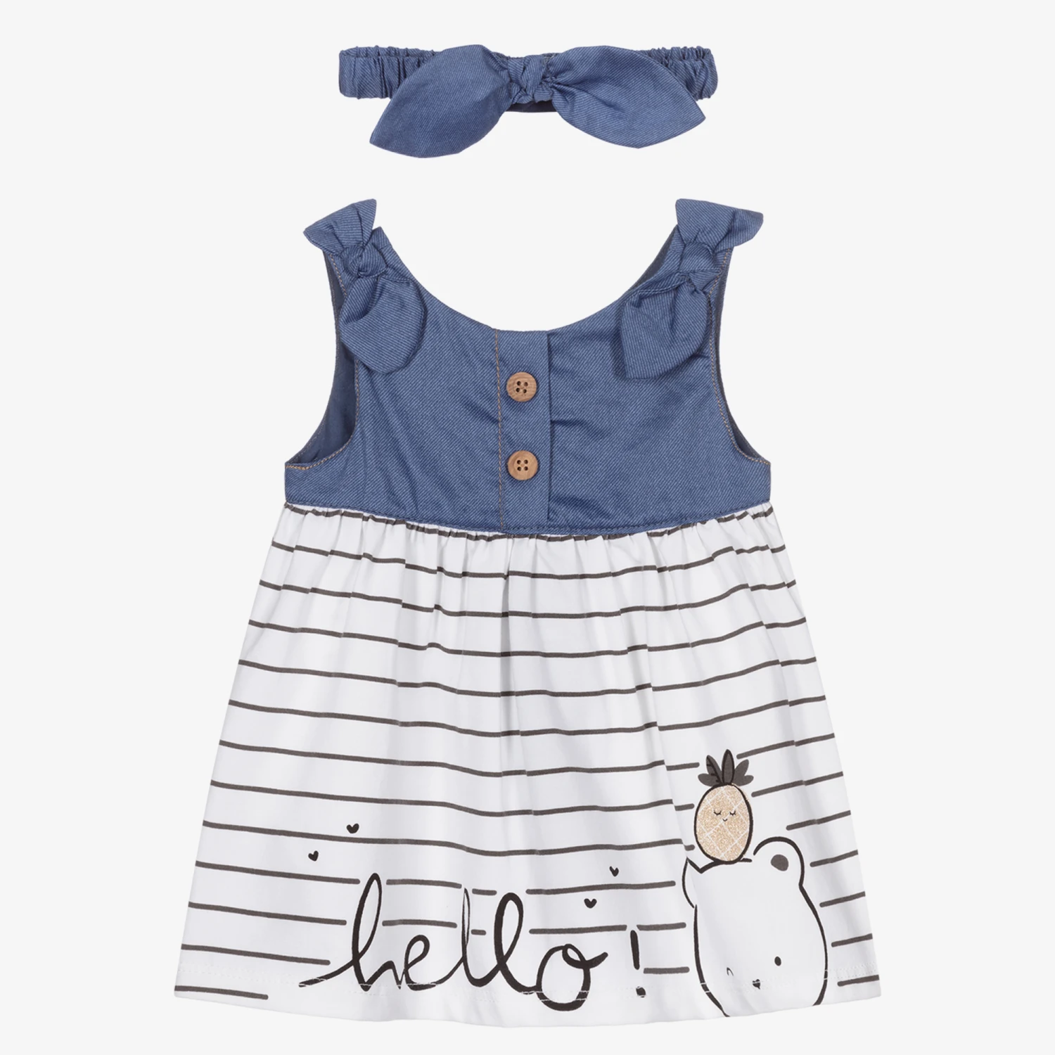 Sweet dress and headband set for baby girls by Mayoral Newborn. The bodice is made in soft blue cotton with a denim print effect. It has fixed bows on the shoulders and button trims on the bodice. The ivory and grey striped skirt is made in soft and stretchy cotton jersey, with a teddy bear and sparkly gold pineapple print. The matching blue headband is elasticated with a bow trim on the front.