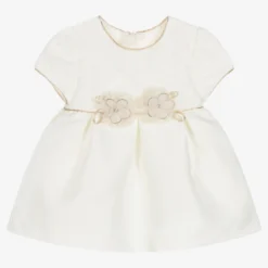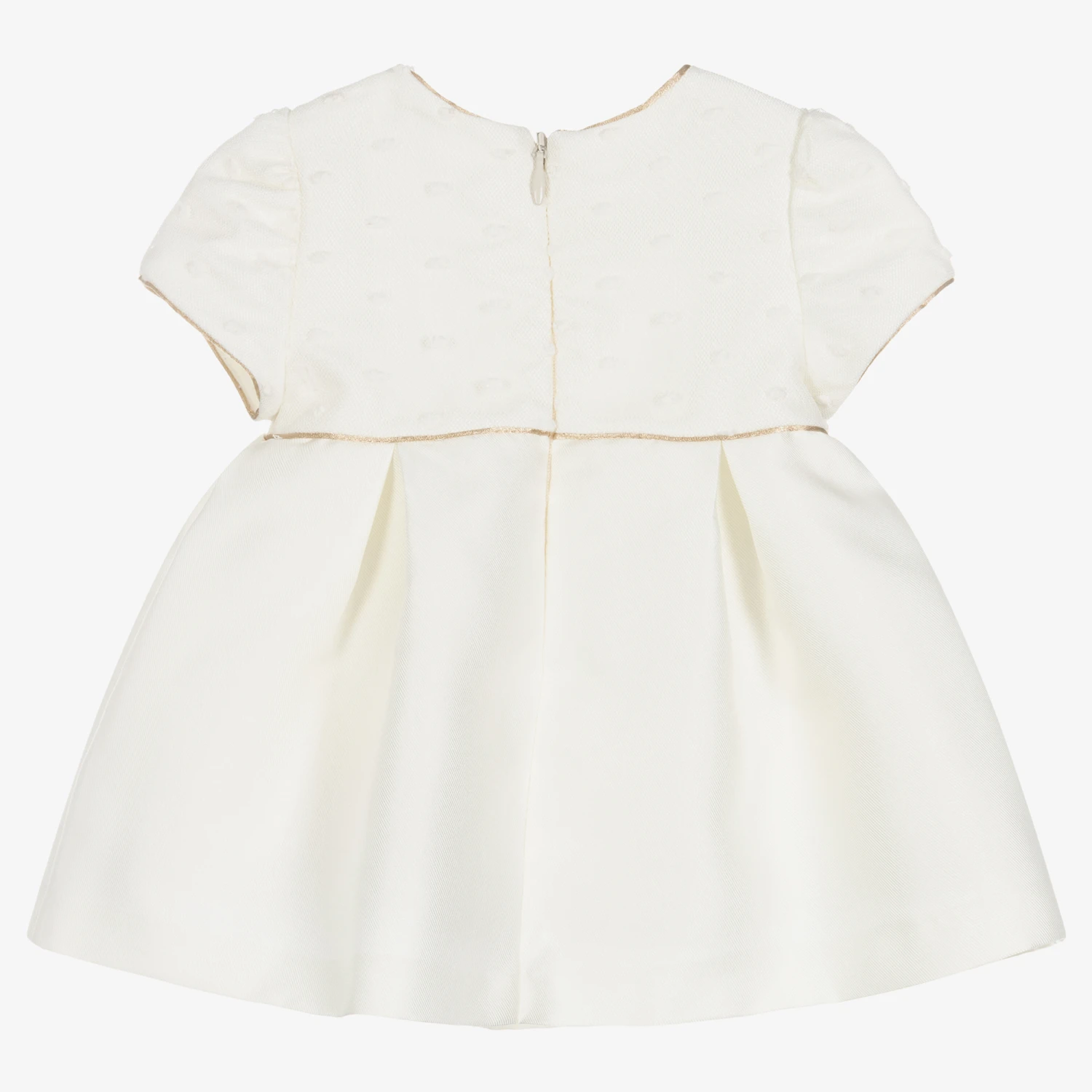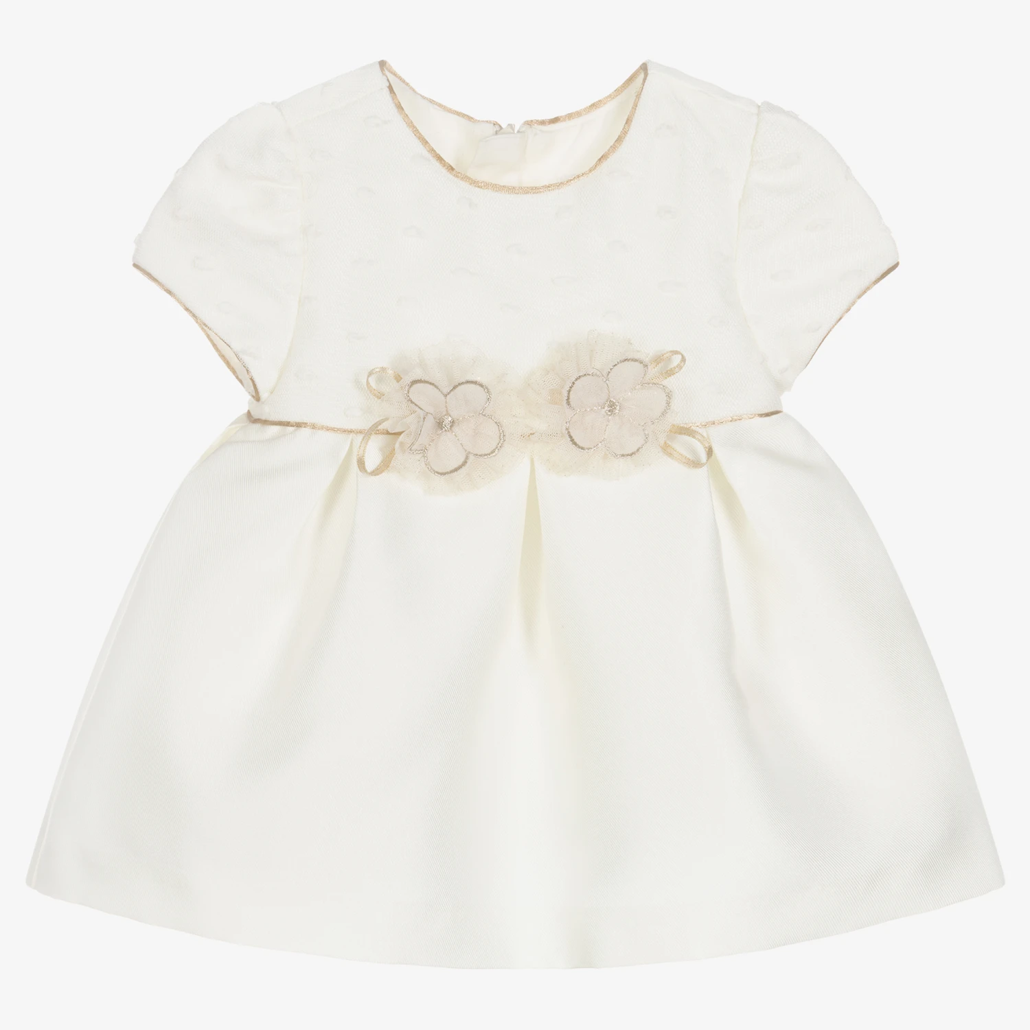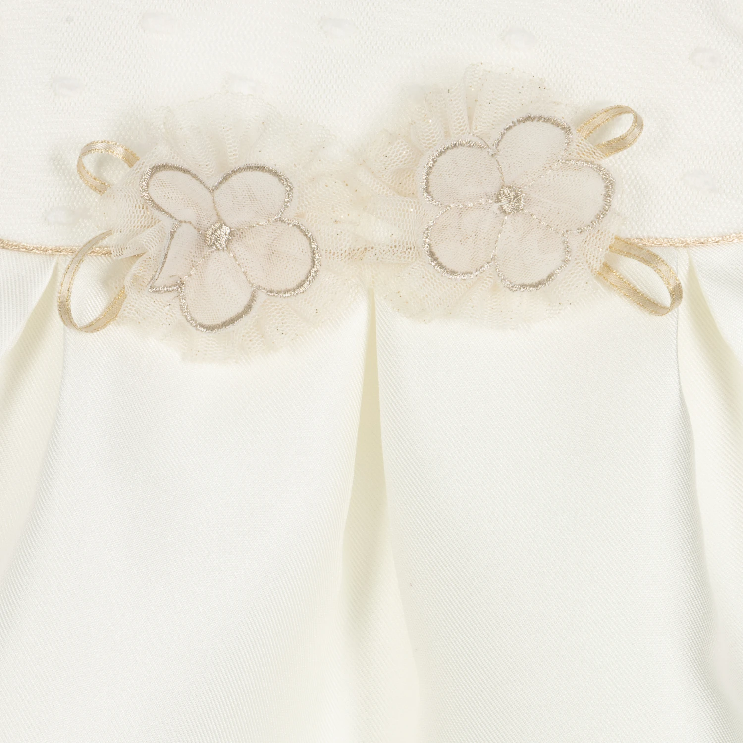 Adorable ivory ceremony dress for baby girls by Mayoral Newborn, made in mid-weight satin. The bodice has a delicate tulle overlay, patterned with woven spots. There are gold trims and lovely flower appliqués on the waist. Fastening with a zip on the back, it is lined with soft, lightweight cotton.