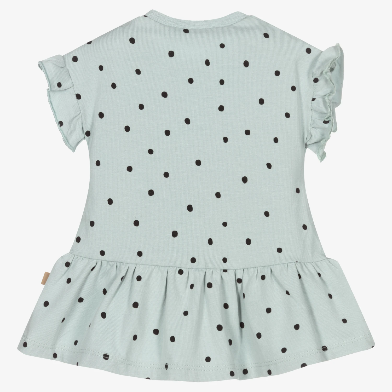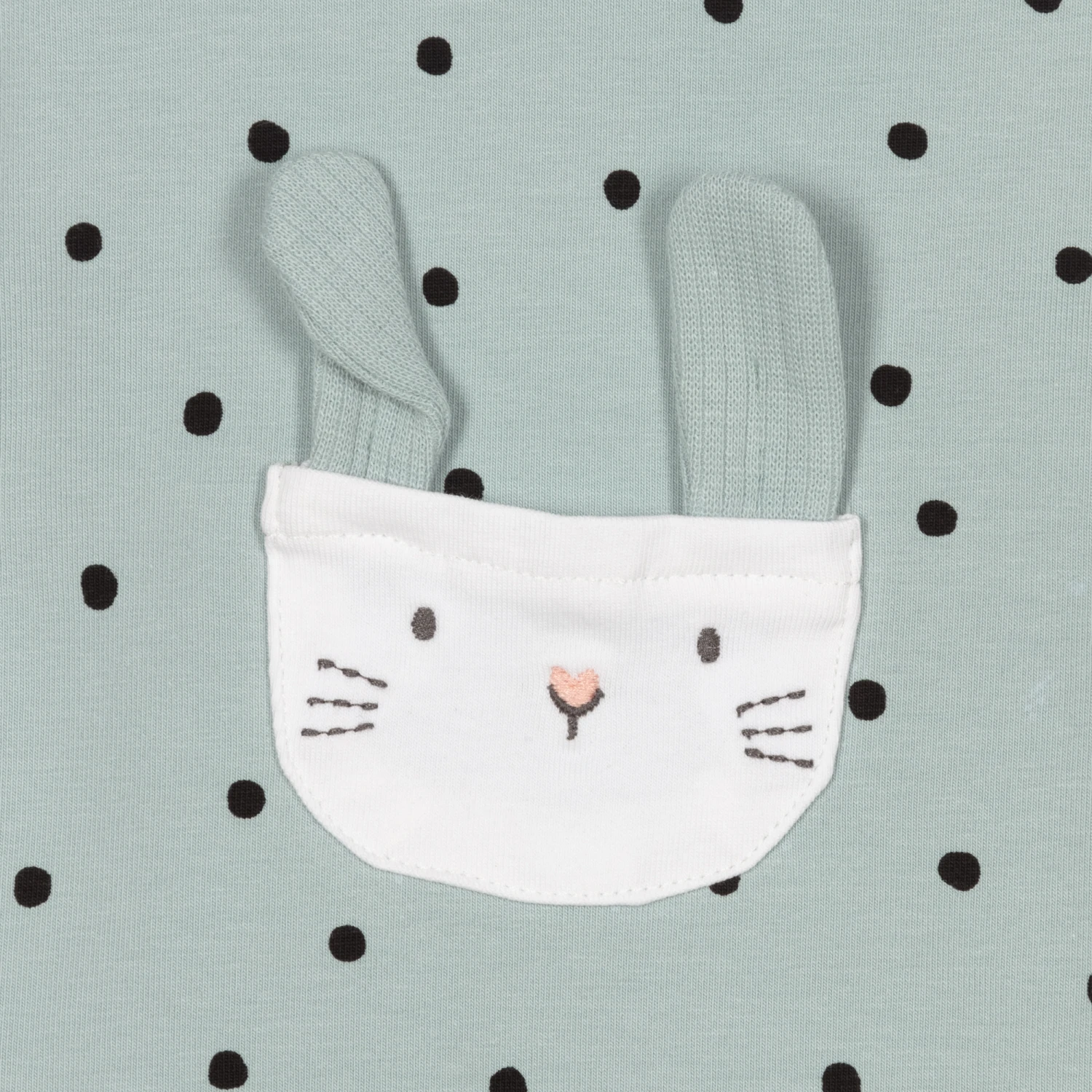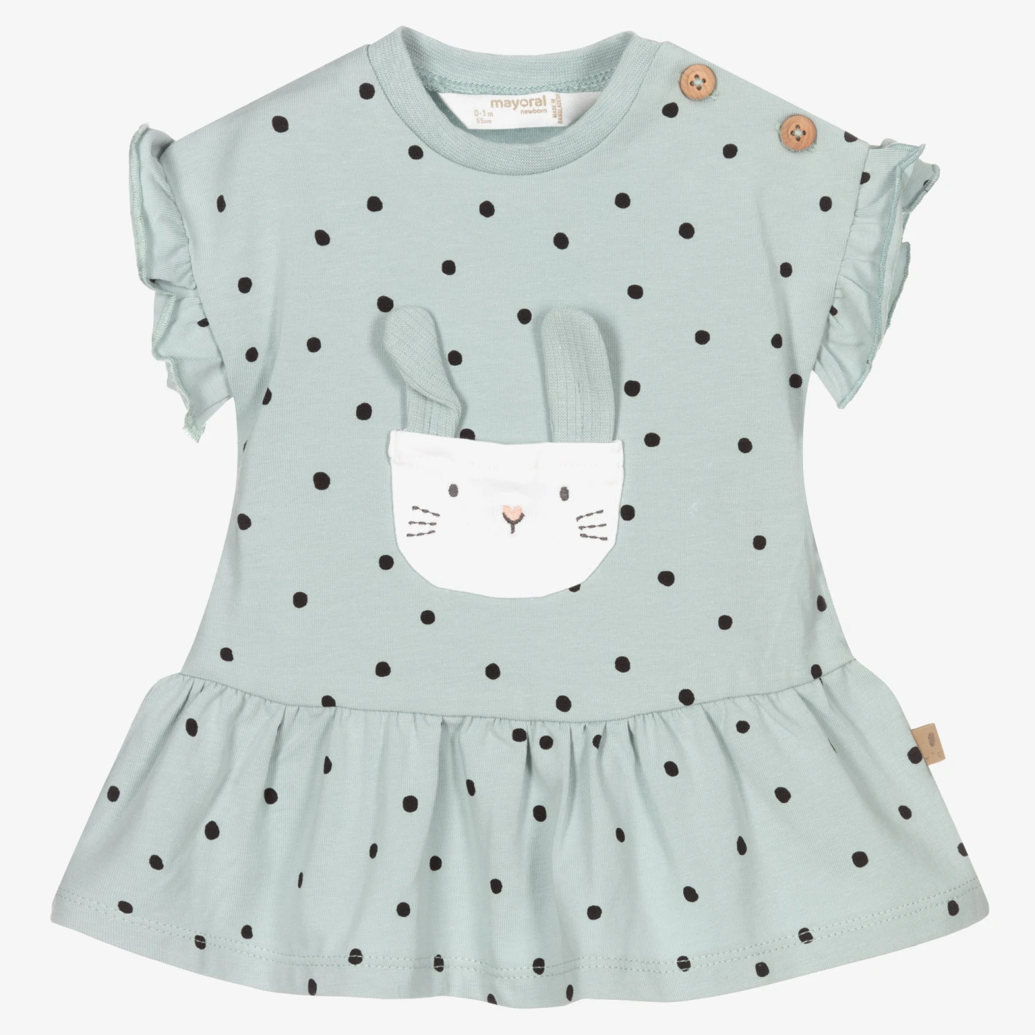 Baby girls mint green organic cotton dress by Mayoral Newborn. Soft and stretchy, it is made in comfortable jersey with a black polka dot print. There is a sweet rabbit-shaped front pocket with embroidered details and cute 3D ears. There are frilled sleeve cuffs and wooden buttons to fasten on one shoulder.