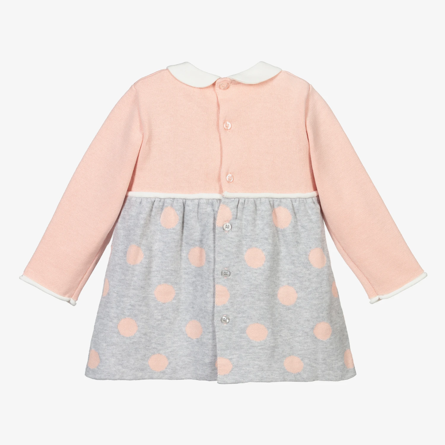 An adorable pink and grey dress for baby girls by Mayoral Newborn, finely knitted in soft organic cotton. It has a rounded collar, a knitted bow detail at the waist, and sweet pink polka dots on the skirt.