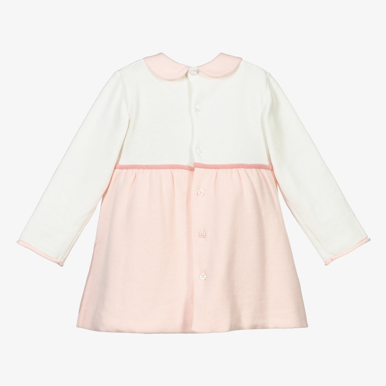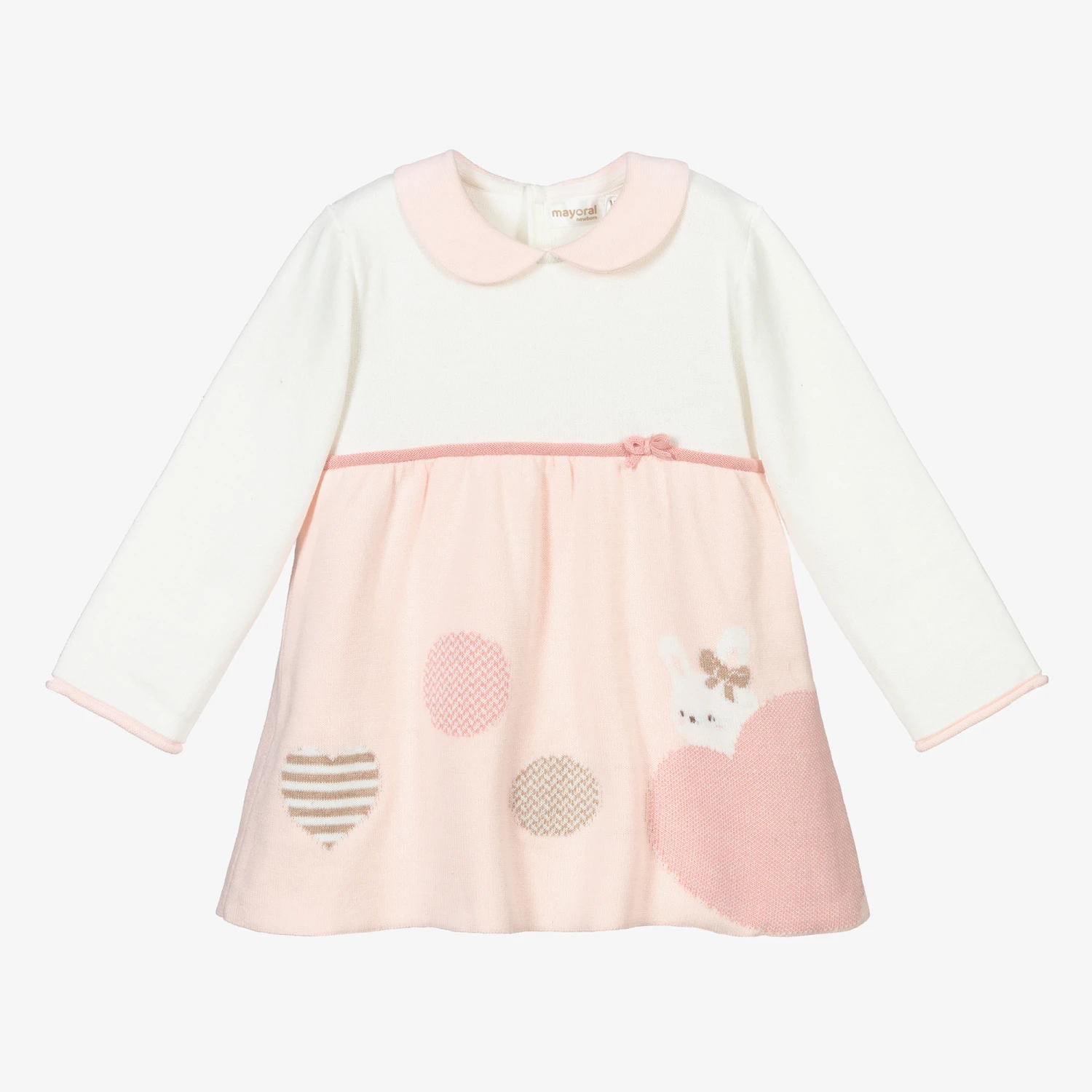 An adorable pink and ivory dress for baby girls by Mayoral Newborn, finely knitted in soft organic cotton. It has a rounded collar, a knitted bow detail at the waist, and sweet bunny and heart motifs in white, beige and pink.