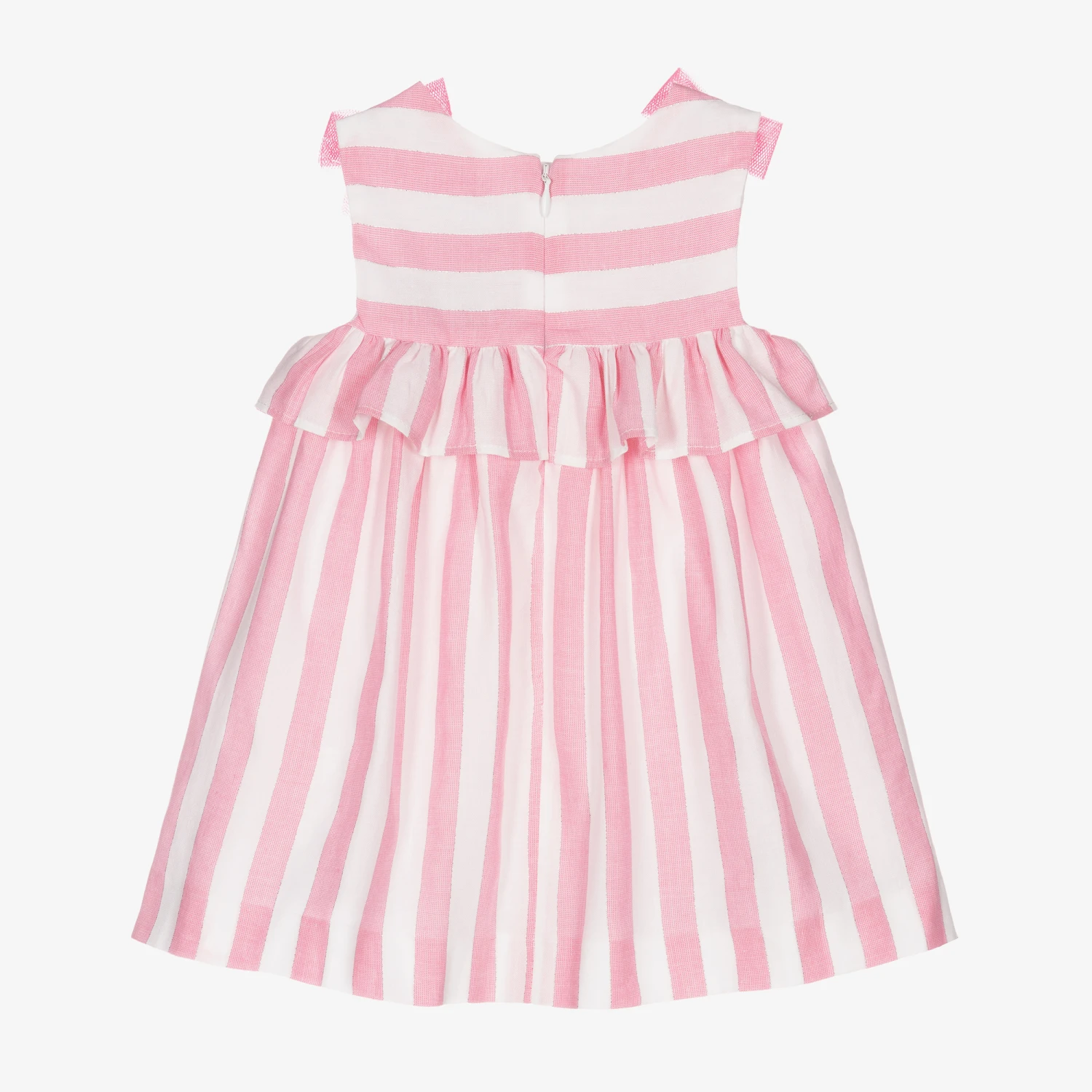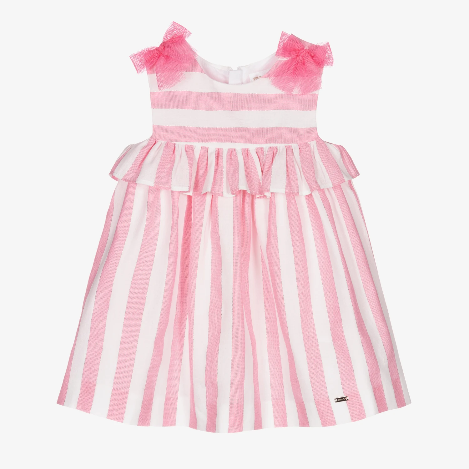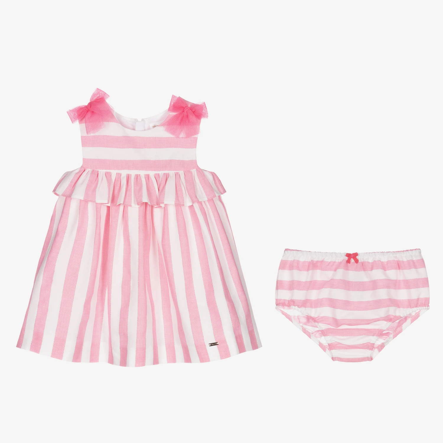 Pretty bubblegum pink and ivory striped dress set for baby girls by Mayoral Newborn, made in a lightweight linen and cotton blend. Fully lined, it has glittery silver threads and pink tulle bows on the shoulders. Matching knickers complete the set.