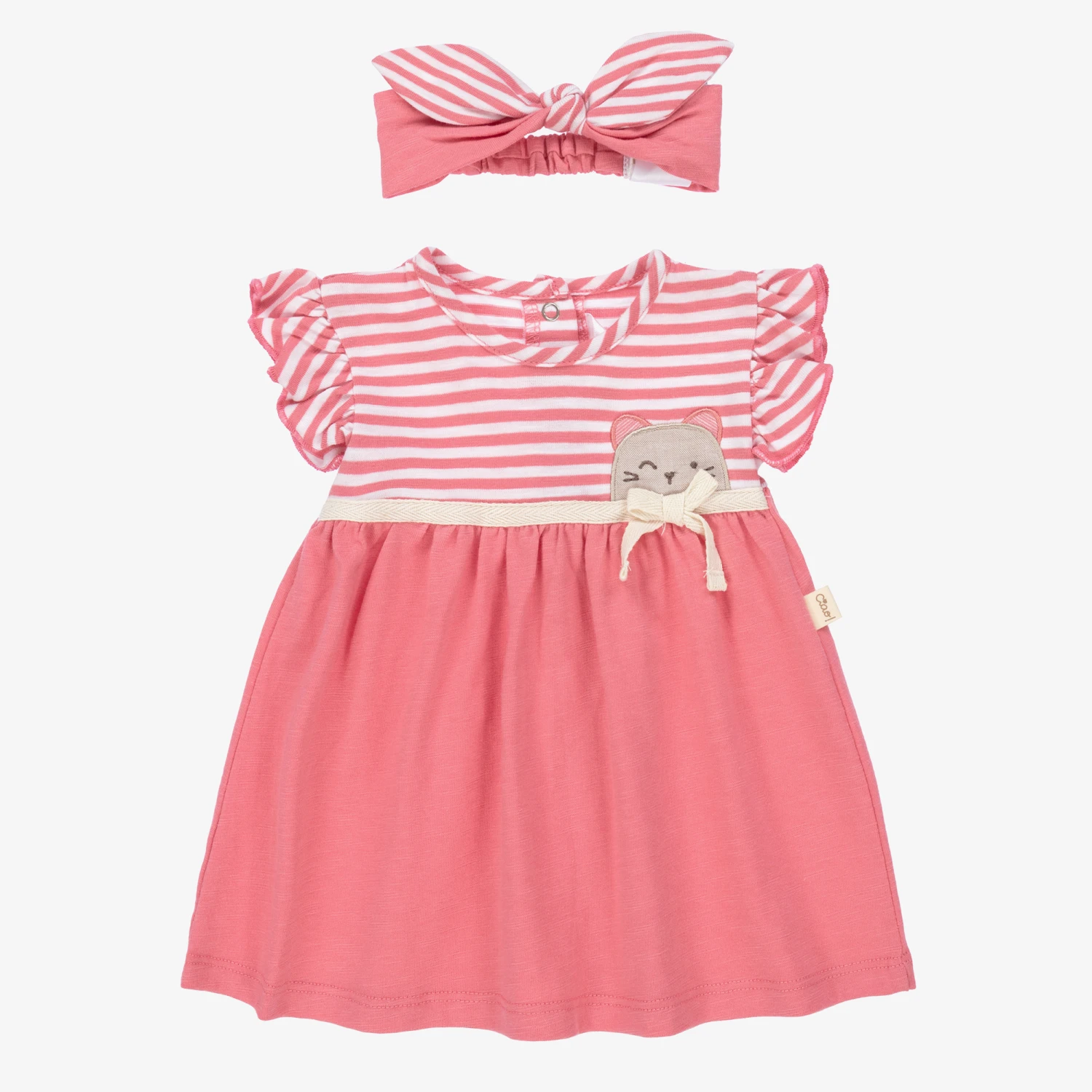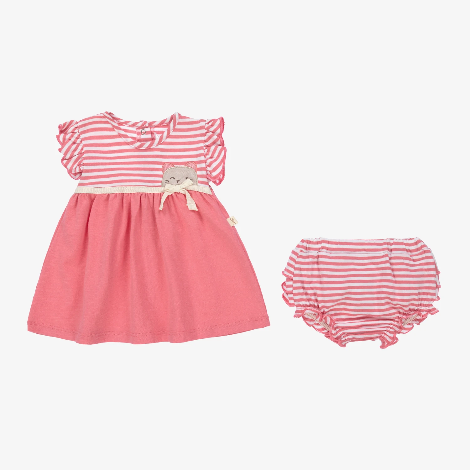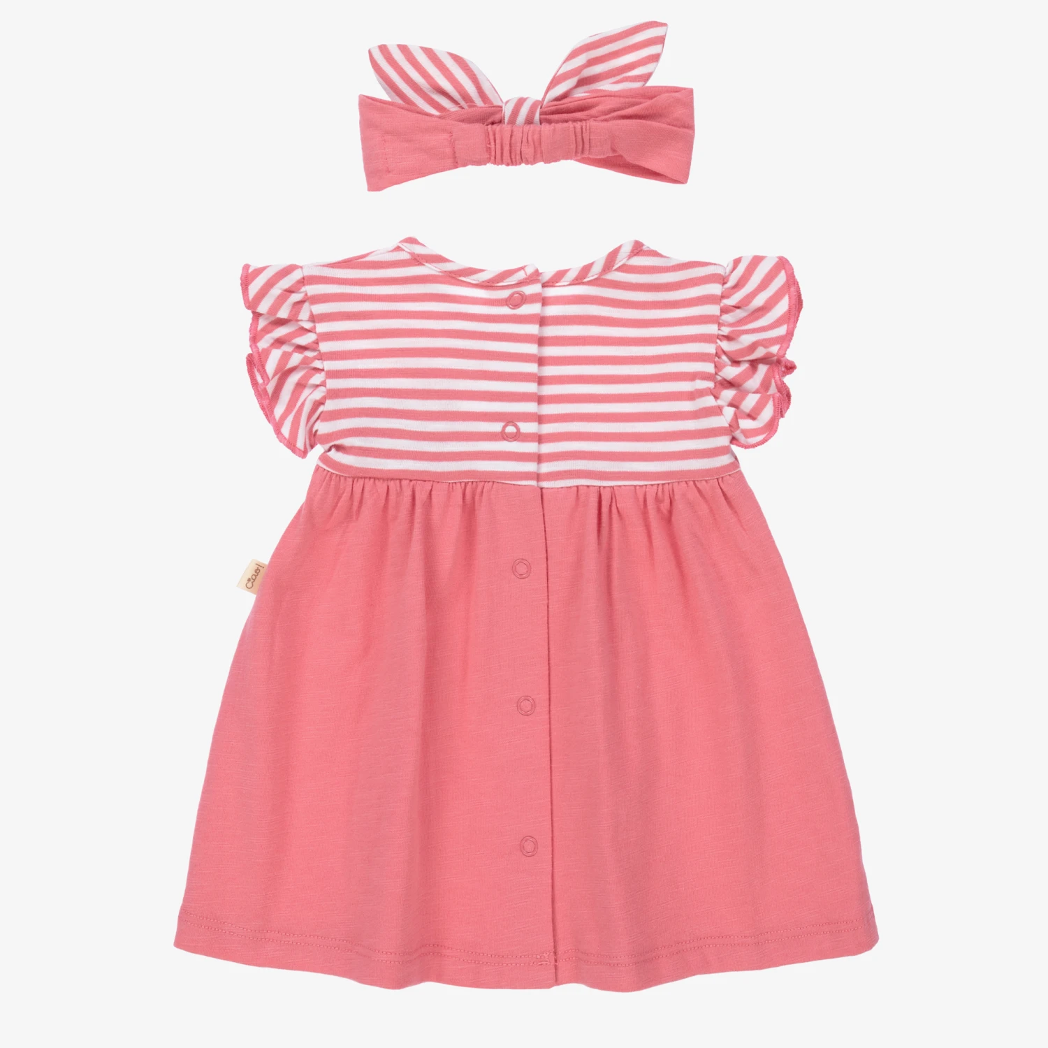 Pink and ivory stripe sustainable cotton dress set for baby girls by Mayoral Newborn, made with soft and stretchy jersey. The dress has frilled sleeve trims, an ivory bow and a sweet bunny rabbit appliqué in beige. The striped knickers have frills on the back and a stretchy waist. The bow headband is gently elasticated around the back.