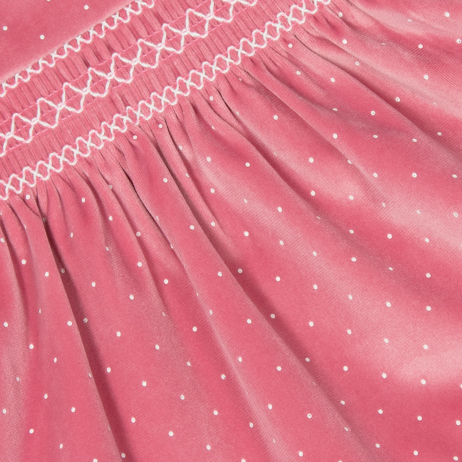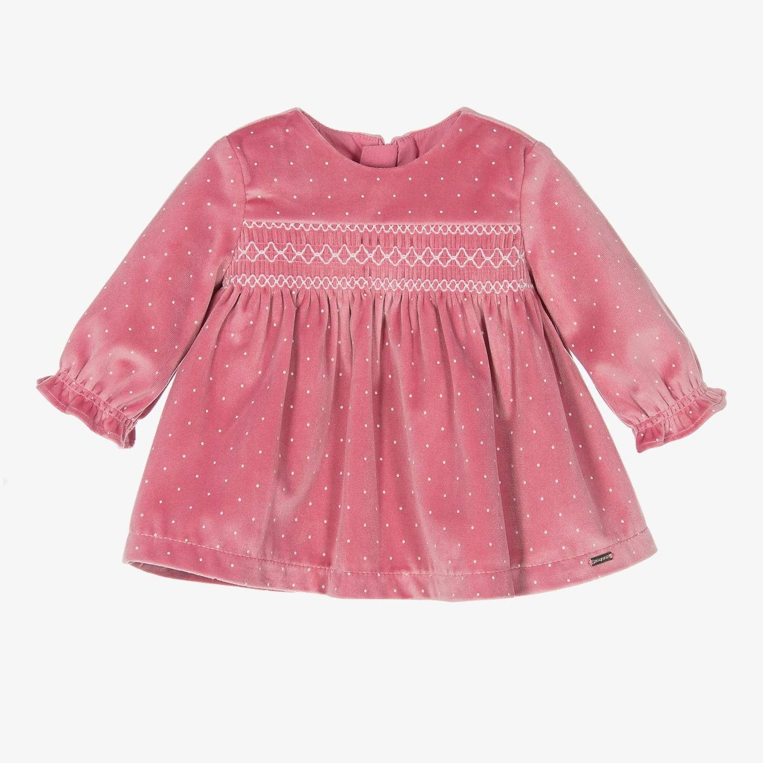 Beautiful pink dress for baby girls from Mayoral Newborn, made in sumptuous velvet with an ivory dot pattern. It has pretty ivory smocking across the front, elasticated ruffled cuffs and a metal logo tab on the hem. The dress has a lightweight cotton lining for comfort and fastens with a concealed zip on the back.