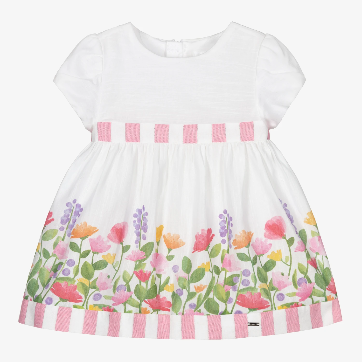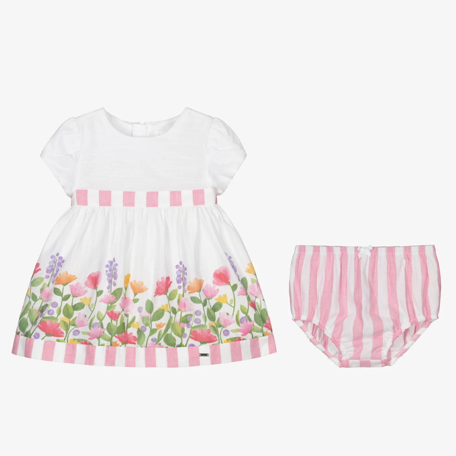 Pink and white dress set for baby girls by Mayoral Newborn, made in a blend of cotton and linen. The dress has a pretty pink, orange and green floral pattern and light pink and white striped trims, with silver threads. It has a lightweight lining, with a tulle trim for added volume. Matching pink and white striped knickers complete the set.