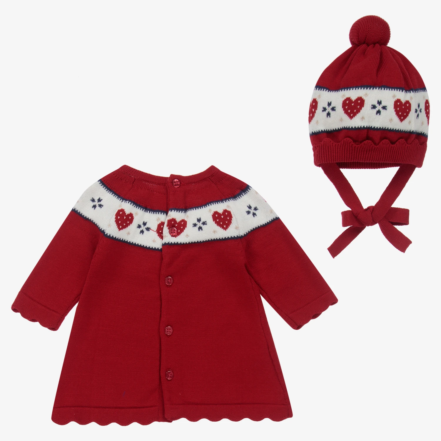 Cute red dress and pom-pom hat set for baby girls from Mayoral Newborn, knitted in soft sustainable cotton. Both pieces have lovely scalloped trim and a knitted white panel, with red hearts, snowflakes and navy blue edging. Comfortable and easy to wear, the dress fastens with buttons on the back and the hat has ties to fasten under the chin.