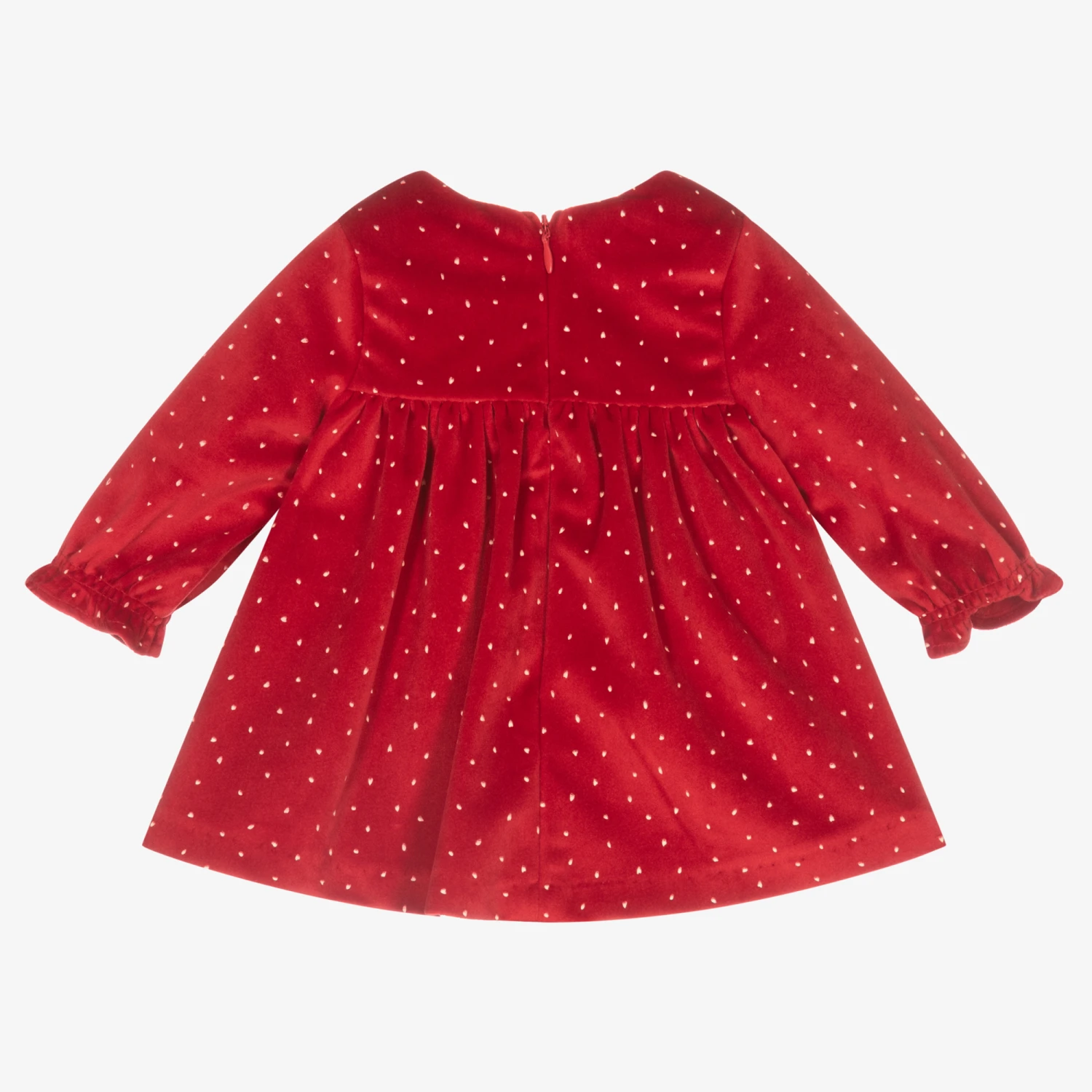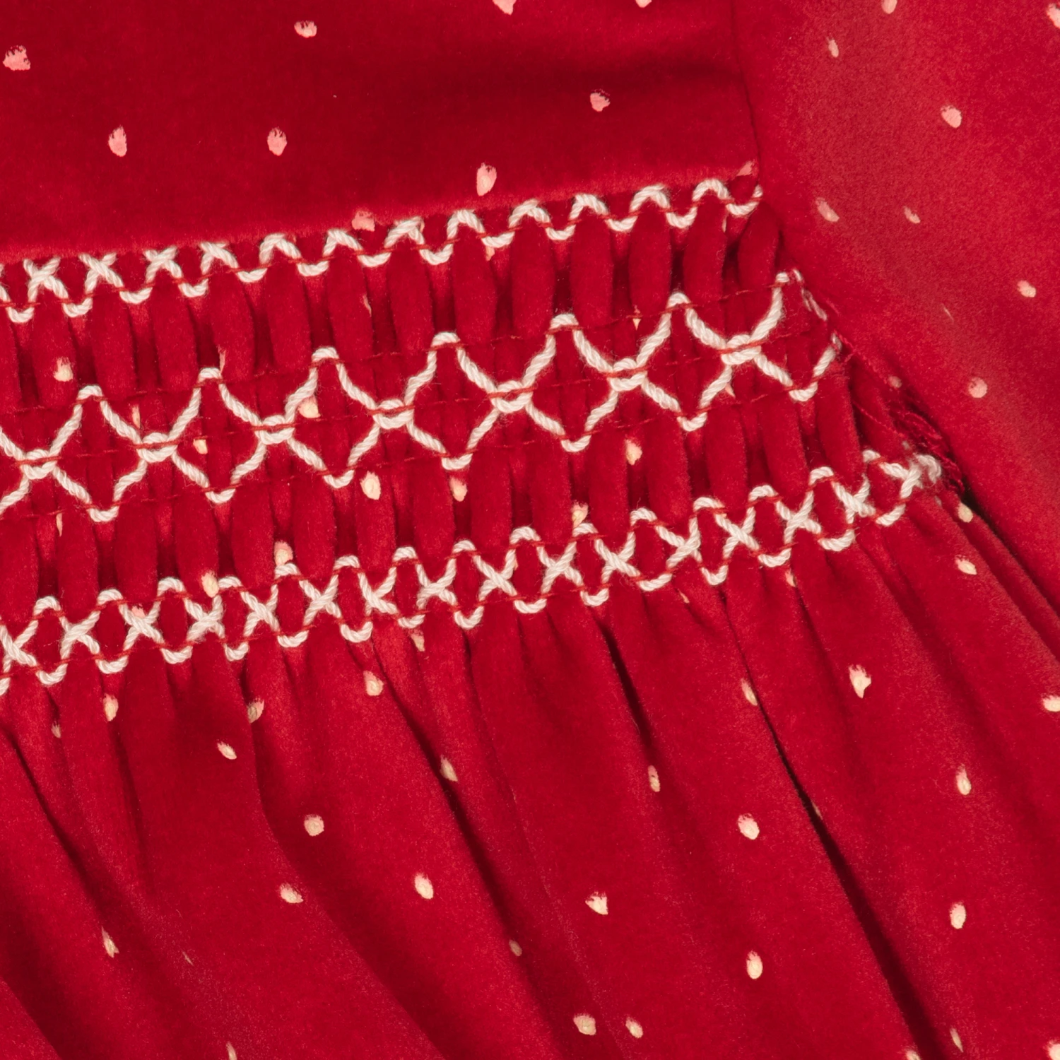 Beautiful red dress for baby girls from Mayoral Newborn, made in sumptuous velvet with an ivory dot pattern. It has pretty ivory smocking across the front, elasticated ruffled cuffs and a metal logo tab on the hem. The dress has a lightweight cotton lining for comfort and fastens with a concealed zip on the back.