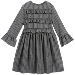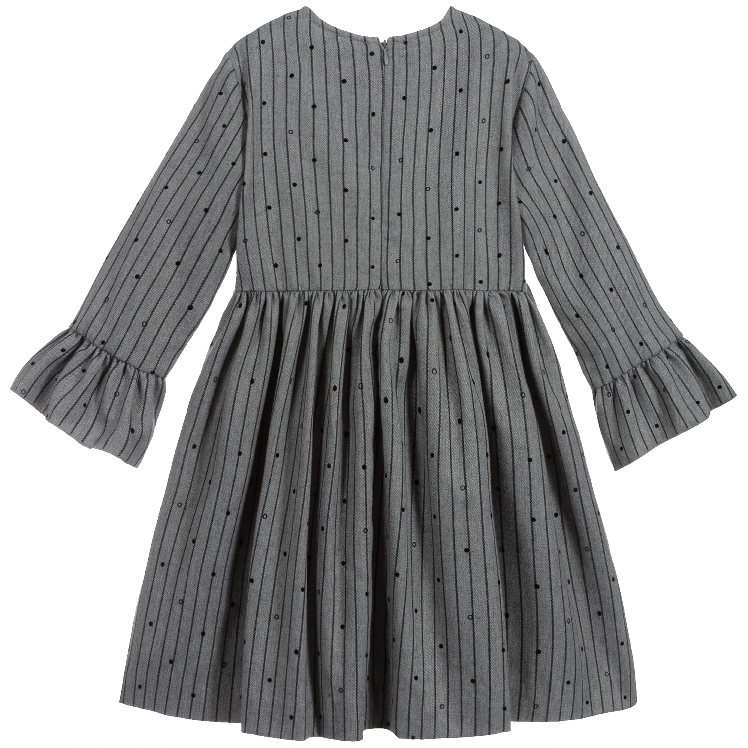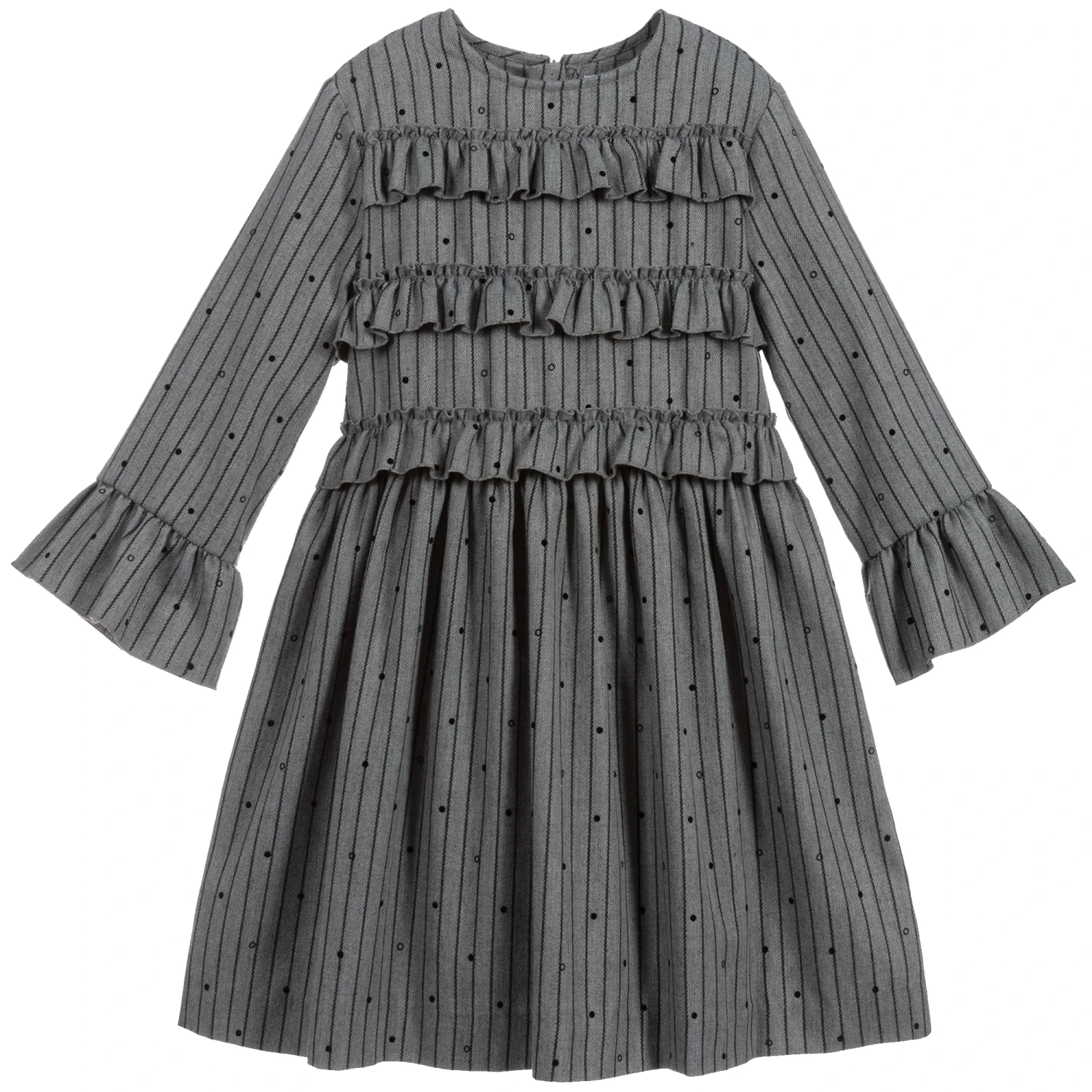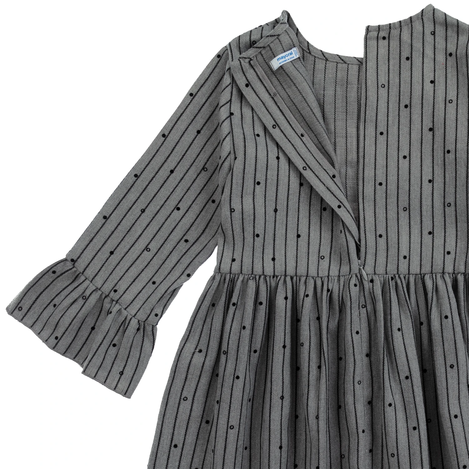 Teen girls grey dress by Mayoral, made in soft brushed twill. It has black stripes and dots, with ruffles on the front and cuffs.