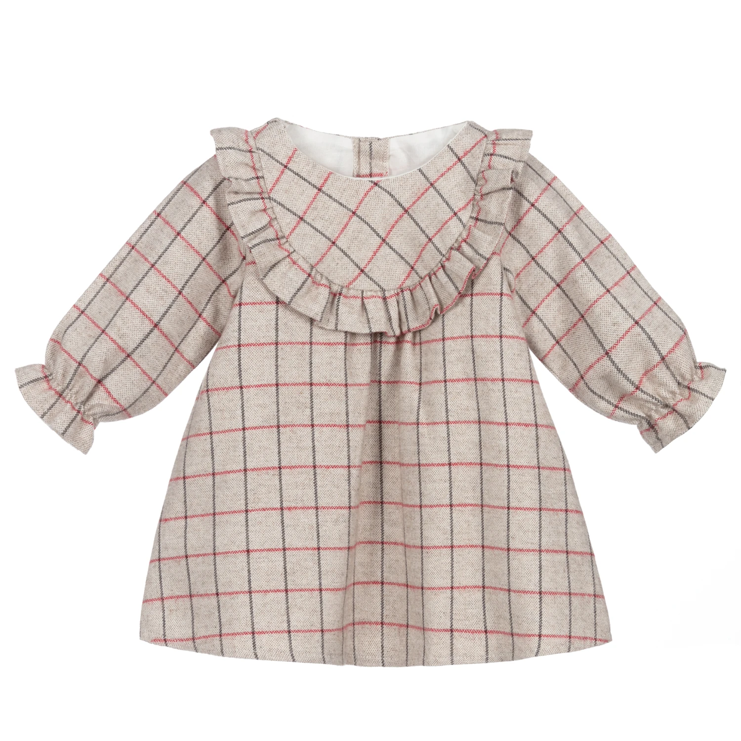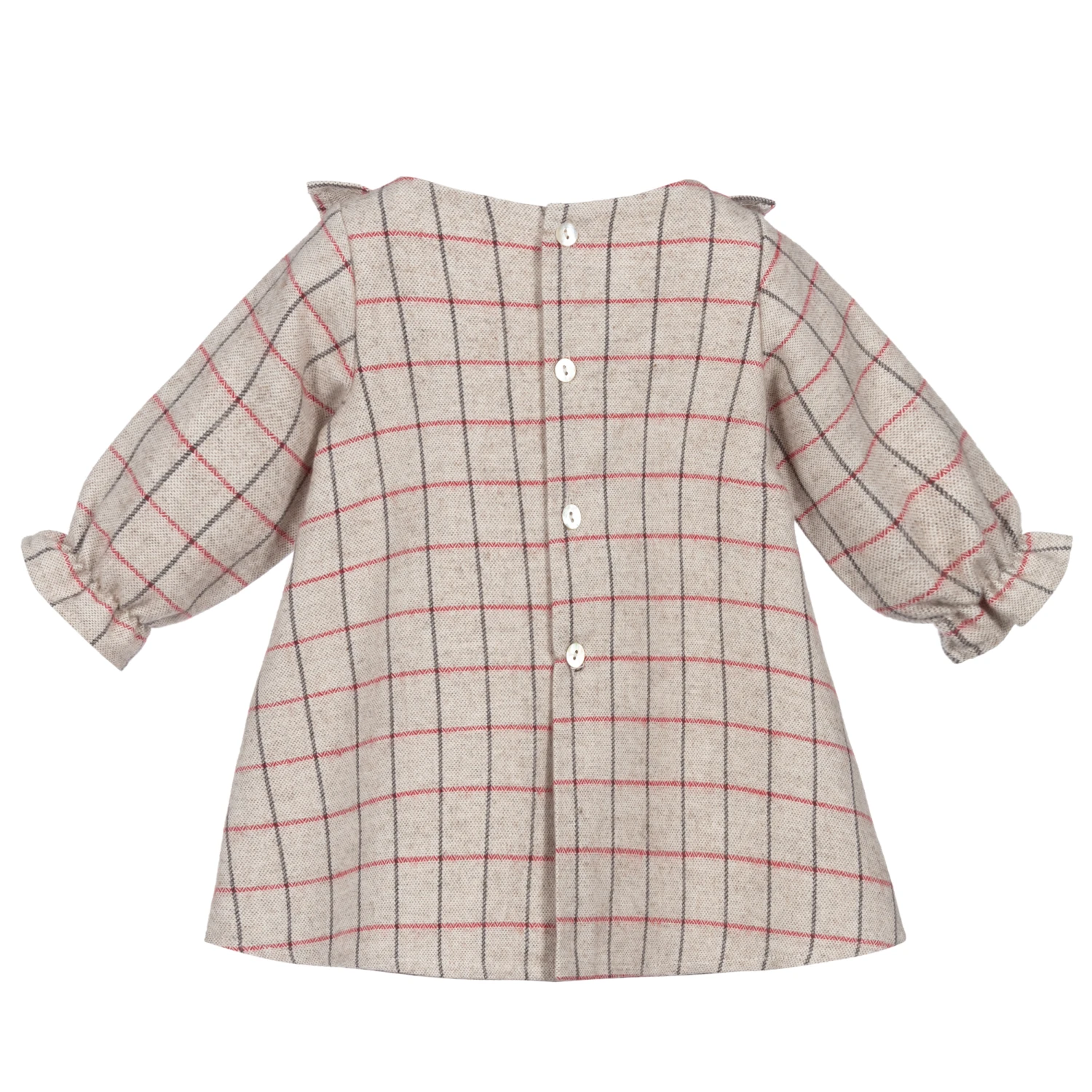 Beautifully soft, beige, red and grey checked dress for baby girls from Mebi. Made in cotton with a lovely brushed woven feel, it has a pretty ruffle on the bodice and matching trim on the elasticated cuffs. The dress is lined in lightweight cotton and fastens with mother-of-pearl buttons on the back.