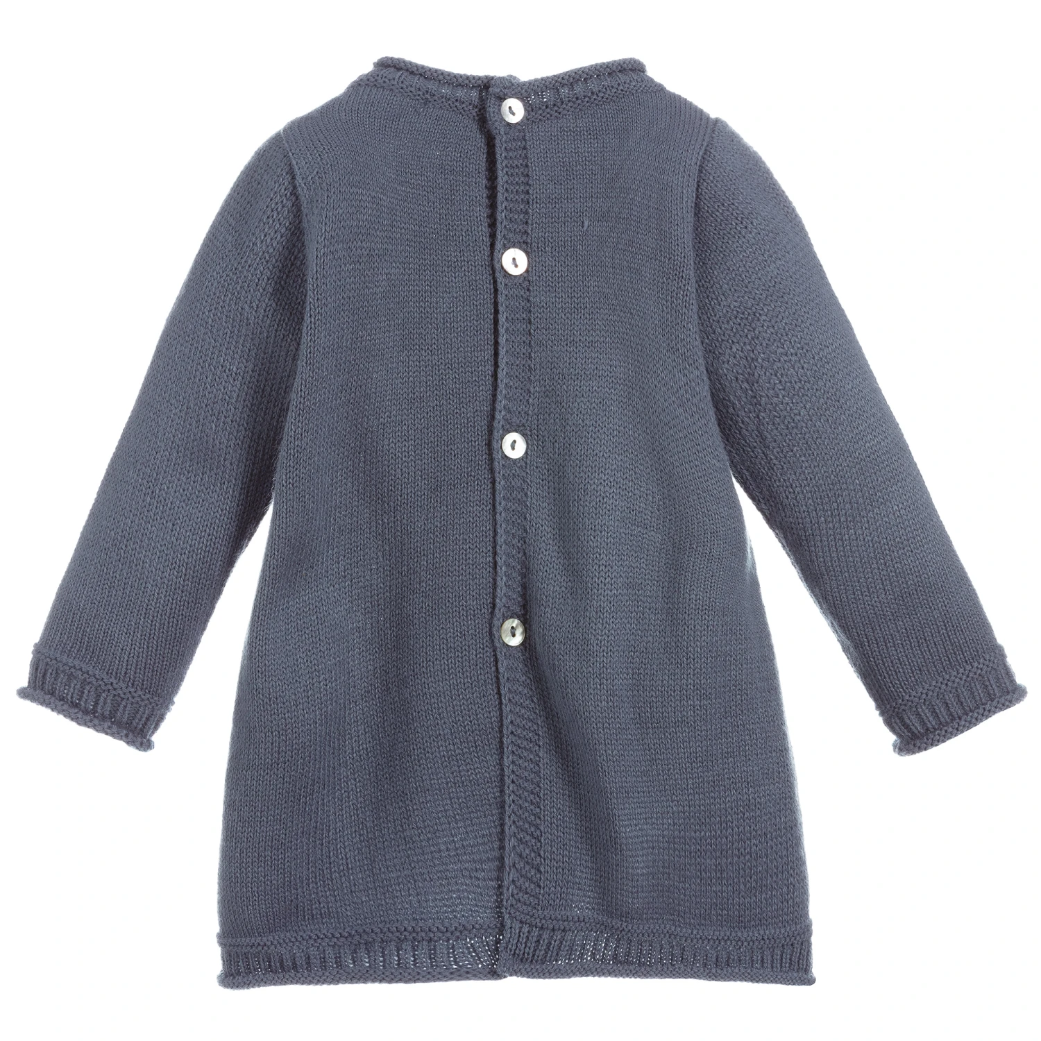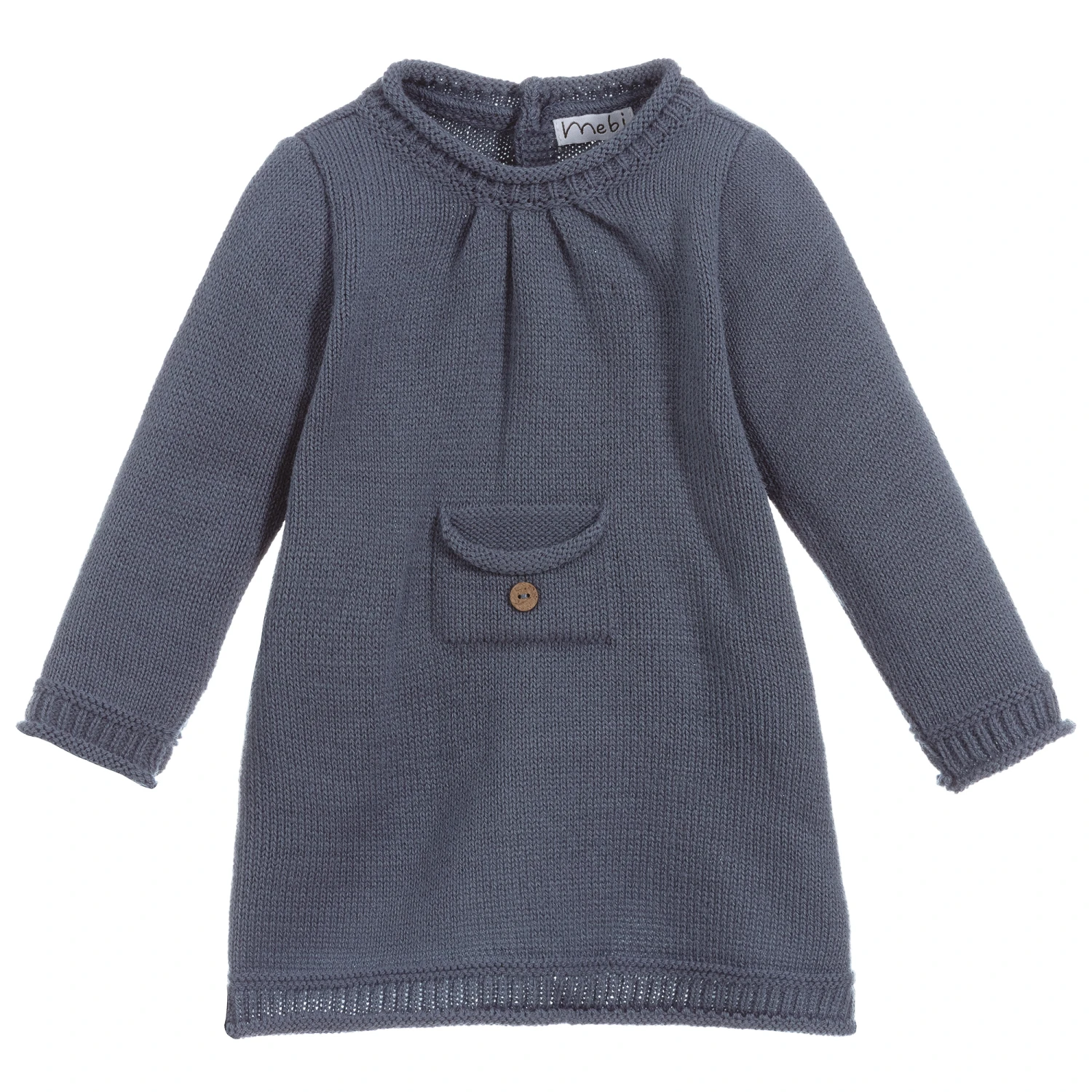 From Mebi, a slate blue dress for baby girls, made in softly knitted acrylic. With roll-edge ribbing on the collar, cuffs and hem, it has soft pleats on the front and a pocket with decorative wooden button.