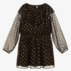 Black Mini-me dress for teen girls by American brand Michael Kors, made in soft chiffon. With a gold logo charm on the front, it has a metallic gold dotted design, sheer sleeve and a ruffled yoke. Lined in soft viscose voile, it fastens with a concealed zip and has an elasticated waistband.