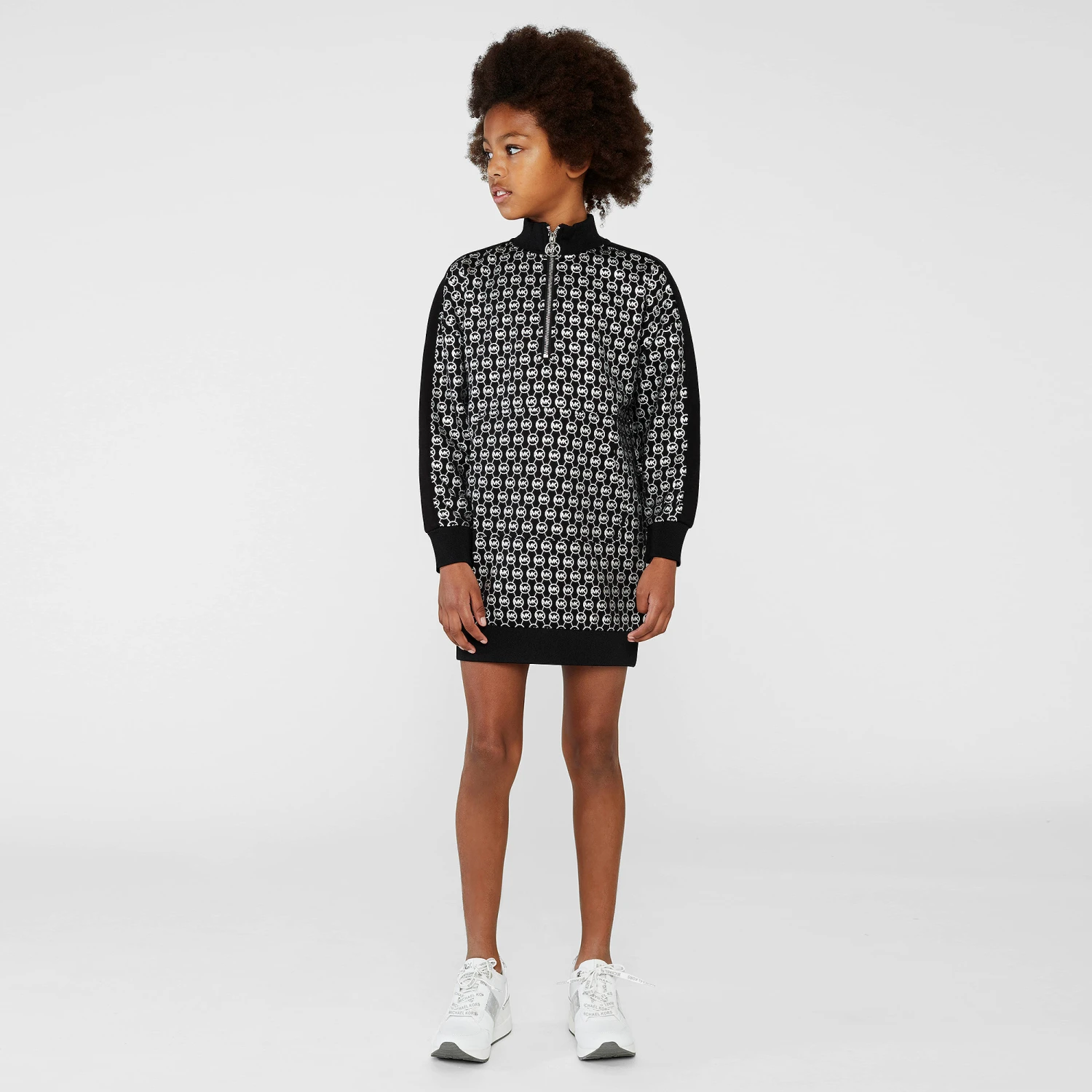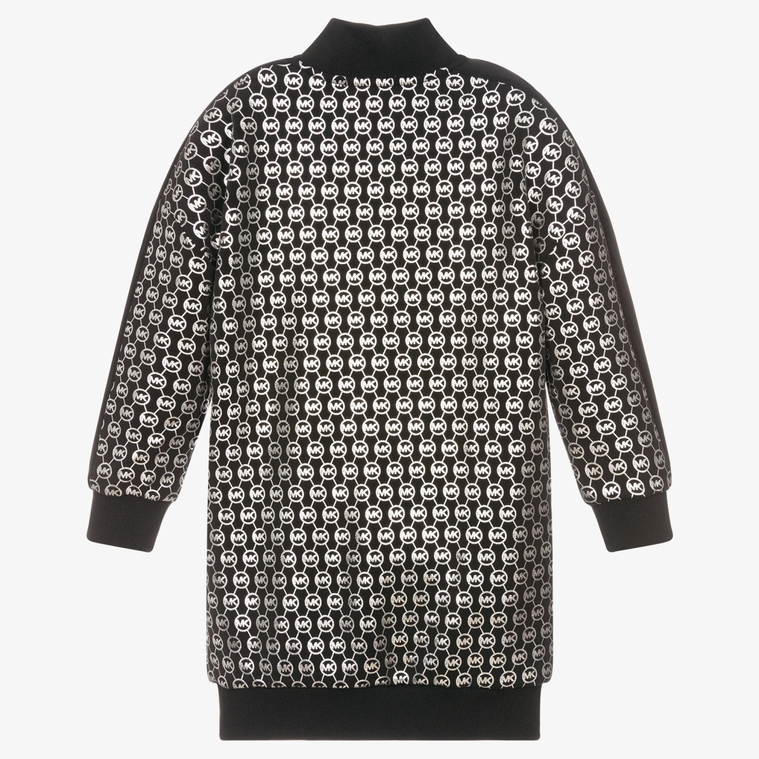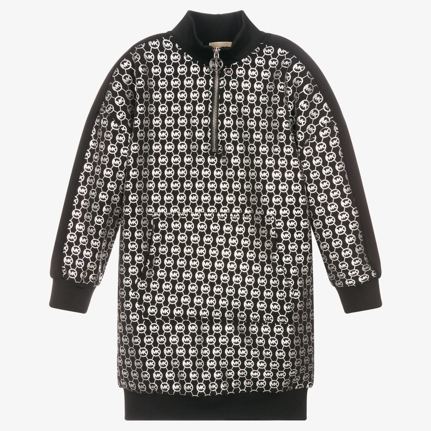 Black dress for teen girls by American designer Michael Kors, made in soft modal-blend jersey. It has a chic repeating MK logo in silver and a brand zip fastening on the collar. It has black ribbed trims and a front pouch pocket.