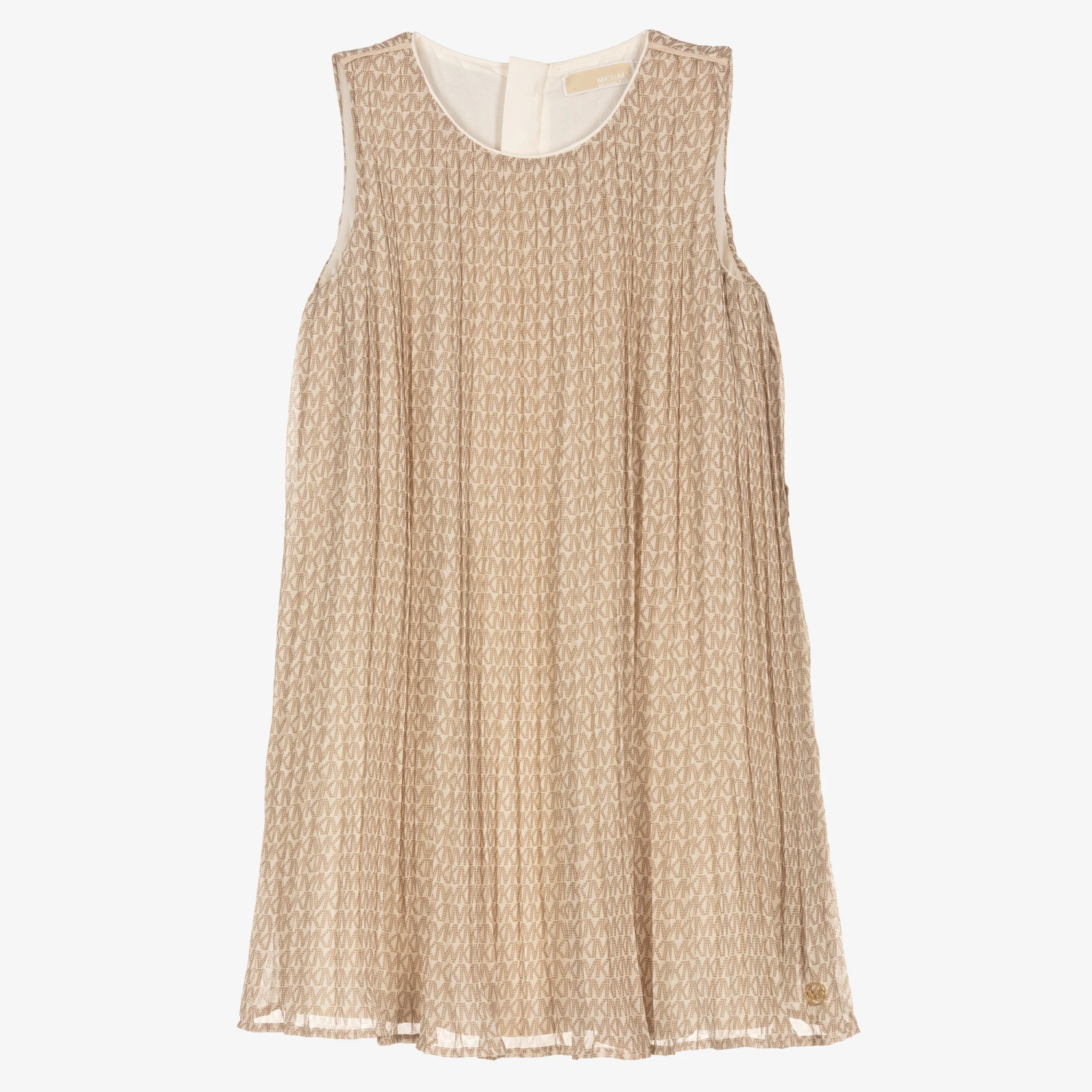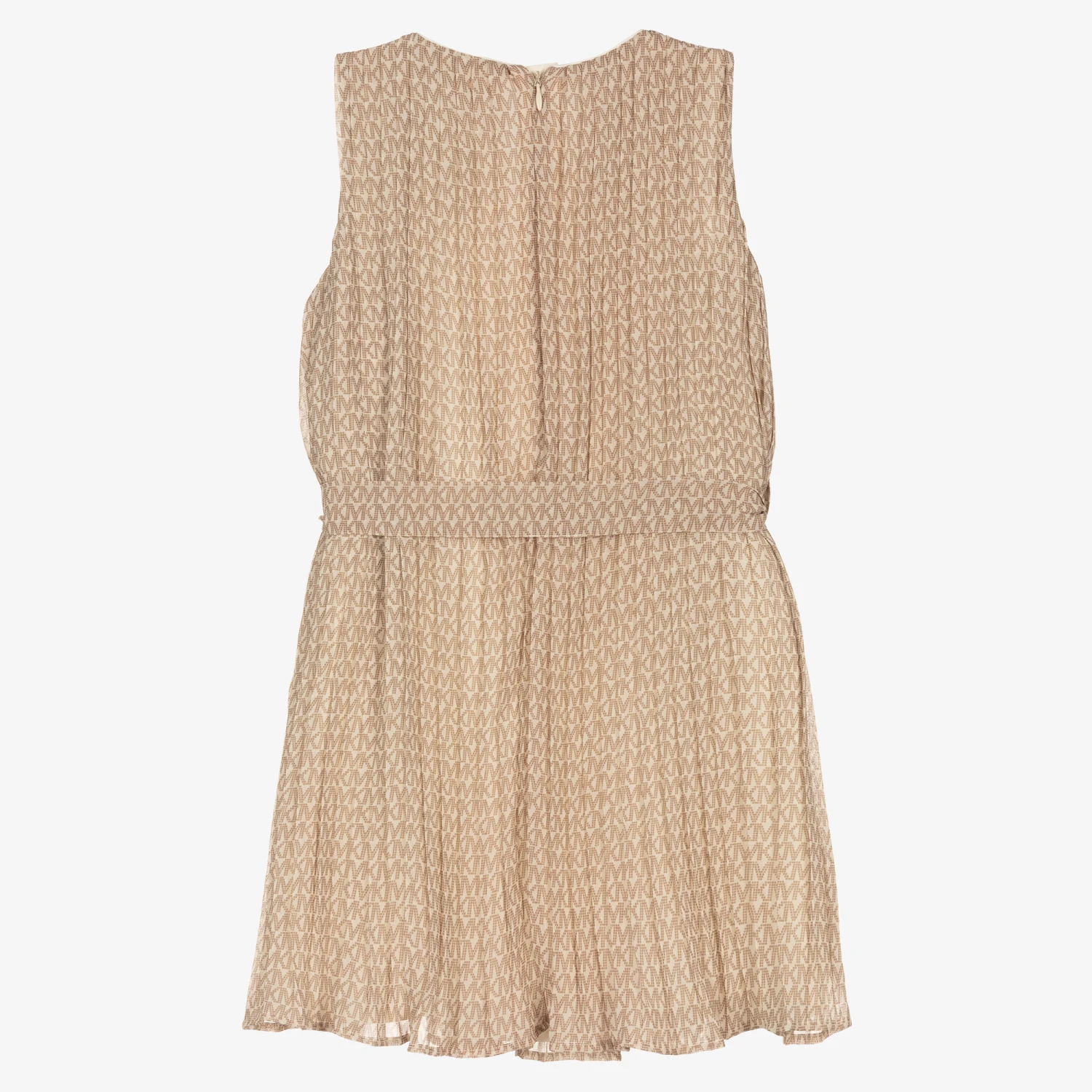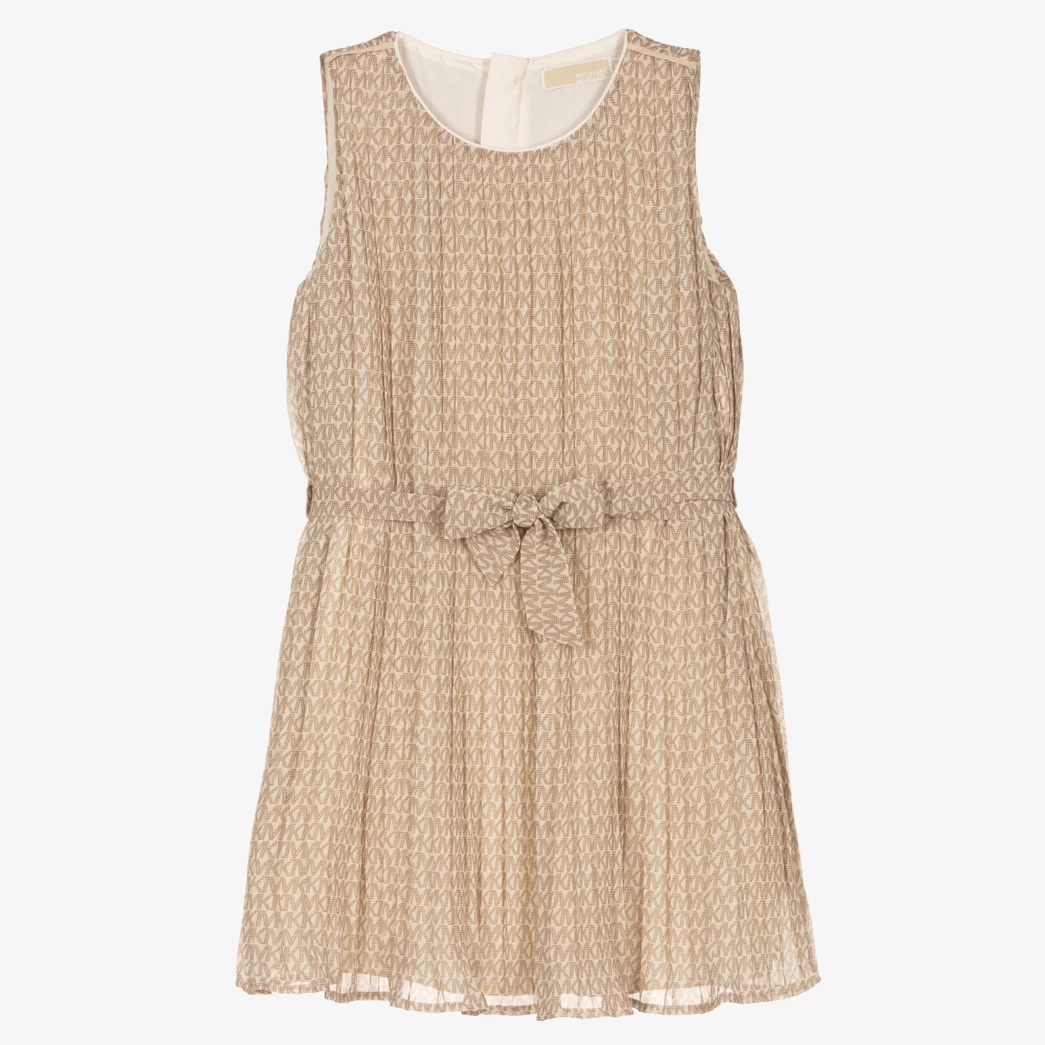 Stylish pleated dress for teen girls by American brand Michael Kors, in ivory with a beige signature monogram logo pattern. Made in sheer chiffon for an elegant drape, this simple sleeveless design has a chic tie belt at the waist, as seen in the main collection. It is comfortably lined in lightweight viscose twill and fastens neatly with a concealed zip on the back. A gold metal logo charm on the front hem completes the look.