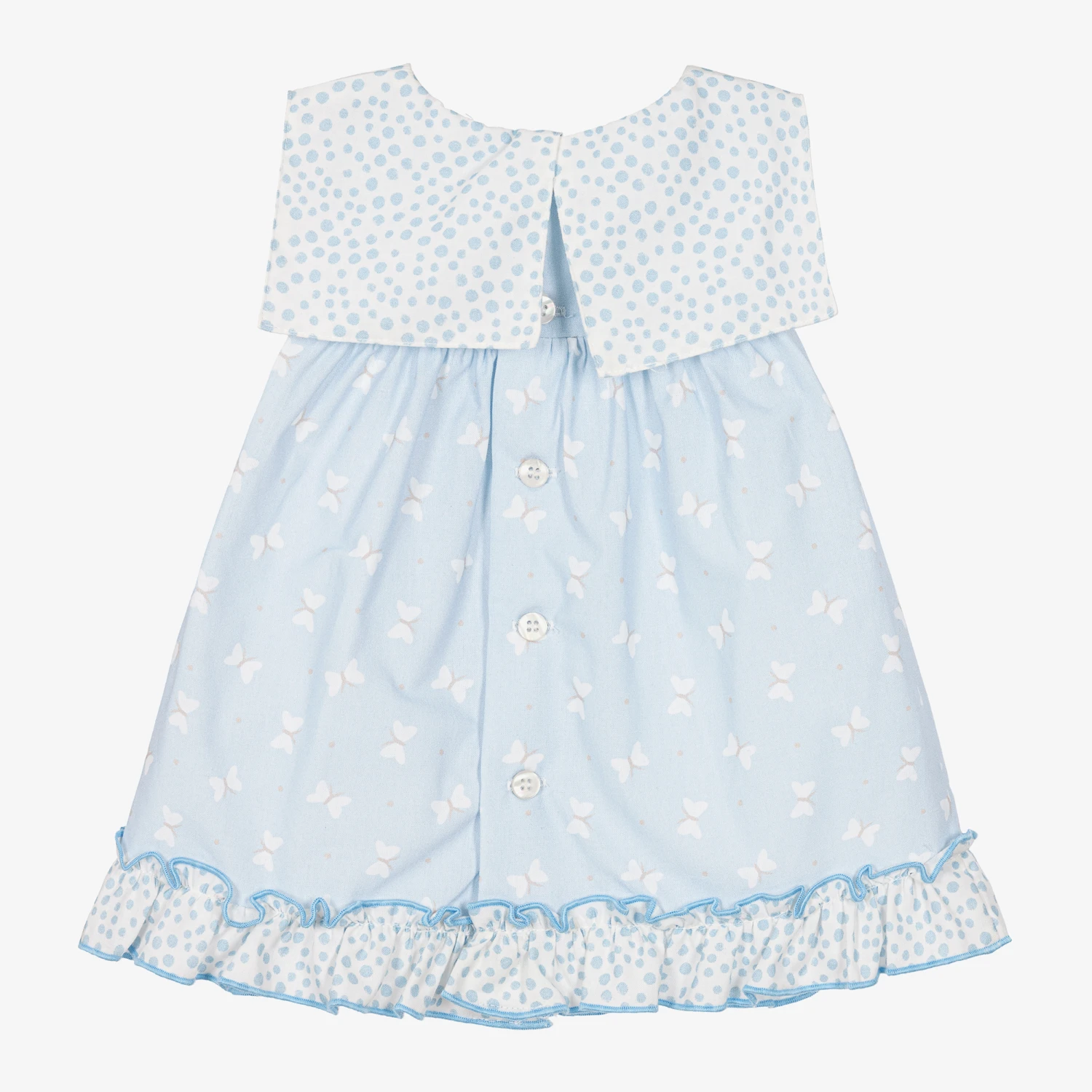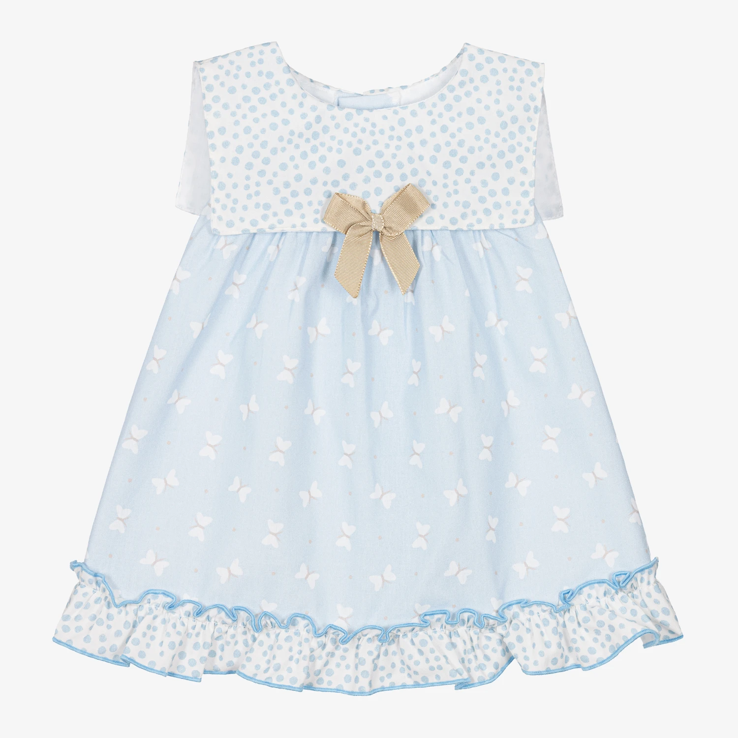 Lovely blue and white dress for baby girls, by Spanish brand Miranda. Woven in lightweight, lined cotton, the bib front and ruffle hem have a fun pebble design with blue piped edges. Trimmed with a stand-out beige bow on the front, the dress has a delicate butterfly print and easily fastens with mother-of-pearl buttons on the back.