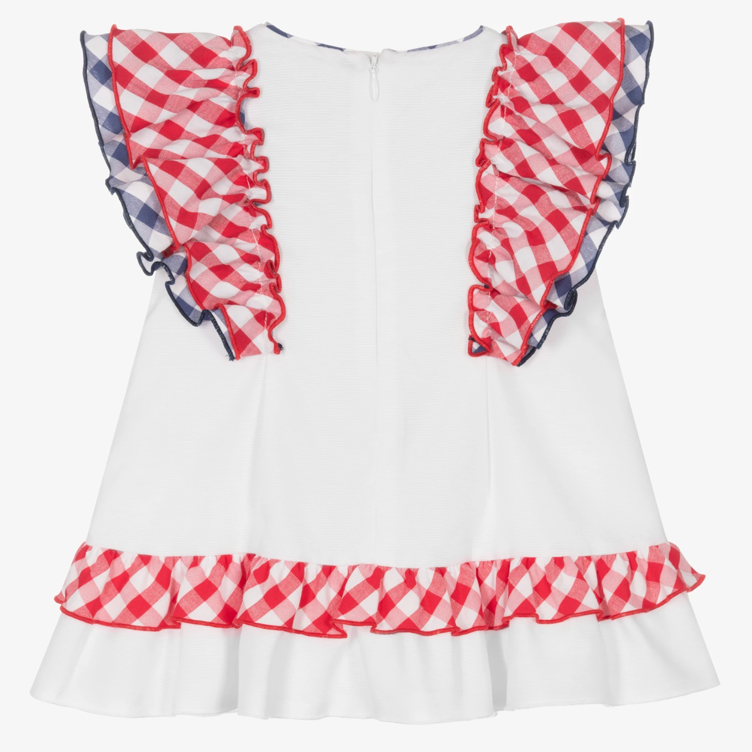 A lovely white cotton dress for baby girls by Miranda, traditionally styled with classic red and navy blue gingham check trims. Lightweight and comfortable, it has layered flutter sleeves with a matching bow appliqué on the chest. Fully lined, it has a concealed zip fastening on the back and a ruffled hem for a cute and girly look.