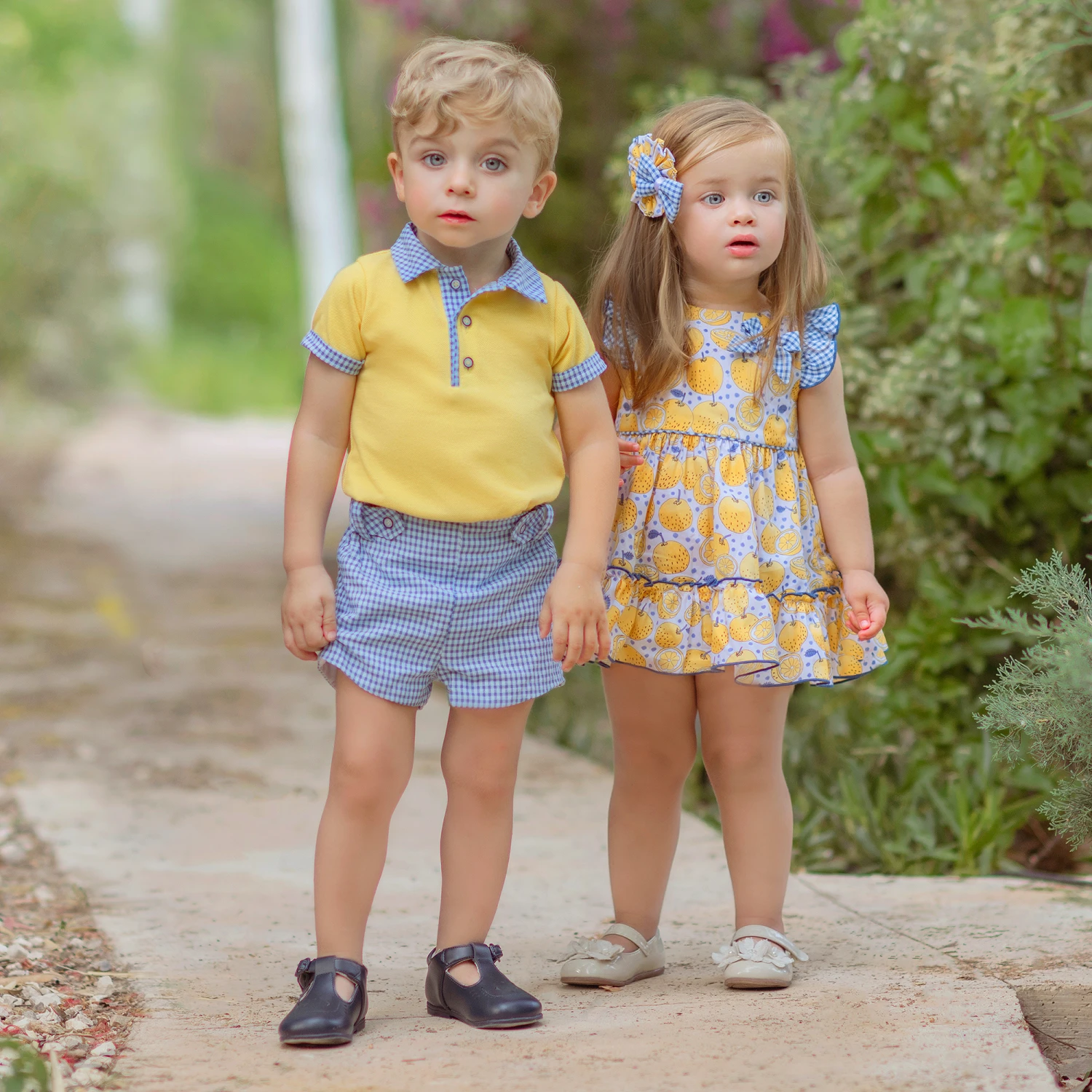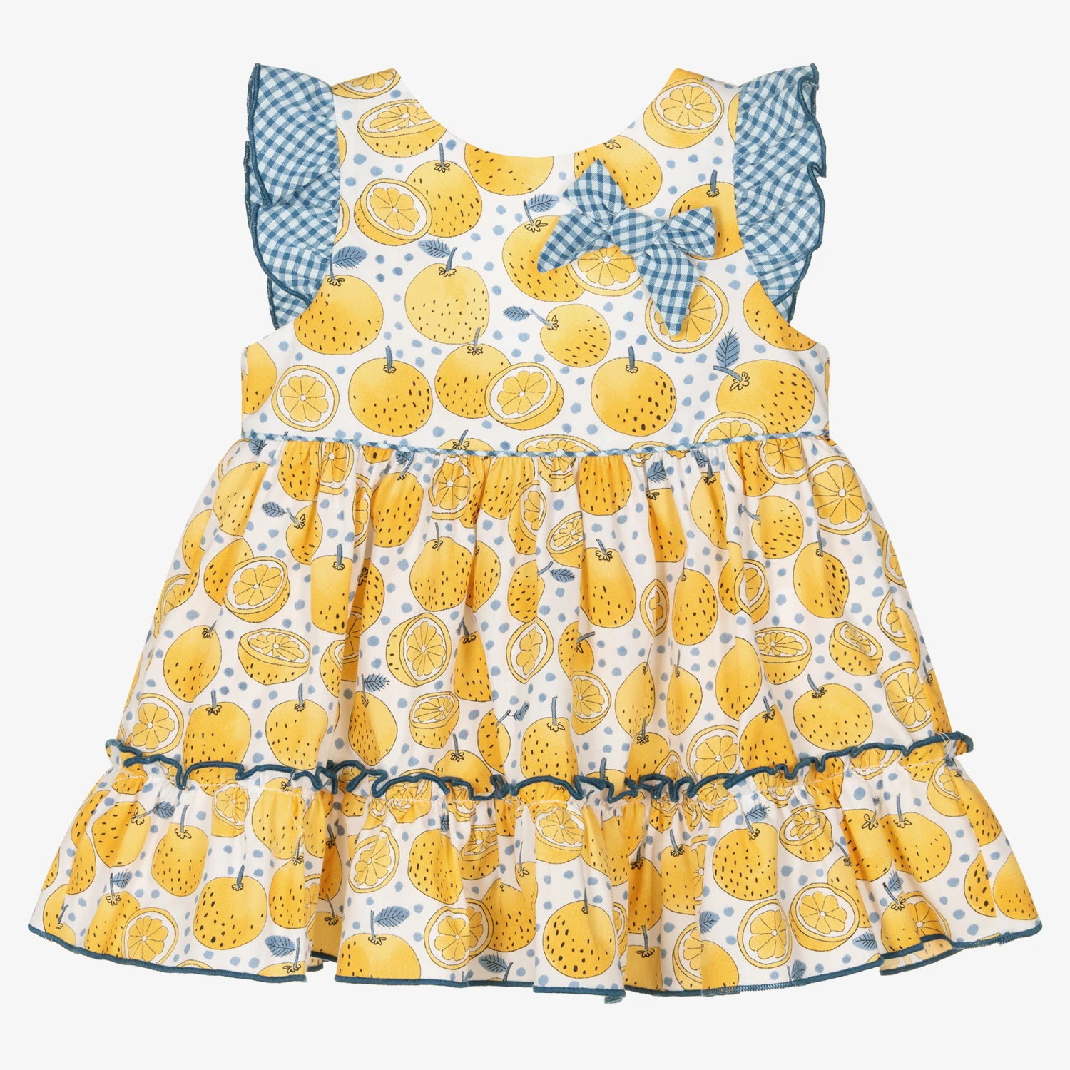 Baby girls pretty yellow and blue print dress by Spanish brand, Miranda. Made in smooth cotton poplin, the dress has a bright and cheerful lemons print with blue and white gingham check ruffle trims. It has a square cut back and a concealed zip fastening.