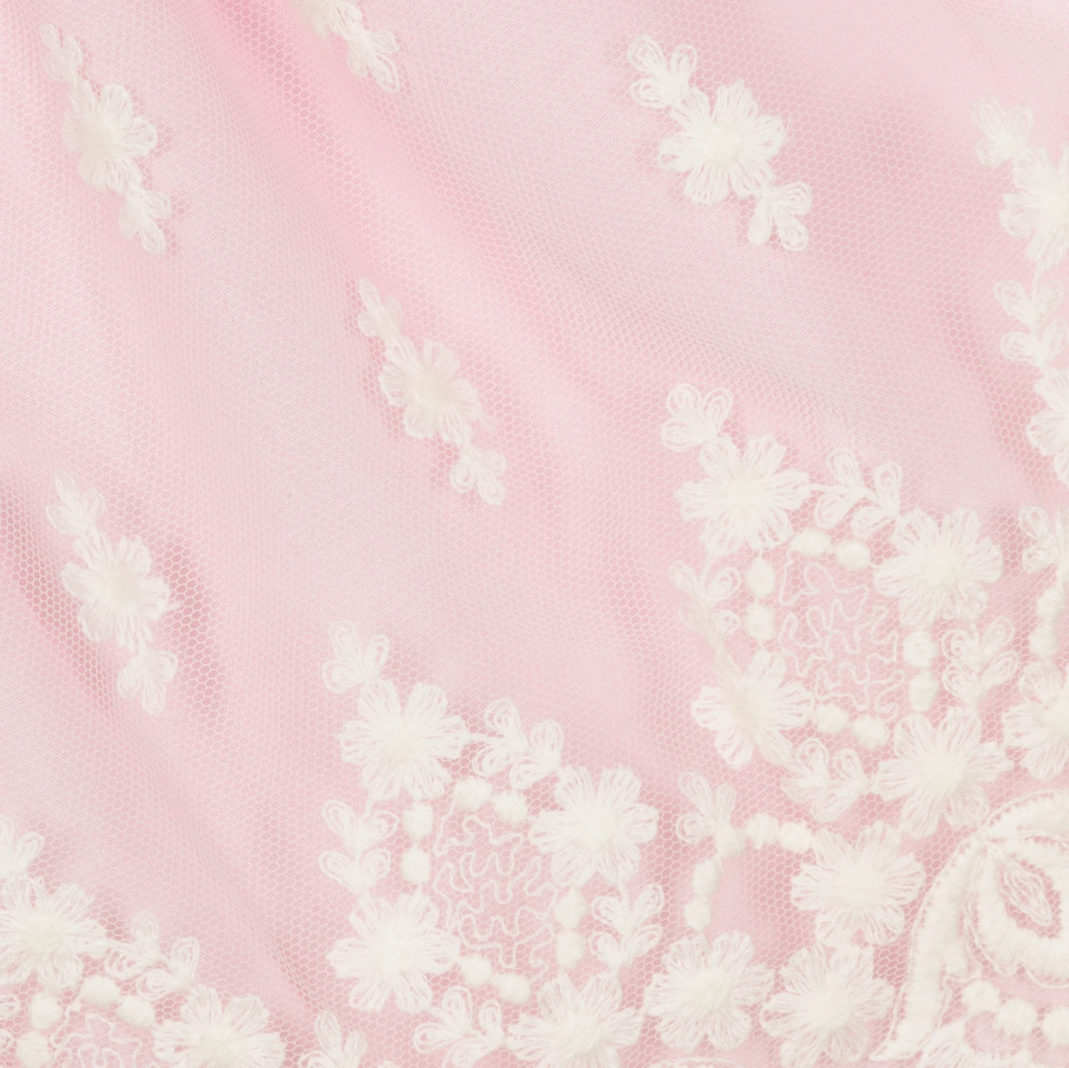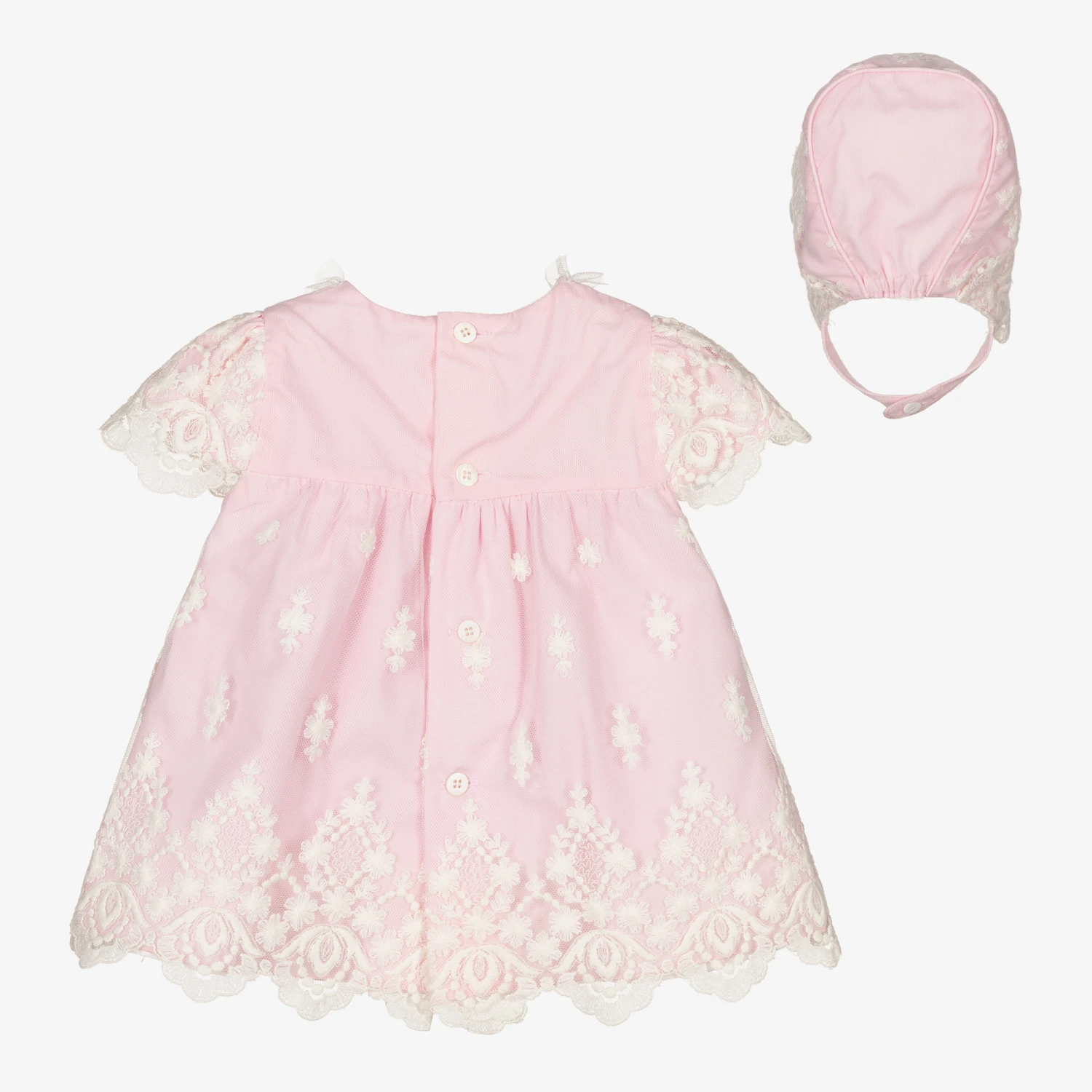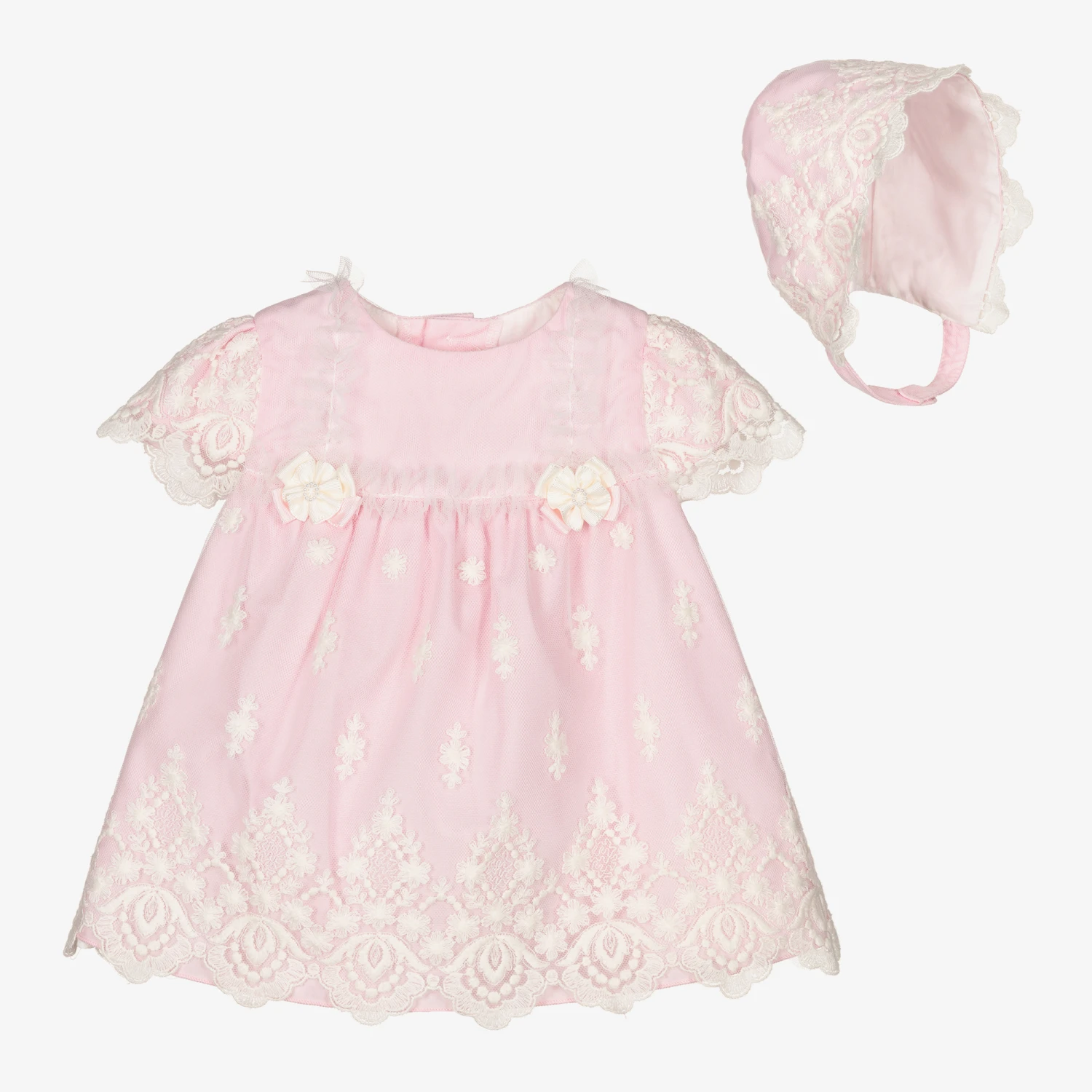 Sweet pale pink dress set for baby girls by Miranda, made in soft cotton poplin with a tulle overlay. It is beautifully trimmed in delicate ivory lace and has a bib front trimmed with ruffles and ivory grosgrain ribbon rosettes. There are button fastenings on the back and on the chin strap of the matching bonnet. Bloomer knickers complete the look.