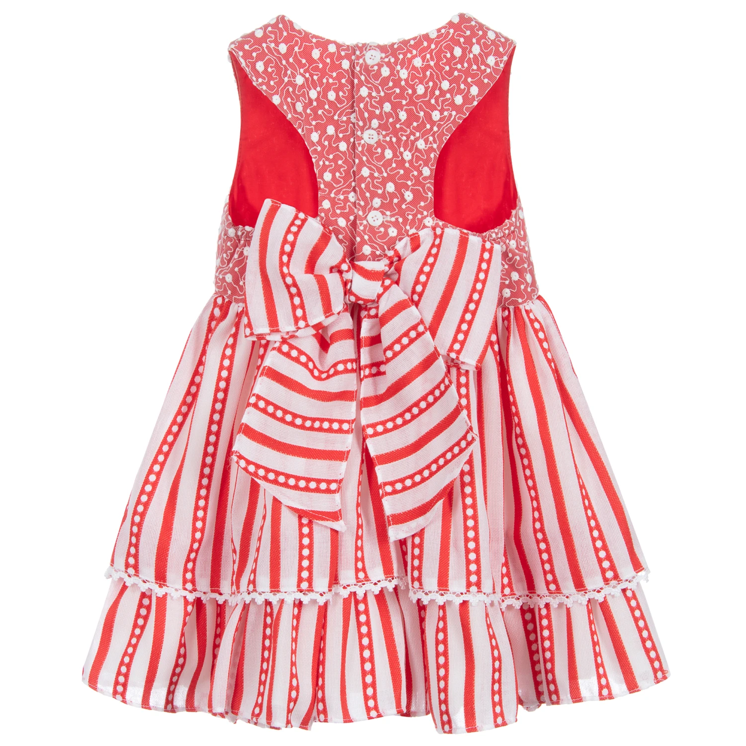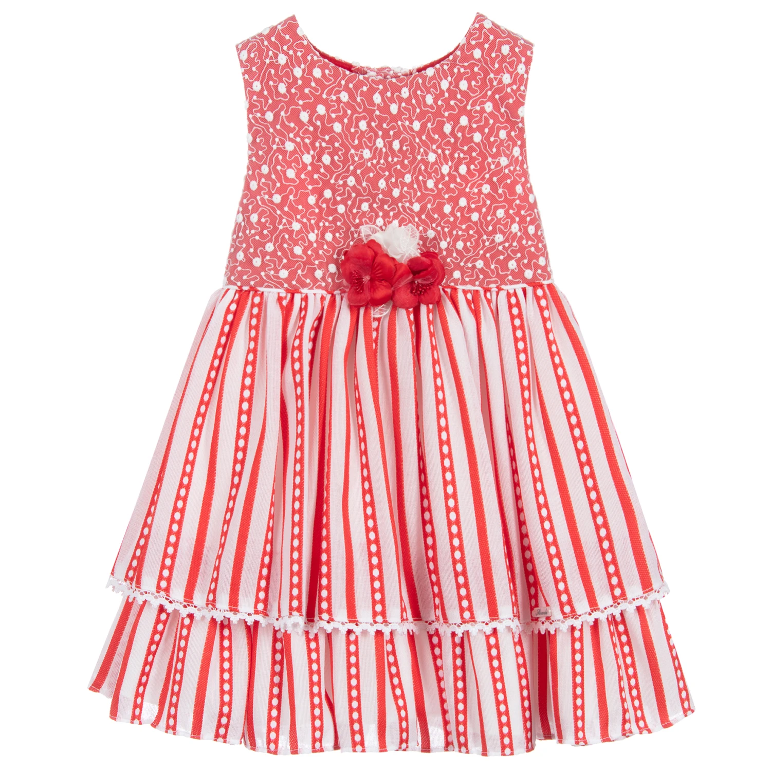 Teen girls white and red dress by Miranda. It has embroidered lace tulle over plain red fabric on the top, and spots and stripes on the skirt. There are removable fabric flowers on the front and a large bow on the back
