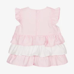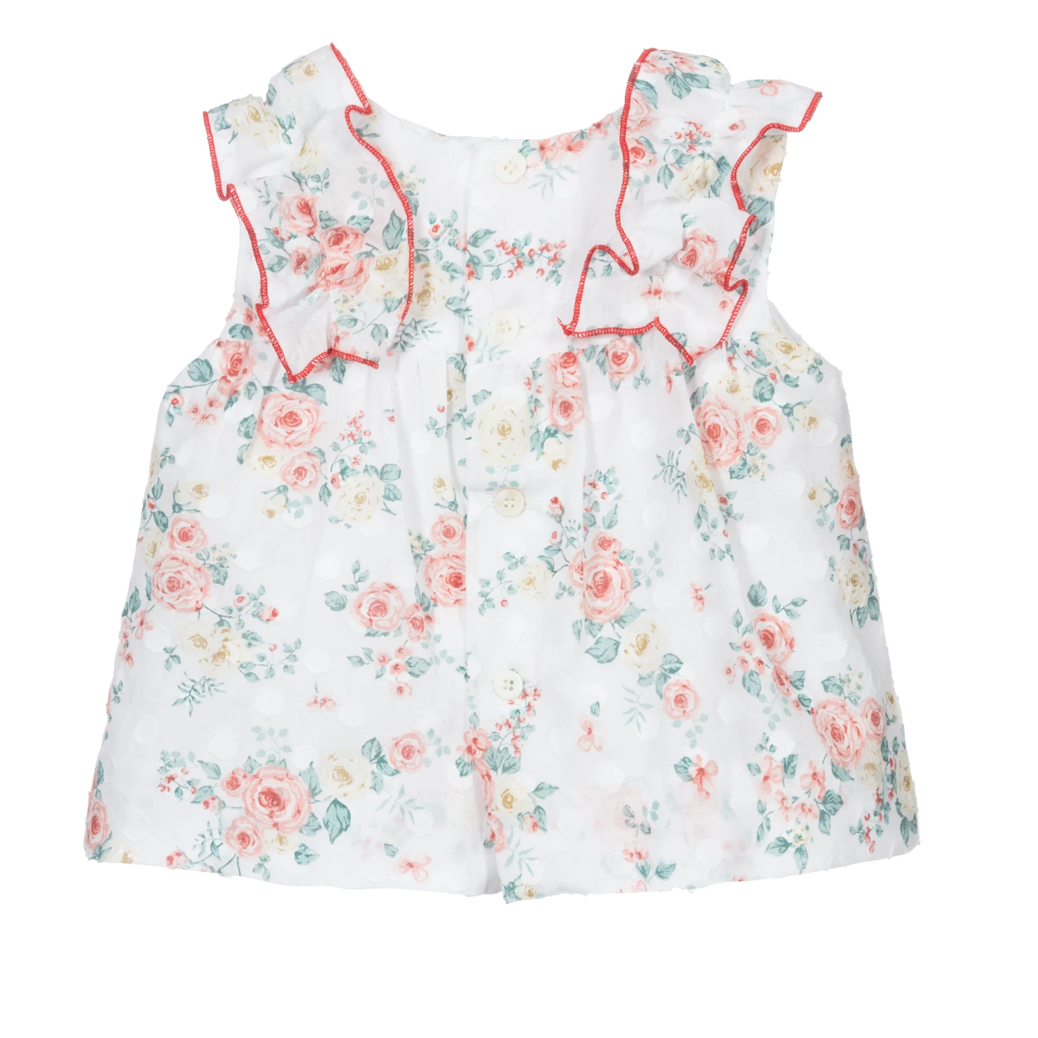 Baby girls white dress and knickers set from Miranda, with a pretty red and green floral print. Made in lightweight cotton voile with a white dot pattern, it has a ruffled collar with a red trim and a red grosgrain ribbon bow on the front.