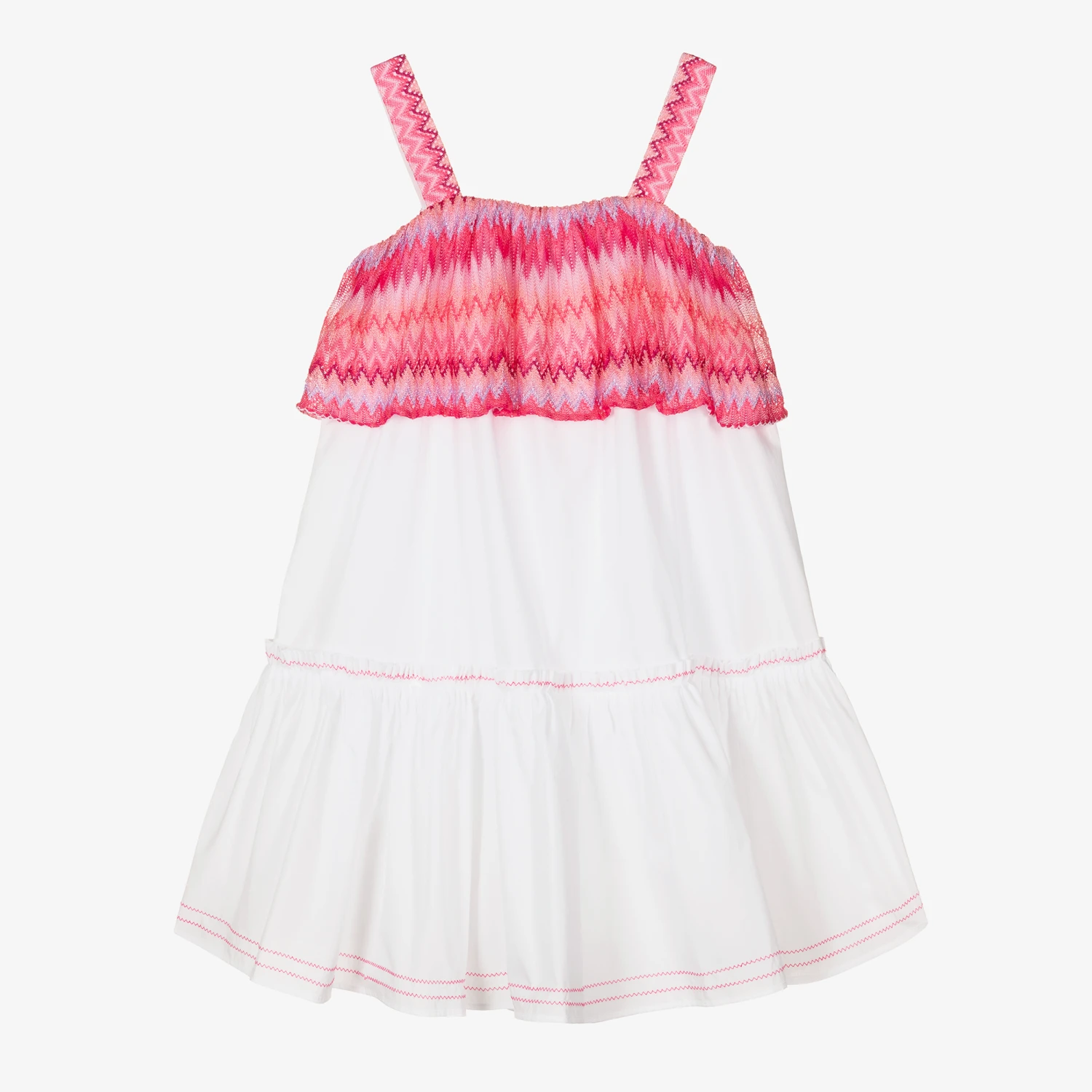 The Missoni Zigzag characterises this distinctive white and pink Italian-made cotton dress for teen girls. Famous for their wonderfully intricate knits, the luxury label has designed this trapeze sun dress with a pink Zigzag ruffle layer on the bodice and shoulder straps. Comfortable in a double layer of poplin, the dress has stand-out pink stitching and an embroidered logo on the ruffle hem. The neckline is softly elasticated for shape and ease of dressing.