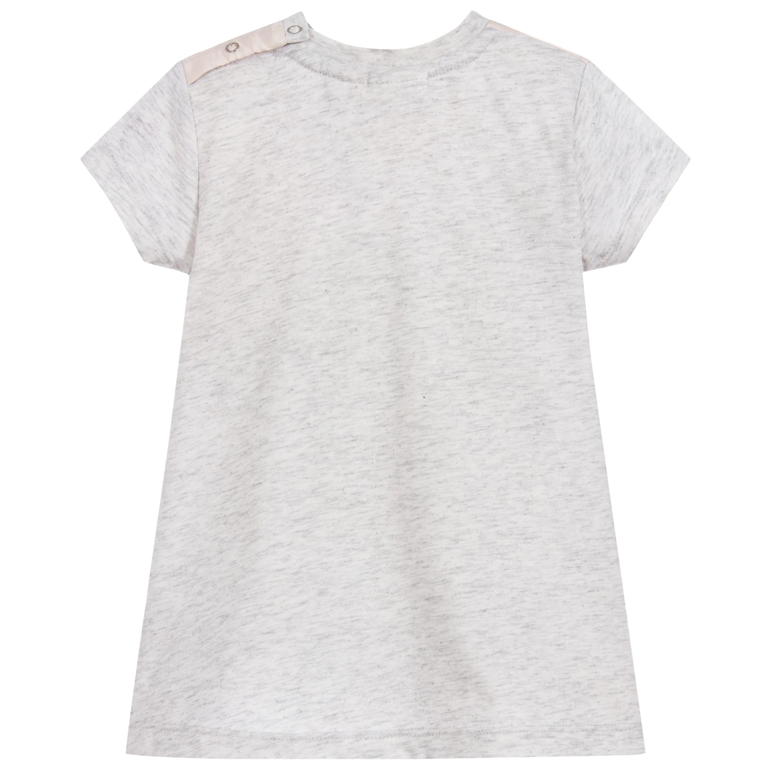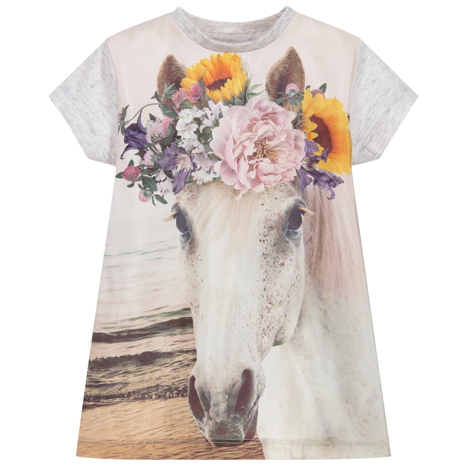 Baby girls grey cotton jersey dress by Molo. It has a silk front, with a lovely horse and flowers print.
