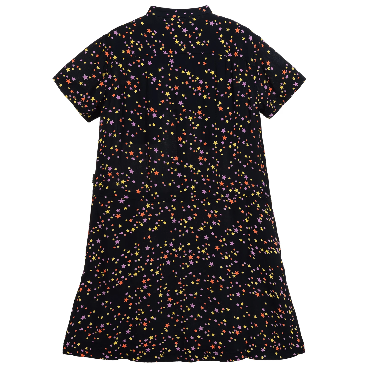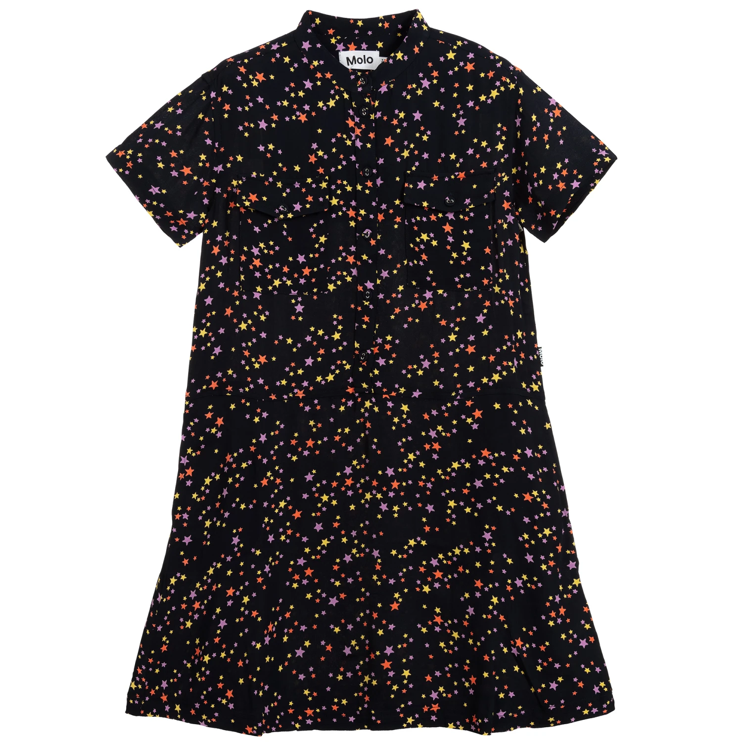 Dark navy blue dress for teen girls by Danish designer Molo, with a pink, yellow and orange stars pattern. Made in soft and lightweight viscose, it is loose-fitting with concealed side pockets.