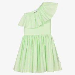 Stylish, asymmetric pale green dress for teen girls by Danish brand Molo, made with organic cotton. Chic yet comfortable to wear, it has a soft ribbed jersey bodice with a statement poplin ruffle around the neckline and over one shoulder. The gathered poplin skirt gives a feminine silhouette and there is a branded tab on the side seam for a discreet designer finish.