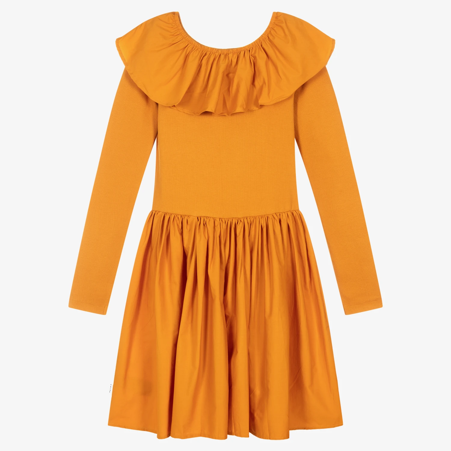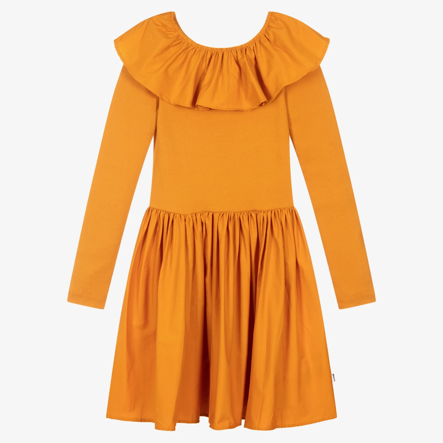 Dark orange organic cotton dress for teen girls by Molo. This stylish dress has a ruffle collar made in cotton poplin with an elasticated neckline, allowing versatile on or off the shoulder styling. The skirt is made in smooth poplin, while the bodice is soft ribbed cotton jersey for a casual look that’s also comfortable to wear.
