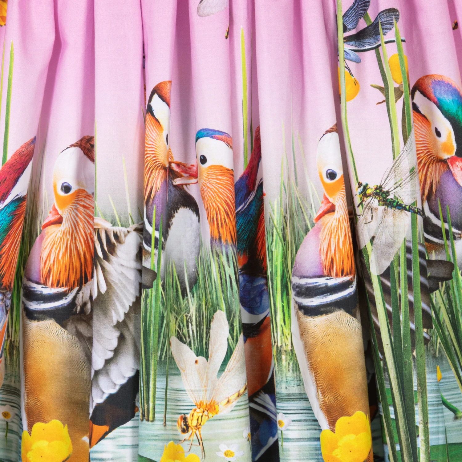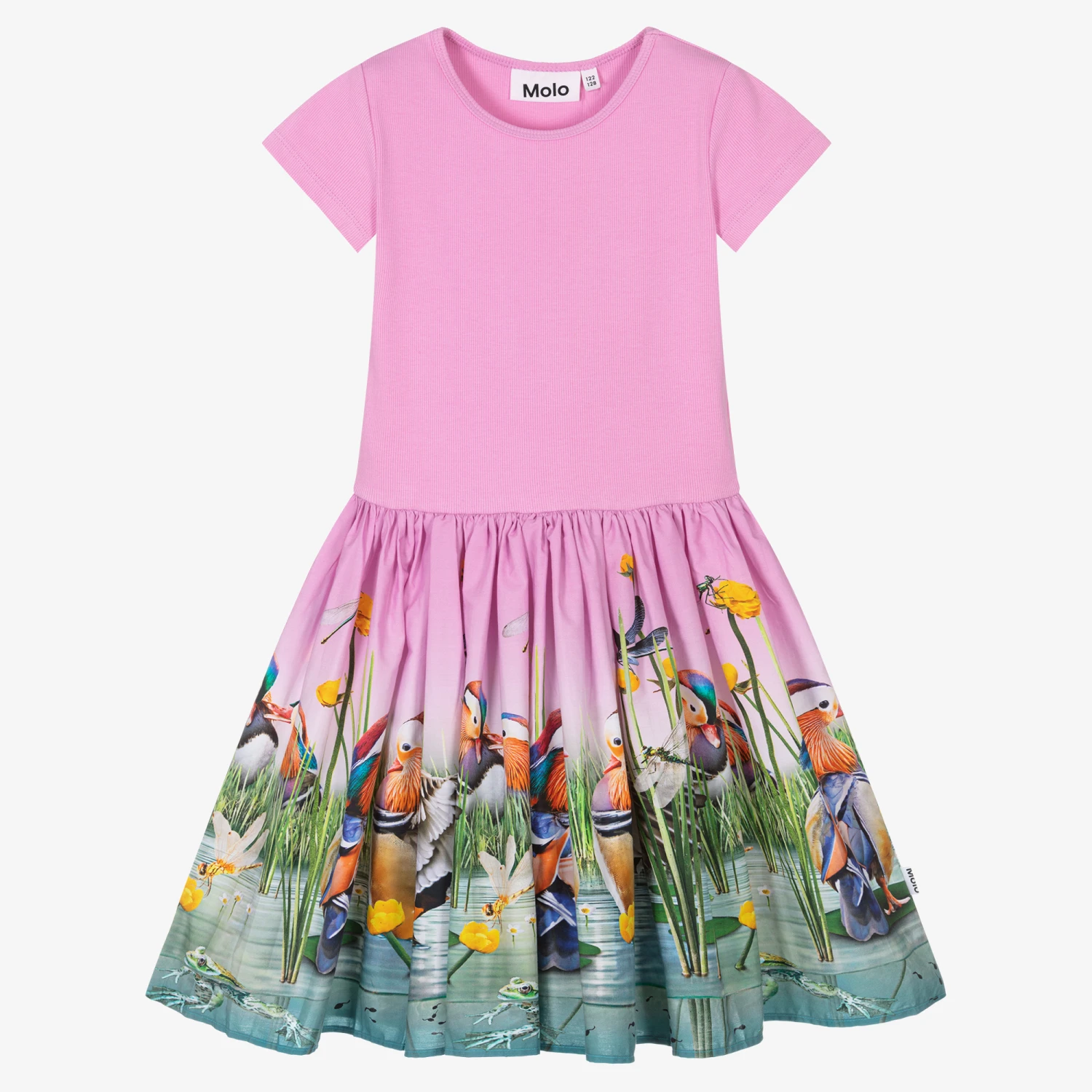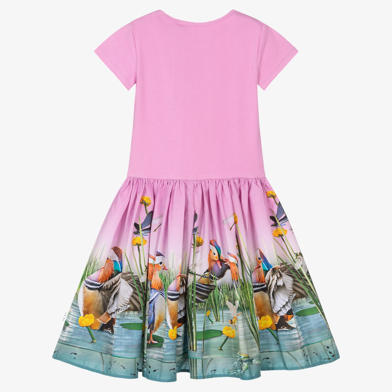 Lilac pink organic cotton dress for teen girls by Molo. Decorating the lightweight poplin skirt is quirky duck and buttercup flower graphics. The T-shirt-style bodice is made in stretchy and comfortable ribbed jersey with capped sleeves.