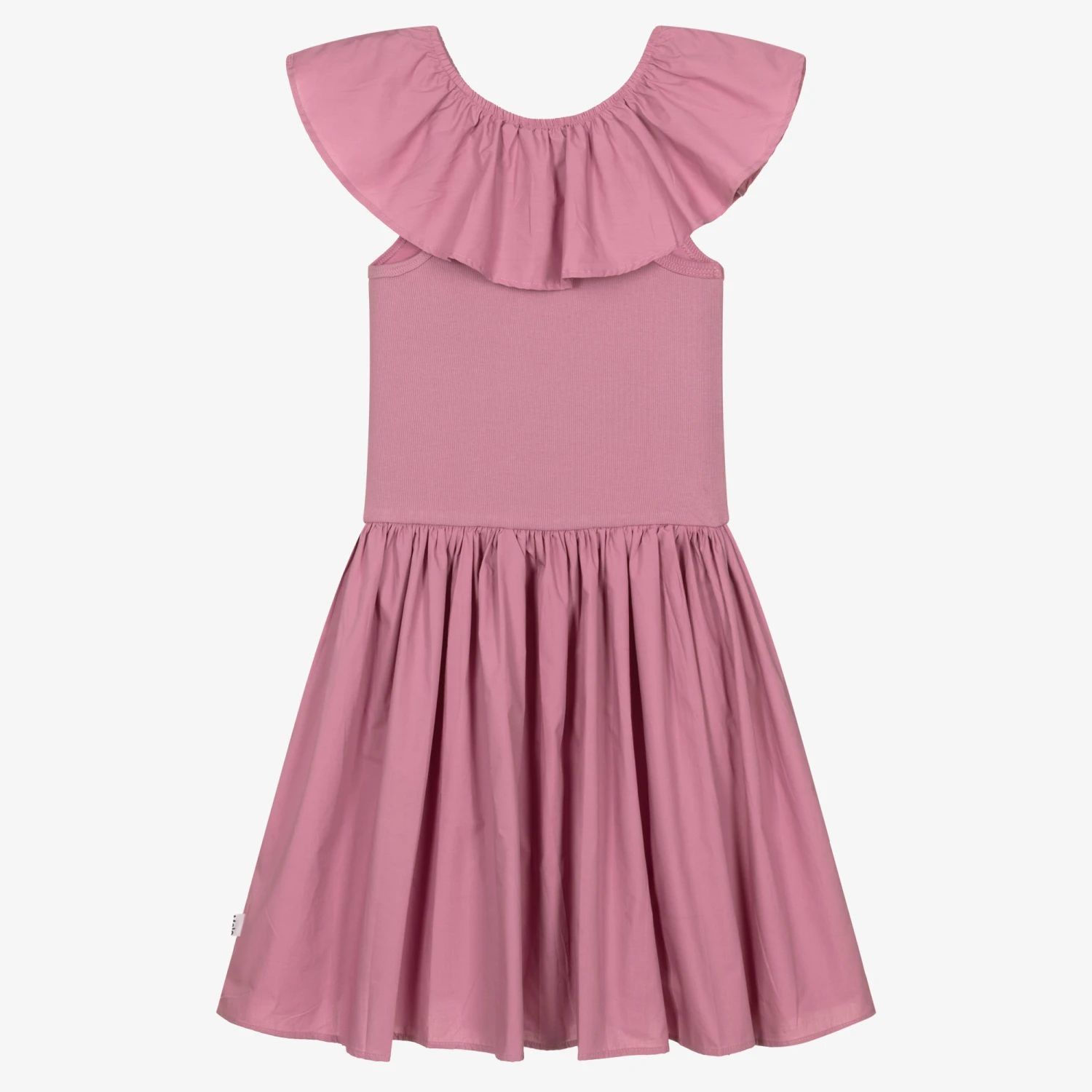 Lilac purple sleeveless dress for teen girls by Molo. Made in soft organic cotton, the stretchy ribbed bodice has a ruffle collar, with an elasticated neckline. The full skirt and collar are made in soft, smooth and lightweight poplin. Comfortable and easy to wear, it can be simply pulled on over the head.