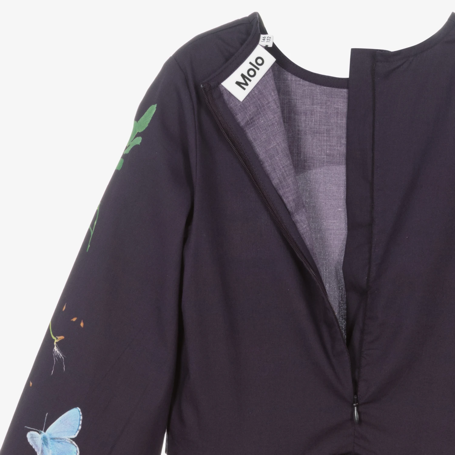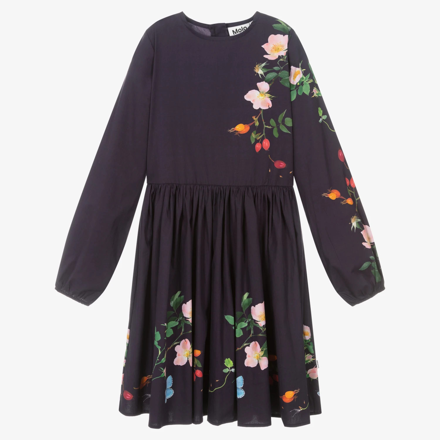 From Molo, a deep purple dress for teen girls. Distinctive of the designer’s style, this organic cotton dress is decorated with beautiful floral butterfly graphic prints. Soft, lightweight and slightly stretchy for comfortable wear, it has gently elasticated cuffs to give the long sleeves a lovely full shape. It is gathered on the dropped waist and there is a concealed zip fastening on the back.
