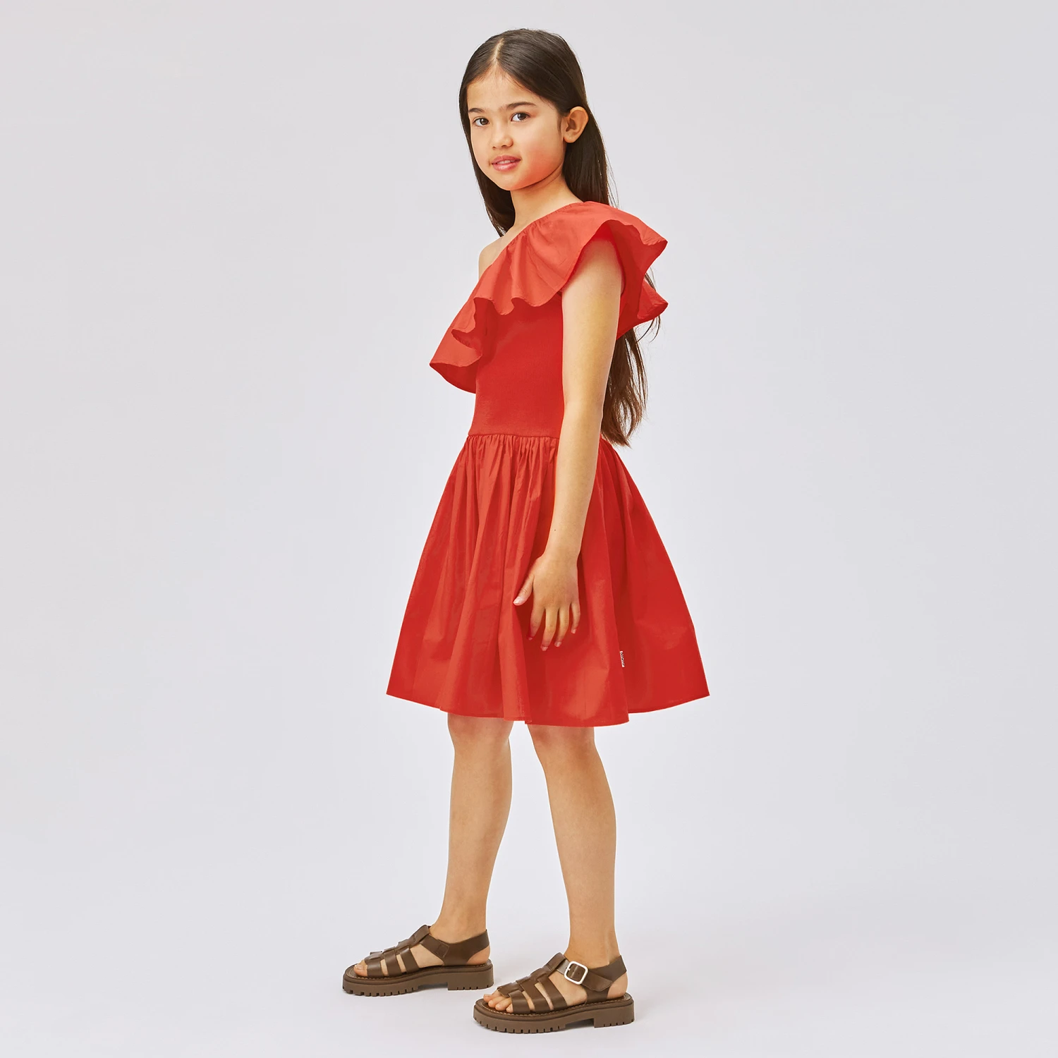 Stylish asymmetric red dress for teen girls by Danish brand Molo, made with organic cotton. Chic yet comfortable to wear, it has a soft ribbed jersey bodice with a statement poplin ruffle around the neckline and over one shoulder. The gathered poplin skirt gives a feminine silhouette and there is a branded tab on the side seam for a discreet designer finish.