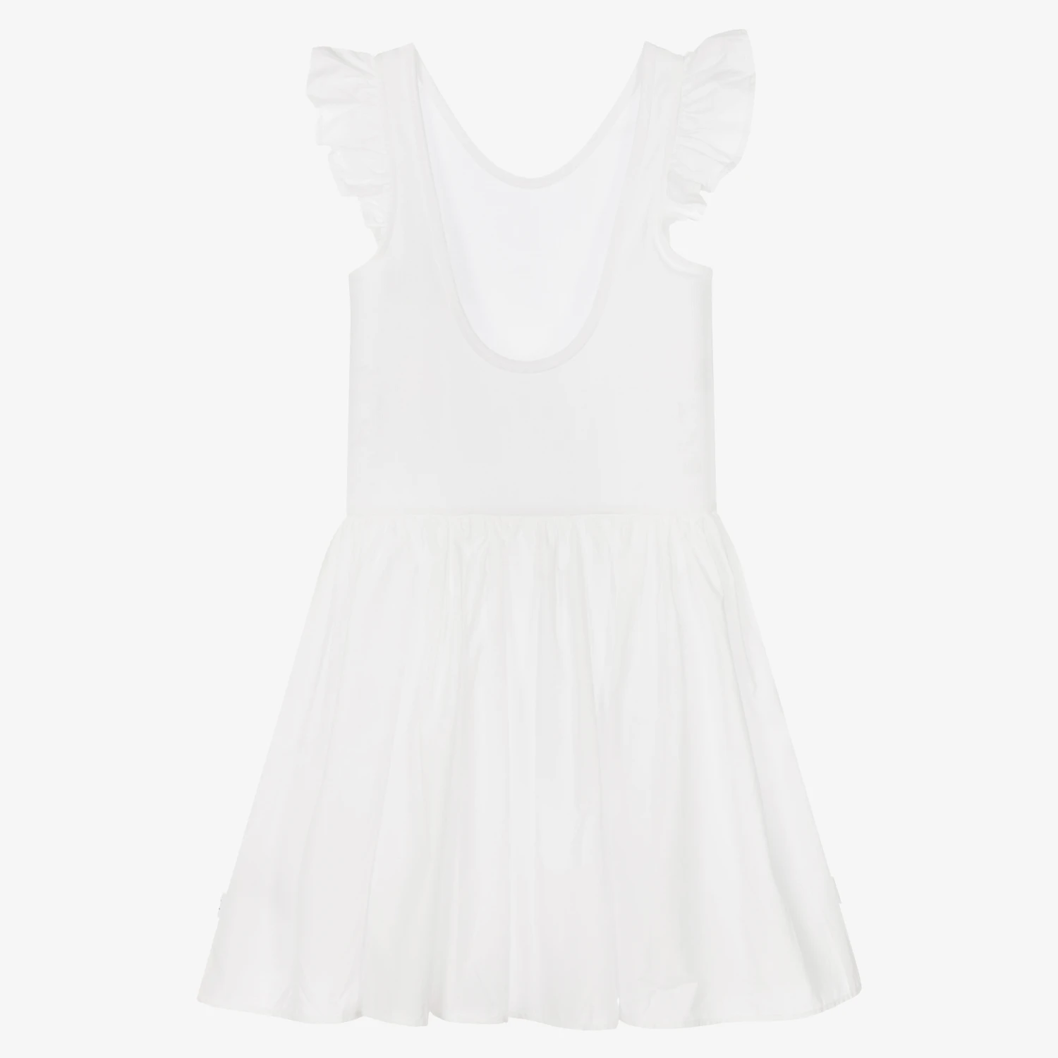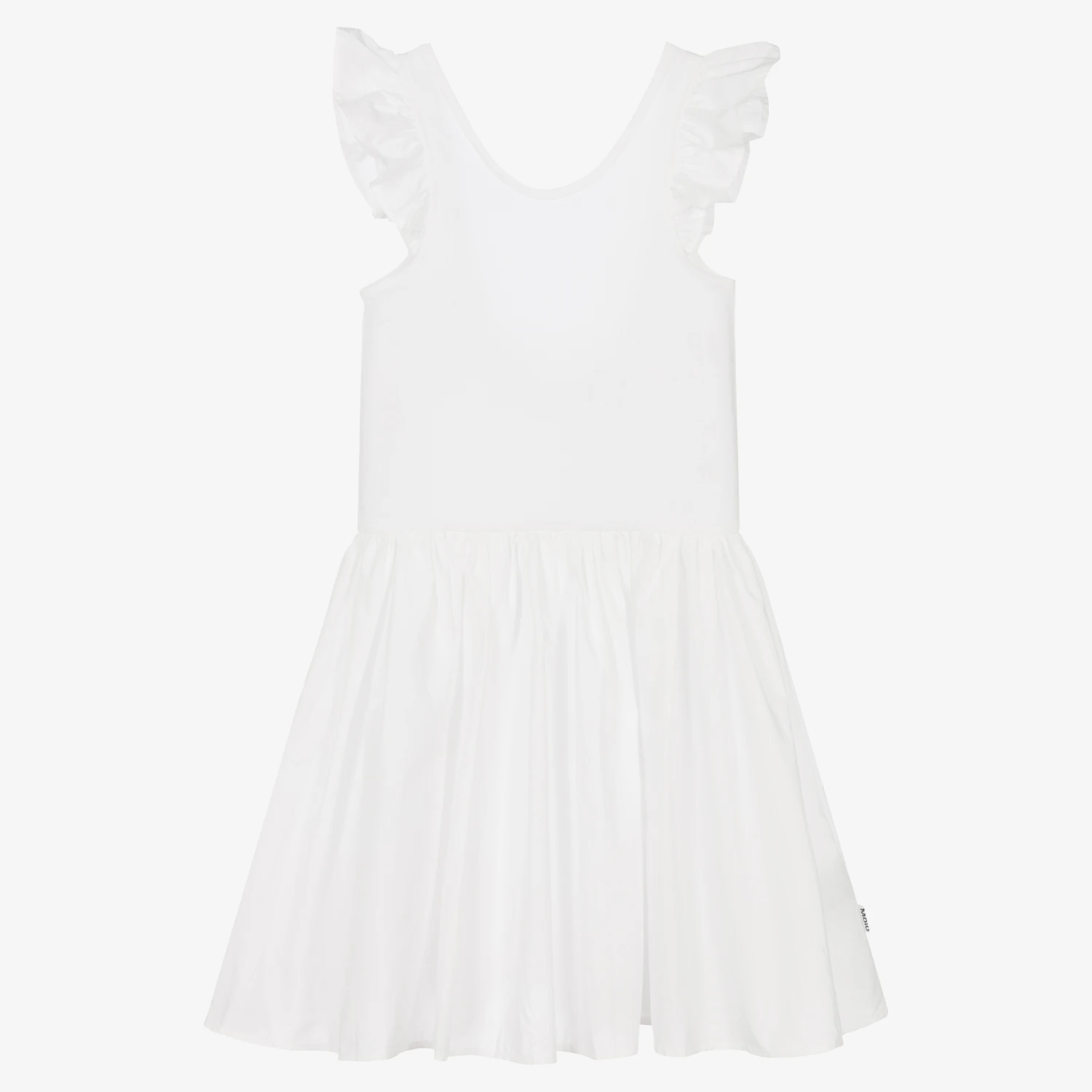 White dress for teen girls by Danish brand Molo, made with organic cotton. Comfortable and easy-to-wear, it has a soft ribbed jersey bodice with a scooped back and pretty poplin shoulder ruffles to match the full gathered skirt. There is a branded tab on the side seam for a discreet designer touch.