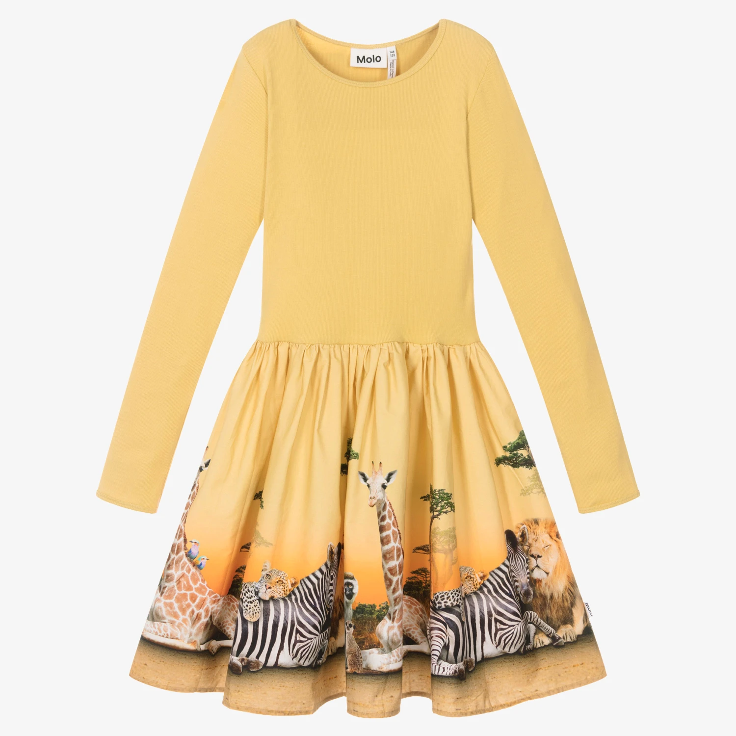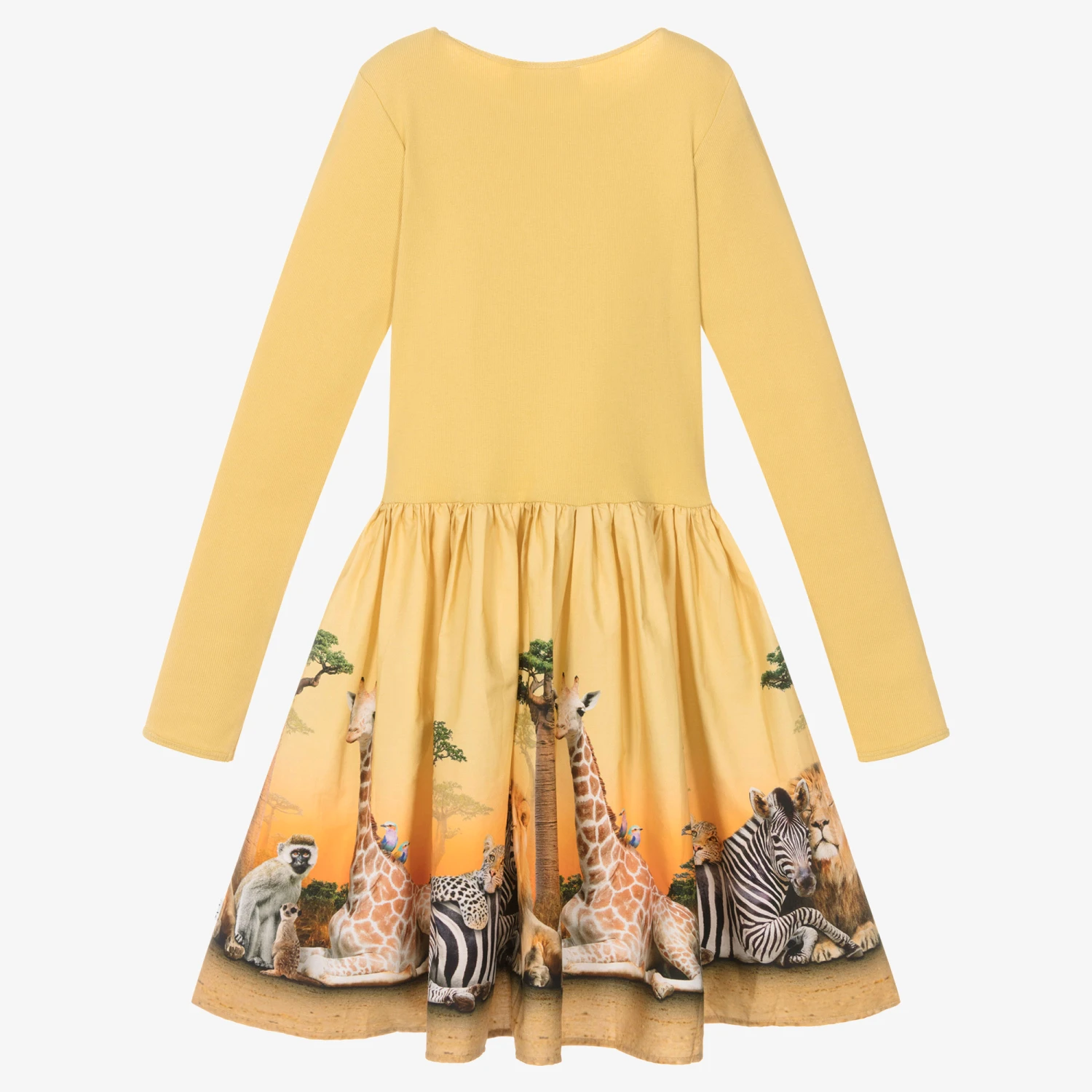 Mustard yellow dress for teen girls by Danish brand Molo, designed with an African savannah graphic print on the skirt. Made in organic cotton, the ribbed jersey bodice has full length sleeves and a relaxed scoop neck. The cotton poplin skirt adds dimension to this easy-to-wear dress.