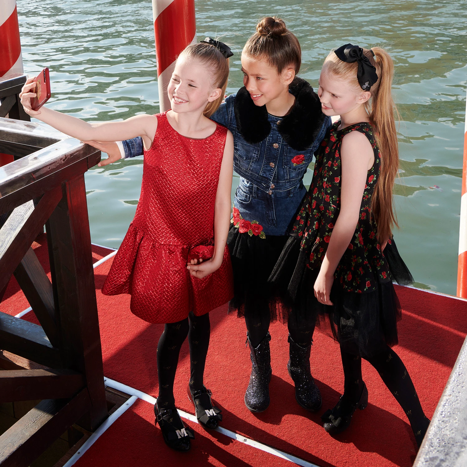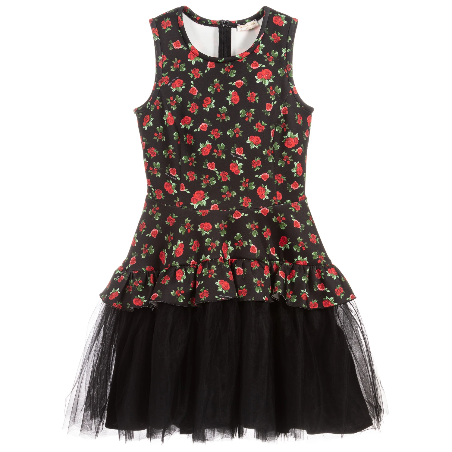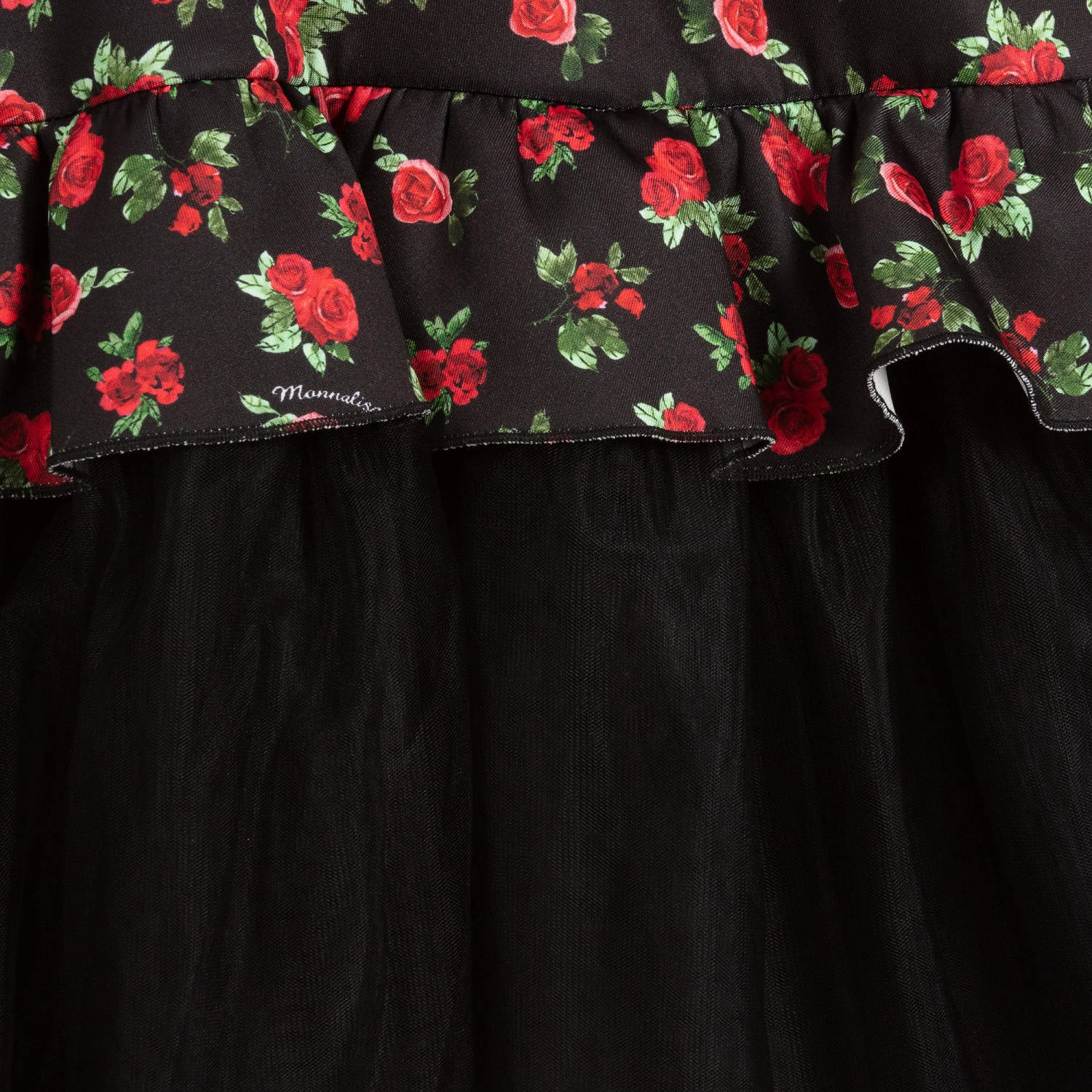 Girls stunning black dress from Monnalisa Chic, with a red and green rose pattern. The bodice is made in comfortable neoprene jersey, with soft layers of tulle on the skirt and a soft viscose lining.