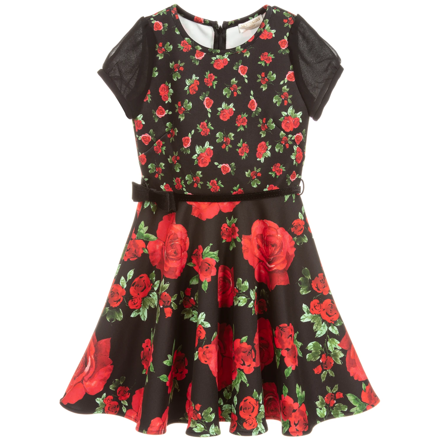 Girls luxury black fit and flare dress with red rose print from Monnalisa Chic. It is made in smooth and stretchy neoprene jersey with puffed sleeves in fine chiffon. It comes with an adjustable black velvet belt.