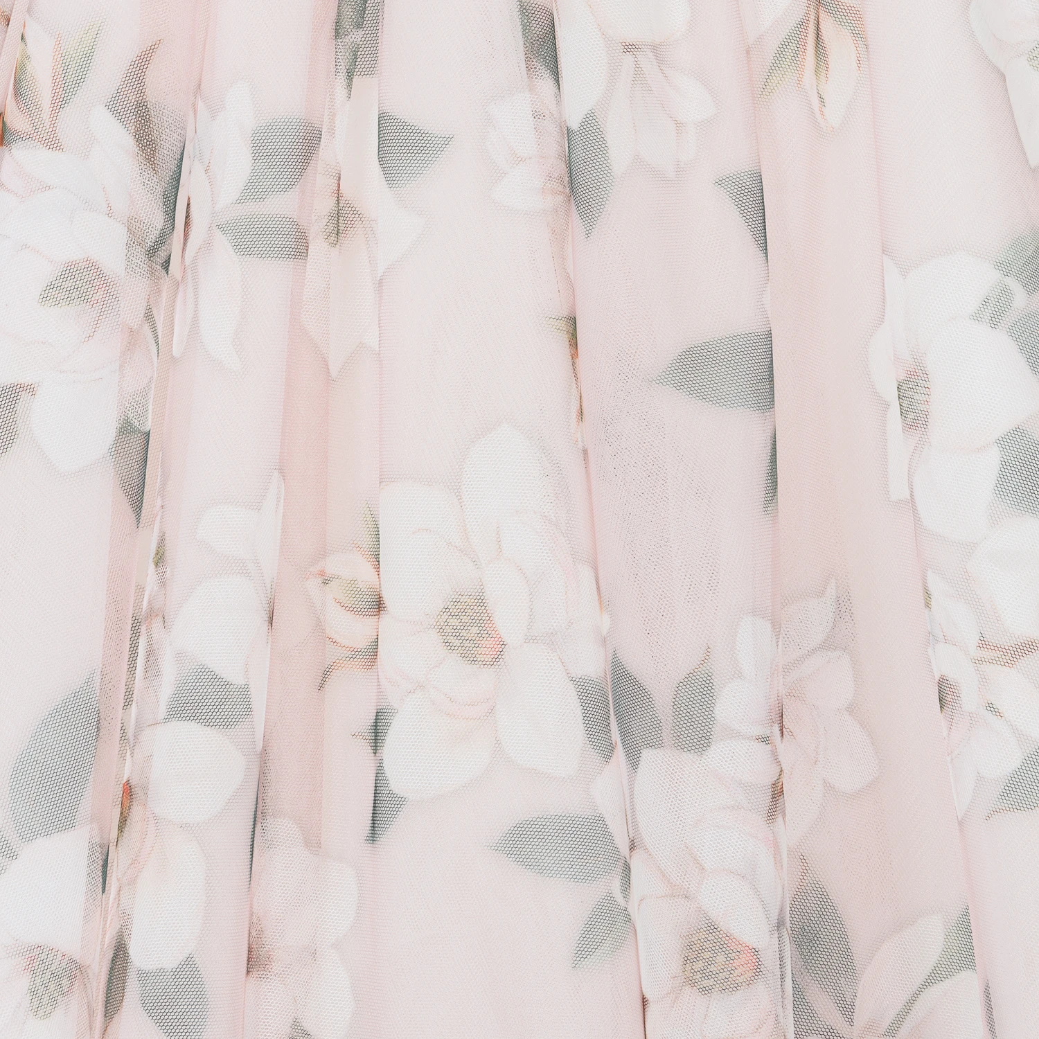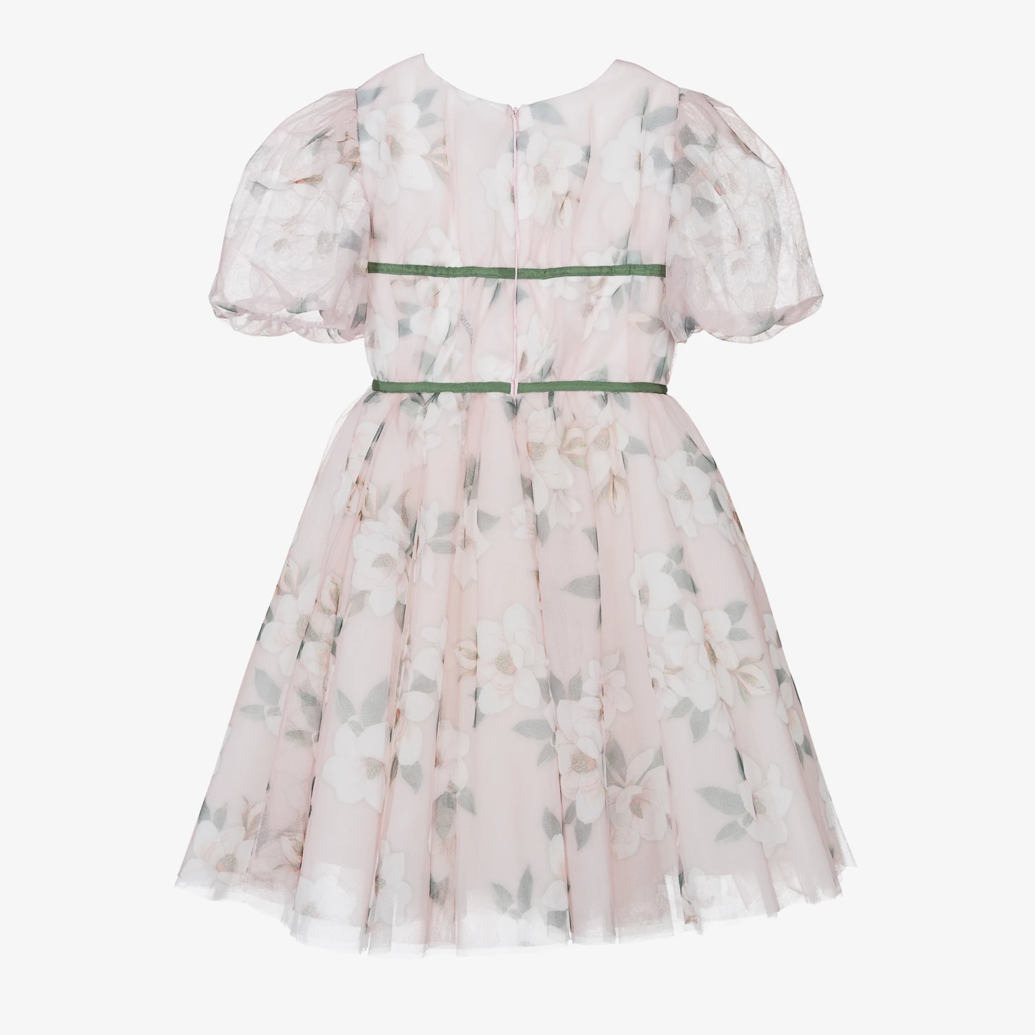 Teen girls pale pink tulle dress by Monnalisa. This elegant design for special occasions is made in soft tulle with an ivory and green floral print. There is a fitted bodice with puffed sheer short sleeves and a full gathered skirt with underskirts for volume and shape. The bodice is trimmed in green grosgrain with a bow in the centre. A concealed zip on the back creates an elegant finish.