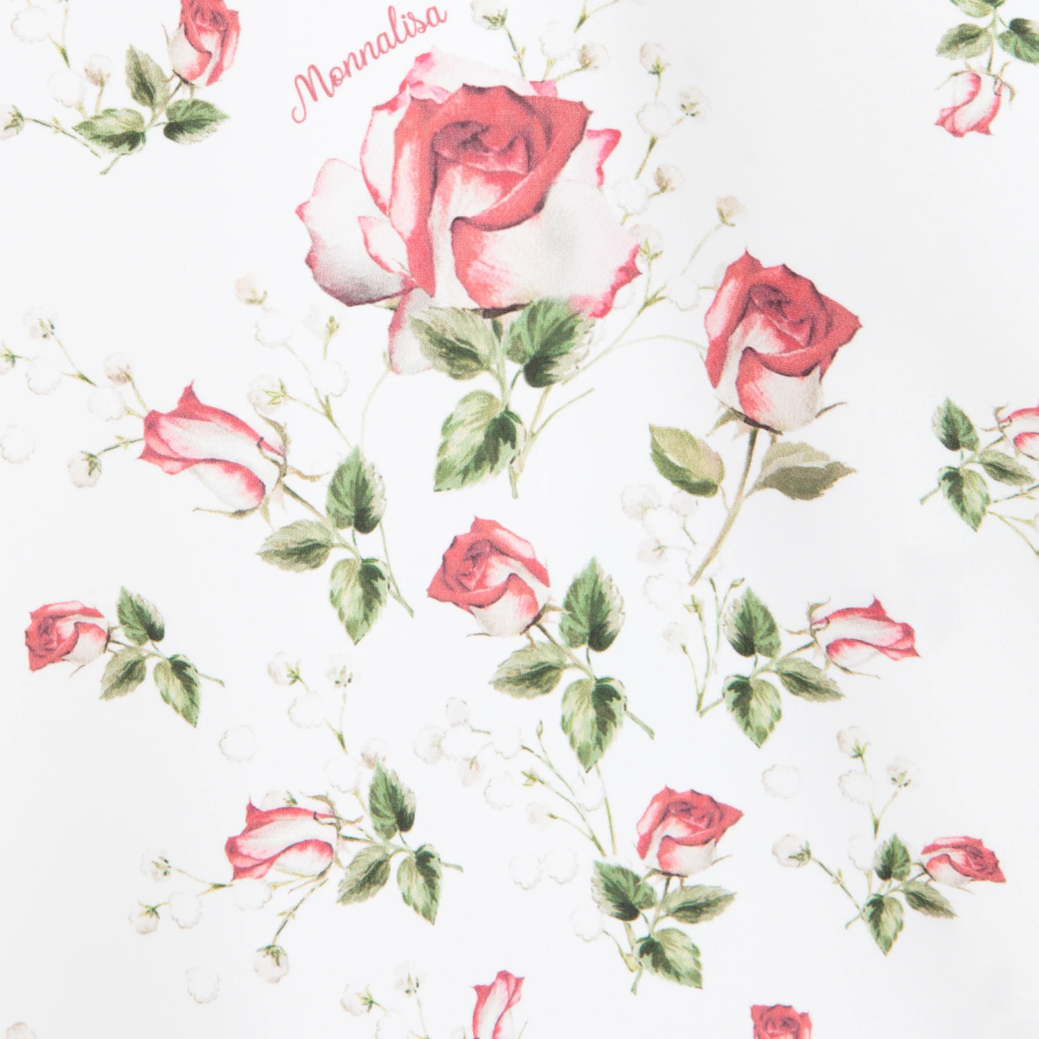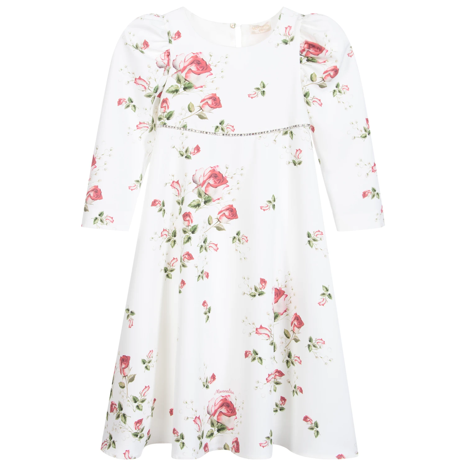 Ivory midi dress for teen girls by Monnalisa, with a red rose pattern. Made from soft crêpe, it has long puff sleeves and a lightweight cotton lining. There is sparkly diamanté trim on the bodice and a single button fastening on the back.