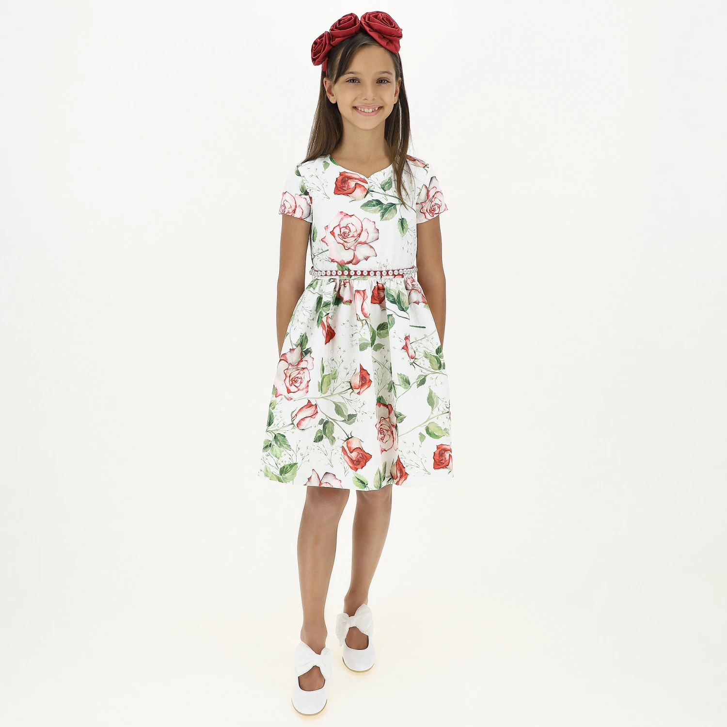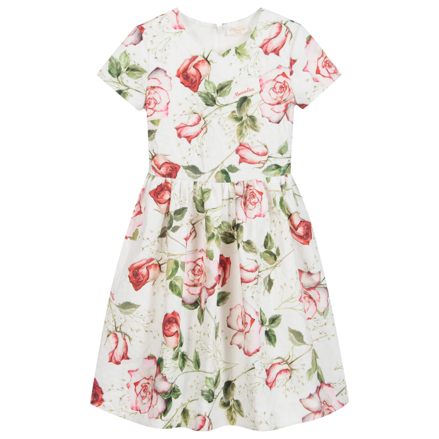 Teen girls ivory dress by Monnalisa Chic, with a beautiful red roses print. Made from soft shimmering polyester jacquard, it has a lightweight cotton lining and detachable red pearl belt. There is a classic sweetheart neckline and tulle underskirt, for added volume.