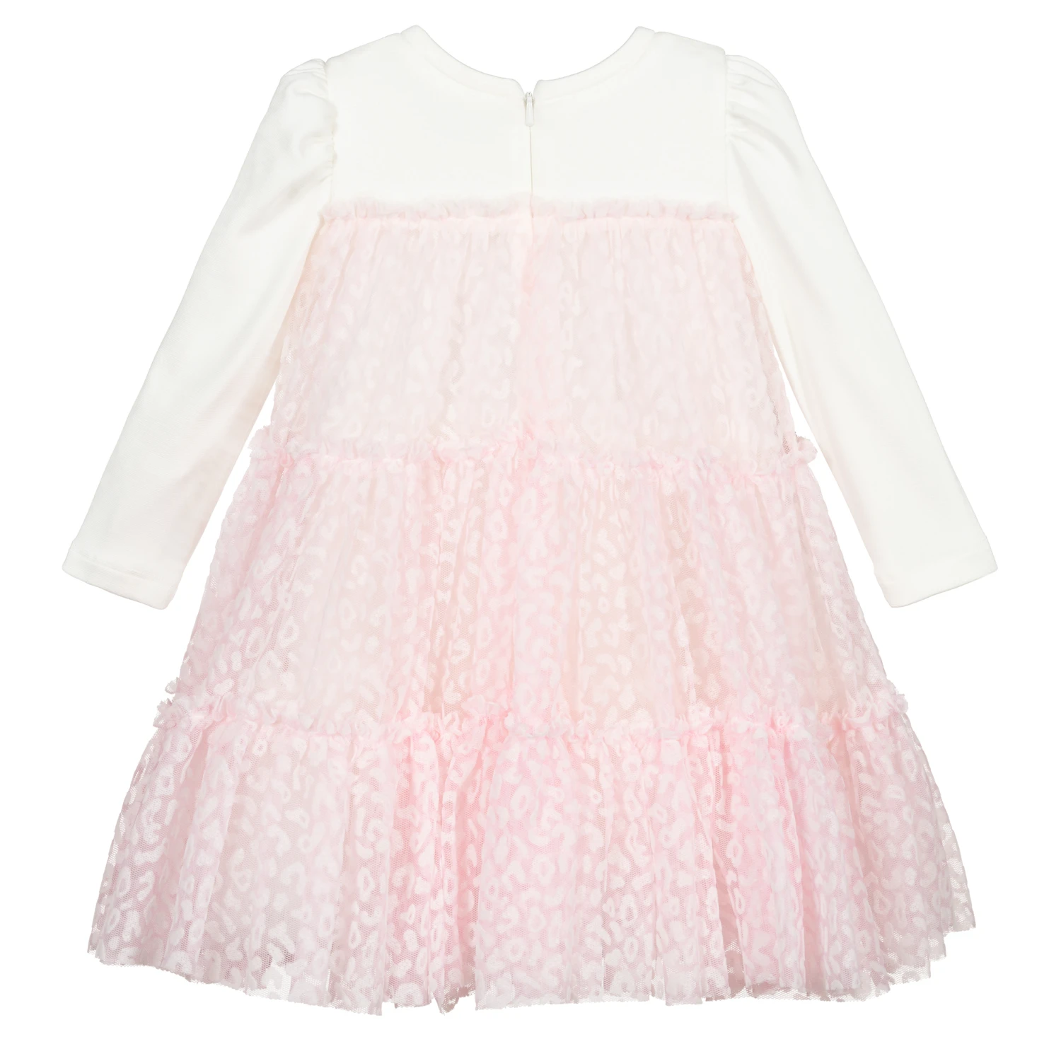 Younger girls ivory and pink tulle special occasion dress by Monnalisa. This pretty design has a jersey bodice, with long sleeves and sparkly diamanté logo. The overlay is made in soft pink patterned tulle, with an ivory tulle lining underneath. The dress is fully lined in soft viscose twill and there is a zip on the back to fasten.