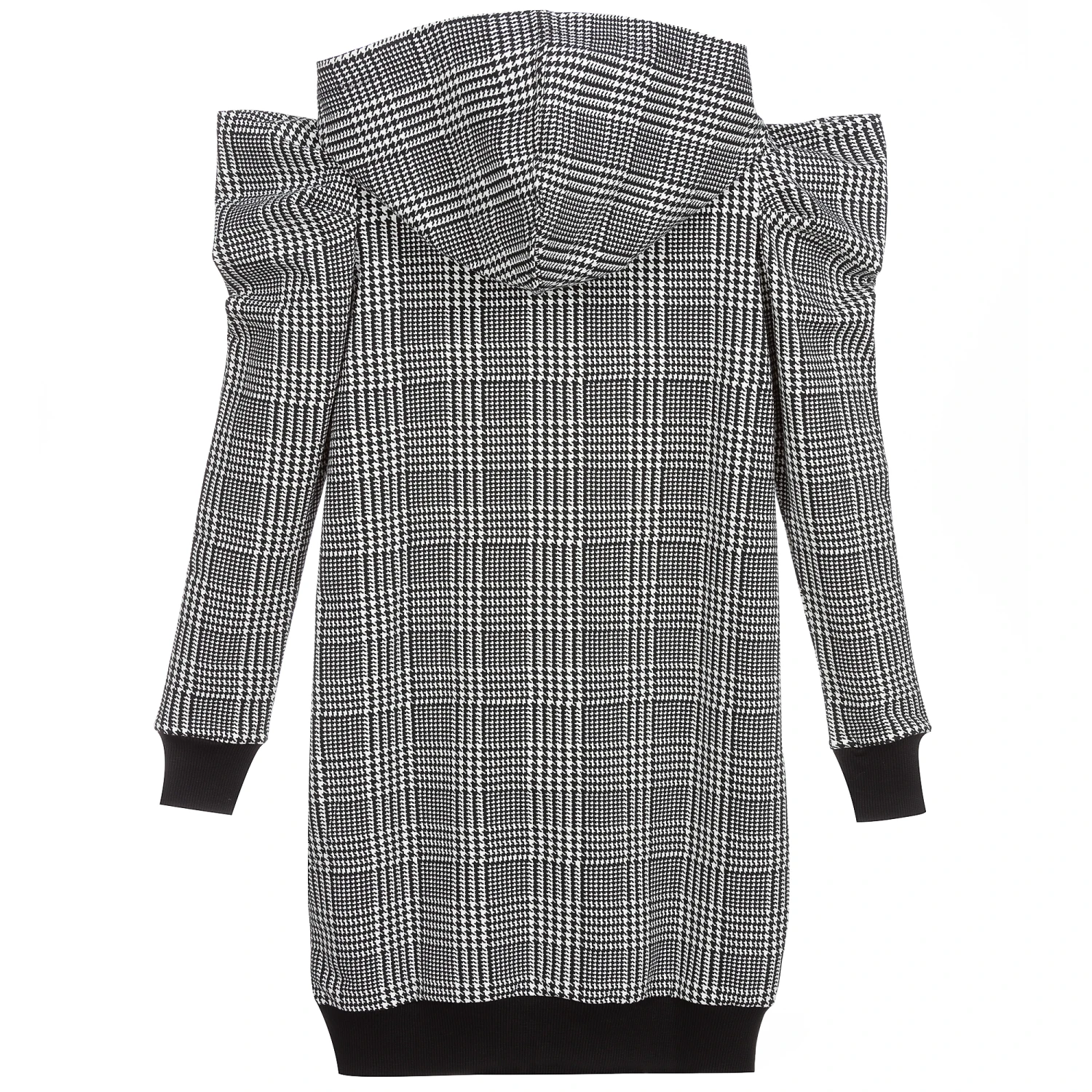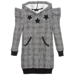 Teen girls black and white houndstooth dress by Monnalisa, made in soft and stretchy jersey. It has pointed shoulders, a hood and sparkling star appliqué. The pouch pocket on the front has ribbed trims.