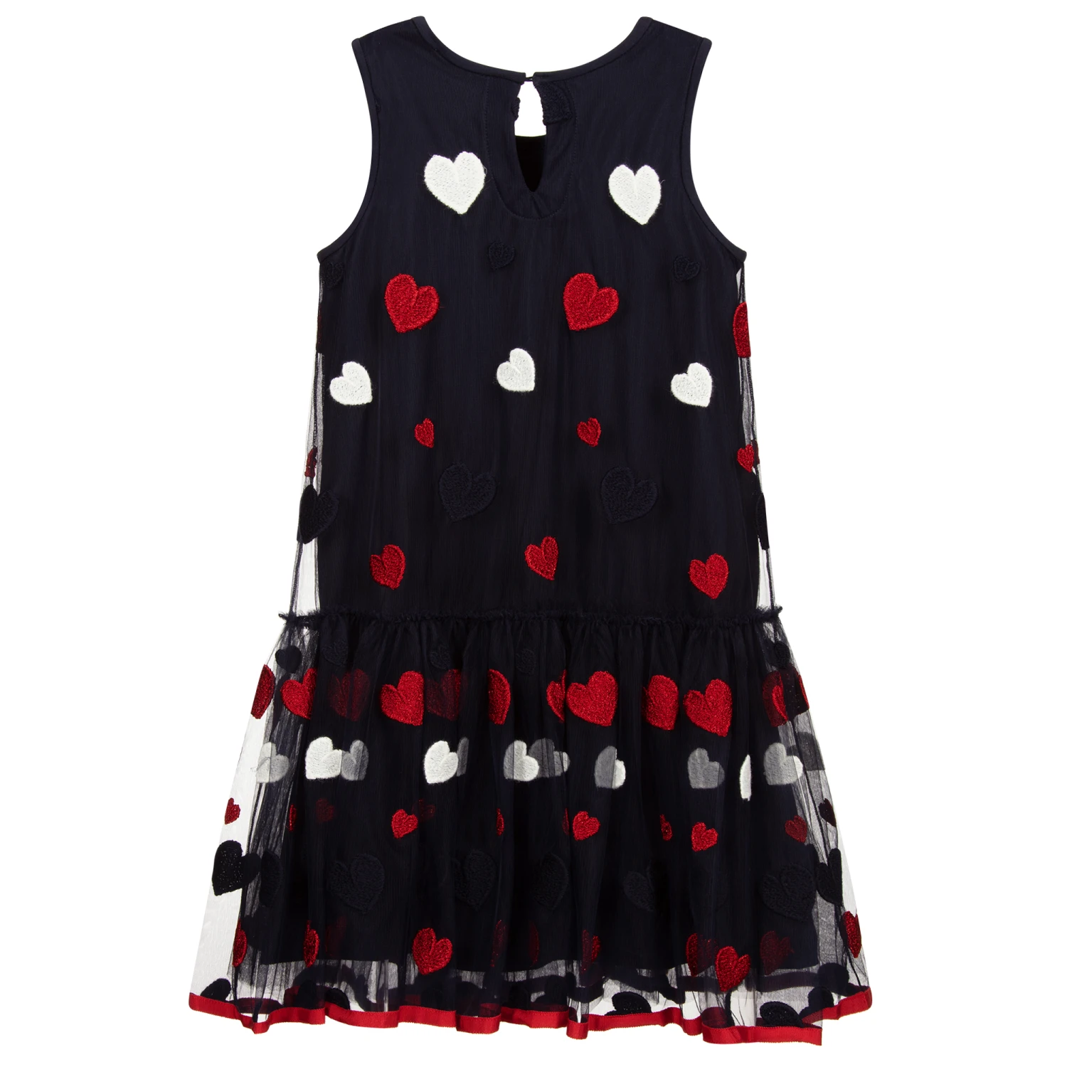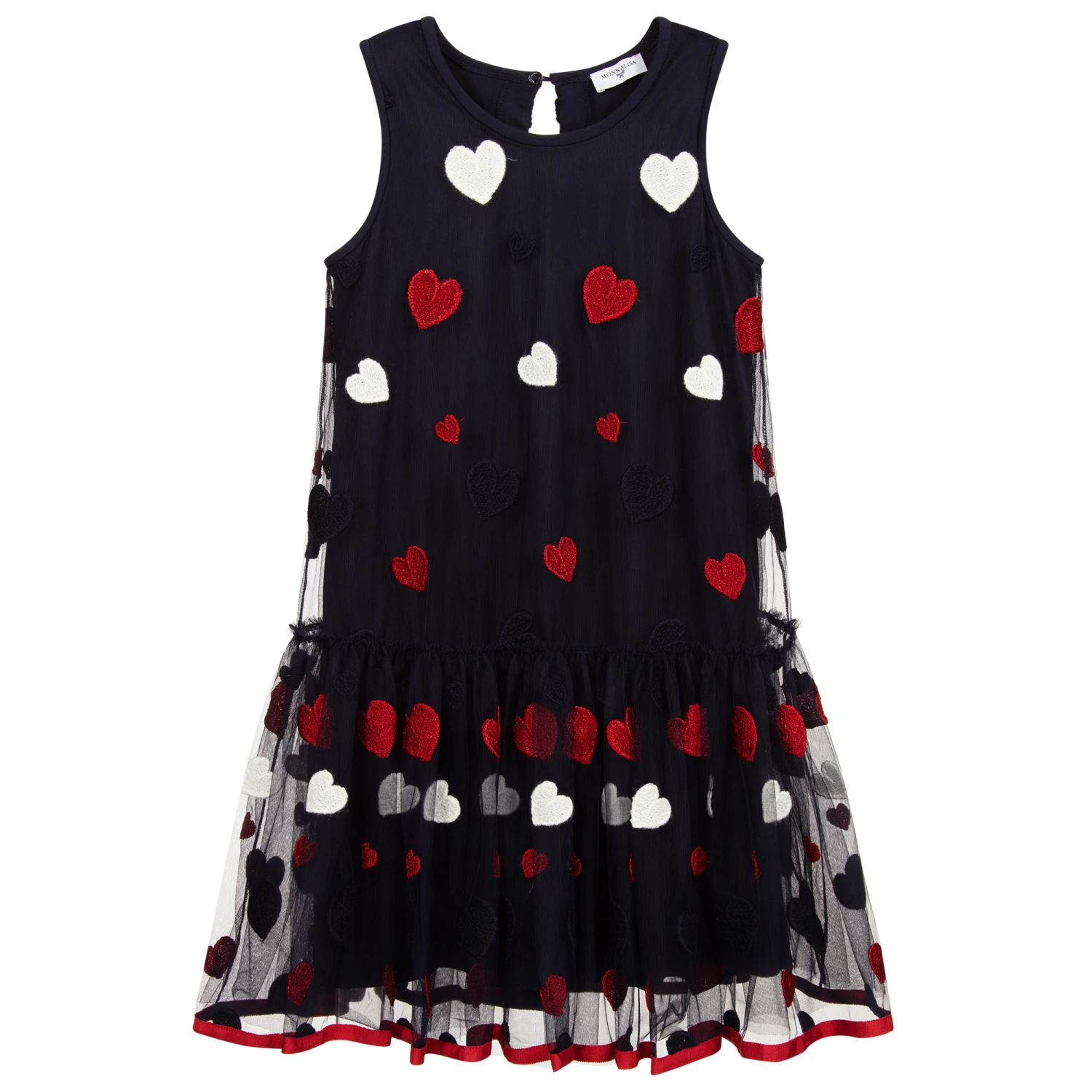 Teen girls navy blue dress by Italian designer Monnalisa. Made in soft cotton jersey, it has a tulle overlay patterned with knitted red and white hearts.