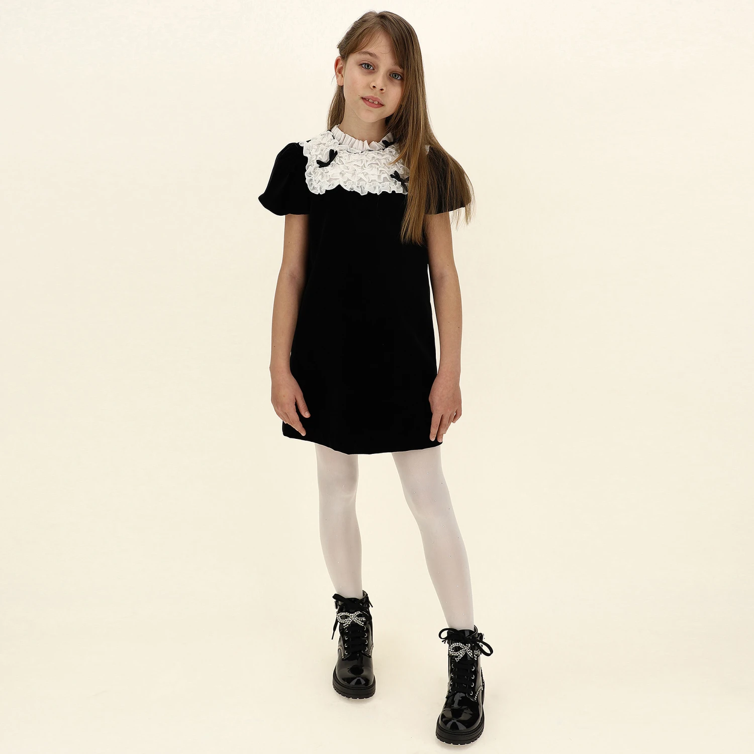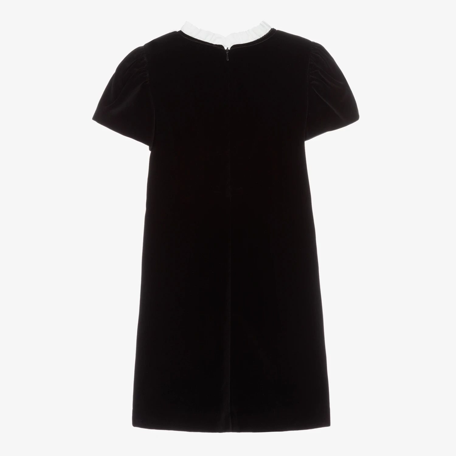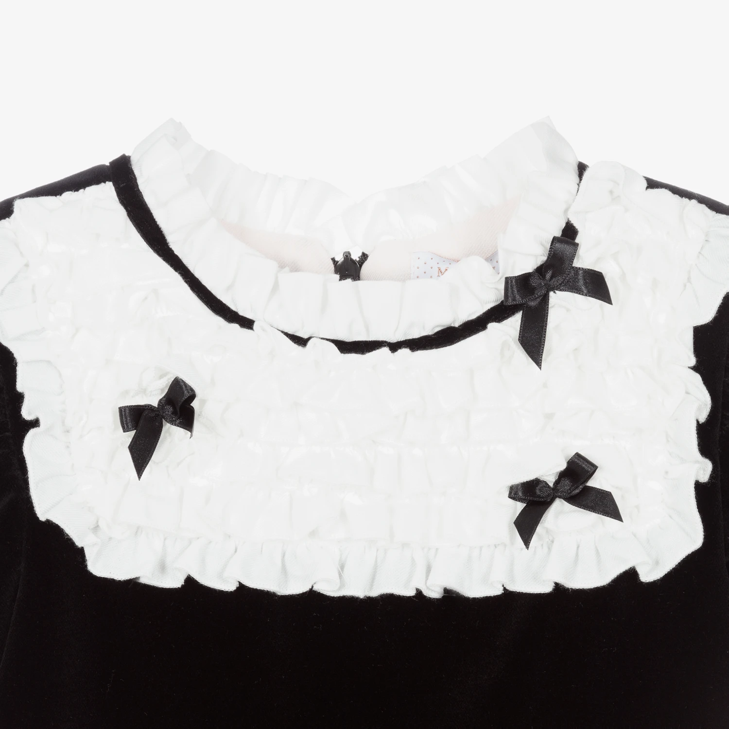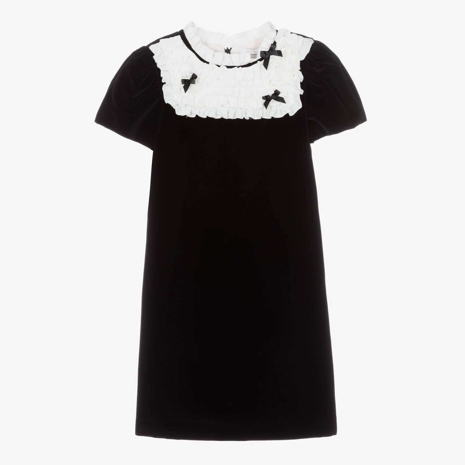 Black velvet dress for teen girls by Monnalisa. Beautifully soft with a lightweight lining, it has a white cotton collar and frilled panel on the chest, with black silky bow trims.