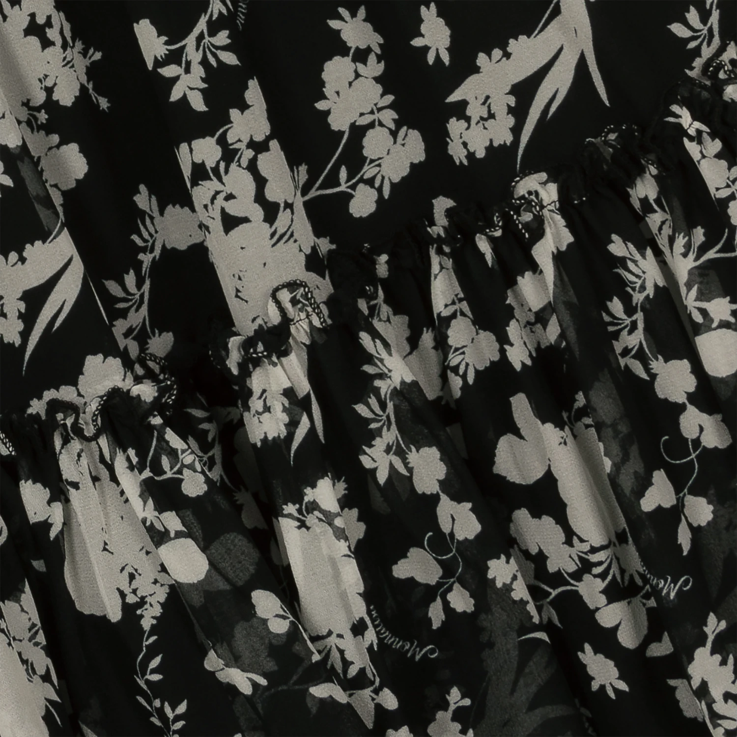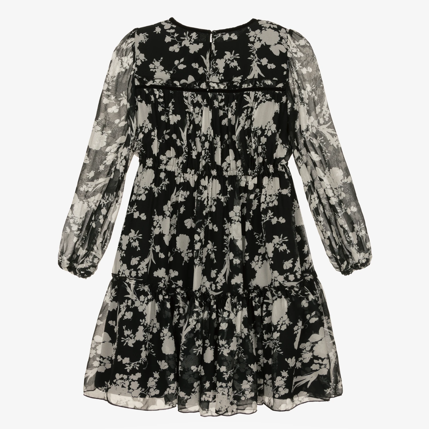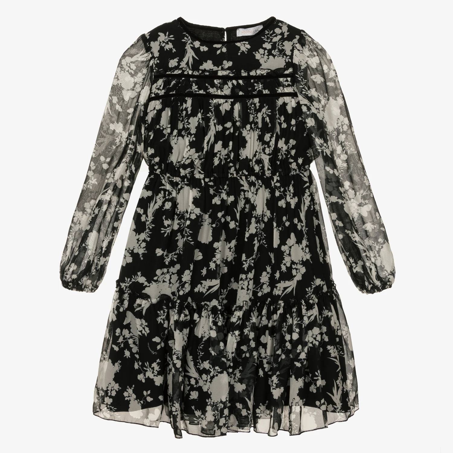 A black and white tiered dress for teen girls by Monnalisa, made in lightweight georgette. An elegant design, it has an all-over floral print with a subtle logo script and black glittery trims for a touch of sparkle. Fully lined, it has long sheer sleeves, an elasticated waist and cuffs, with velvet trimmed ruffle detailing on the chest. There is a single button fastening on the back of the neck for a simple finish.