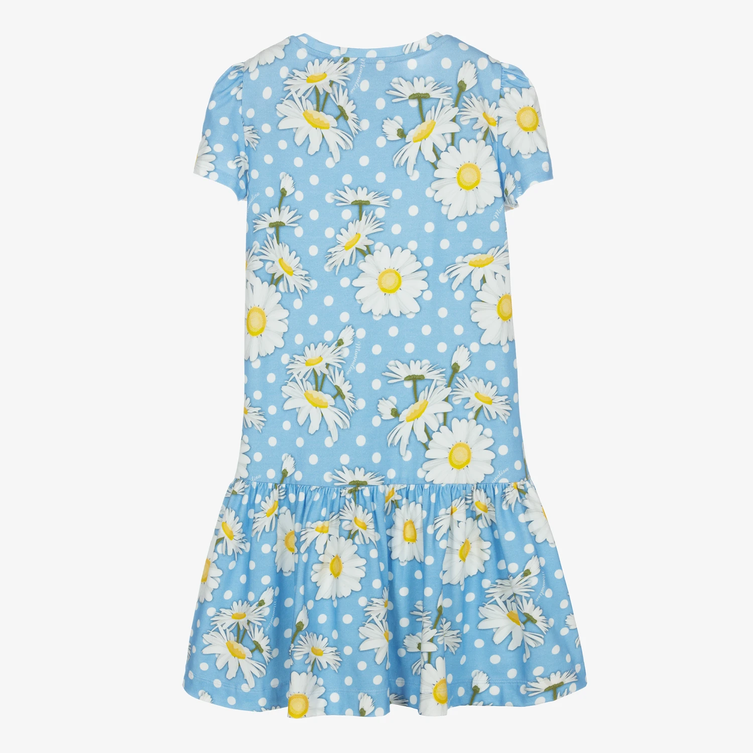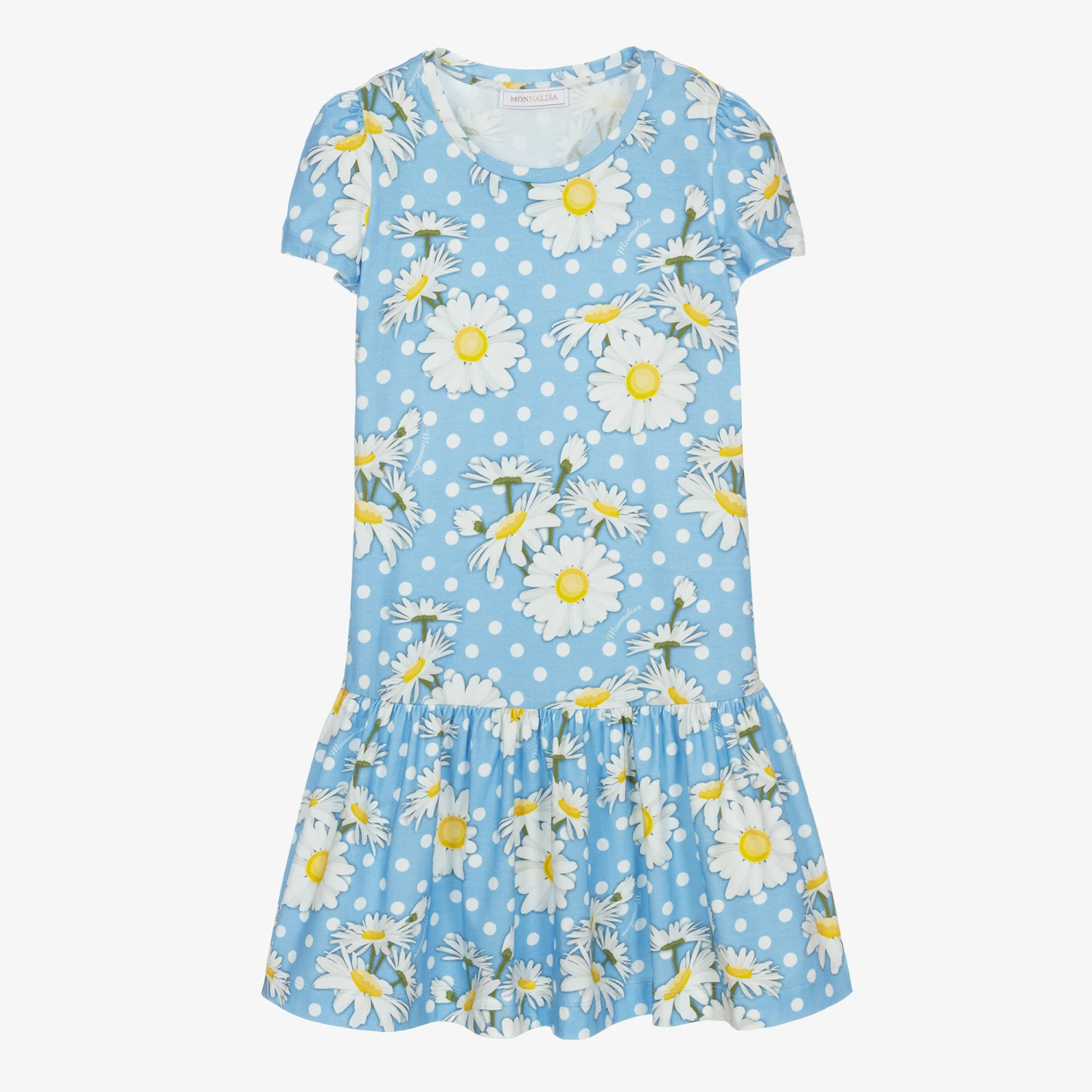 Blue and white dress for teen girls by Italian designer Monnalisa, made in lightweight jersey. It is patterned with white daisies and polka dots, with the brand’s logo, and has pretty puffed sleeves.
